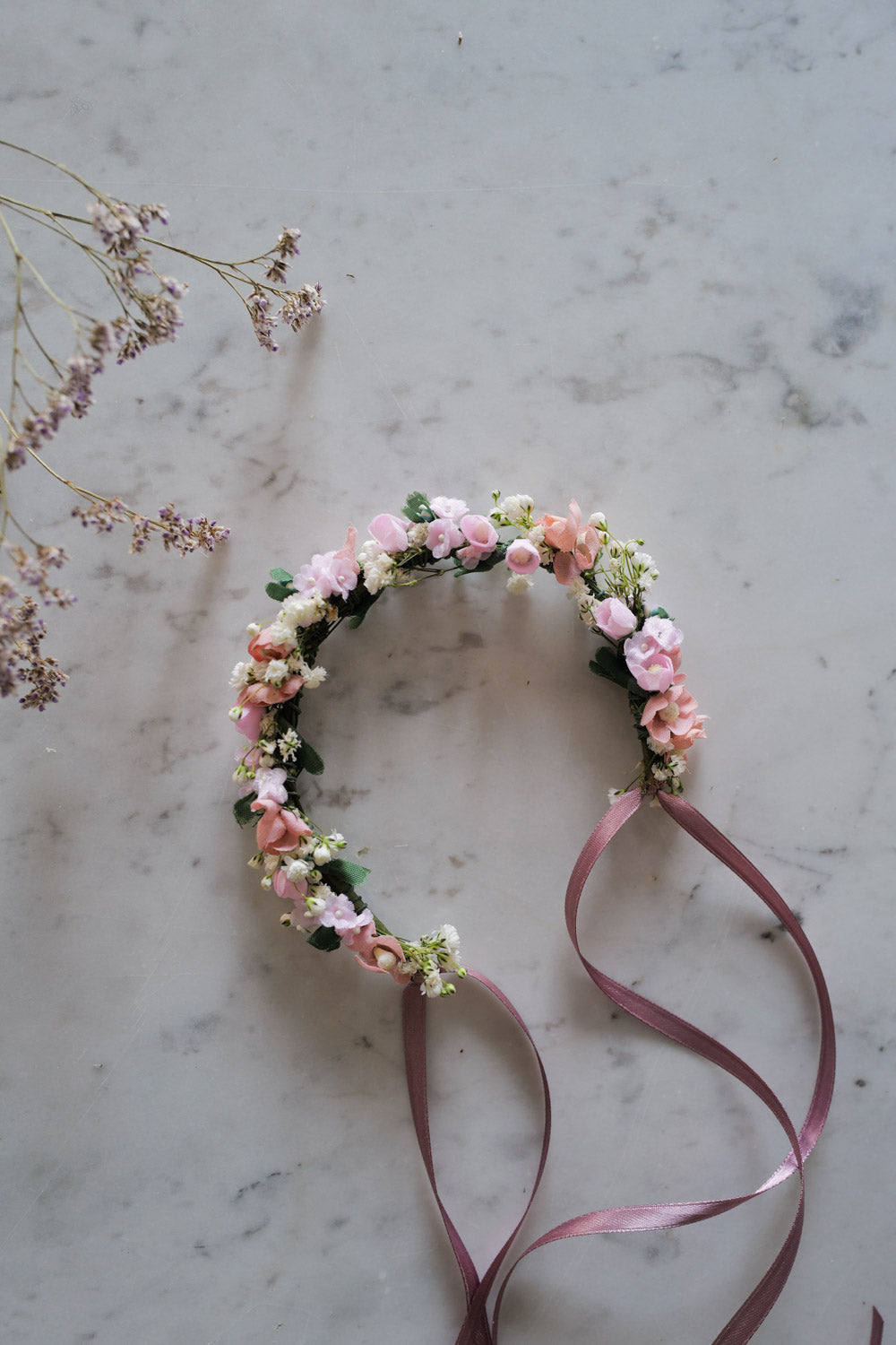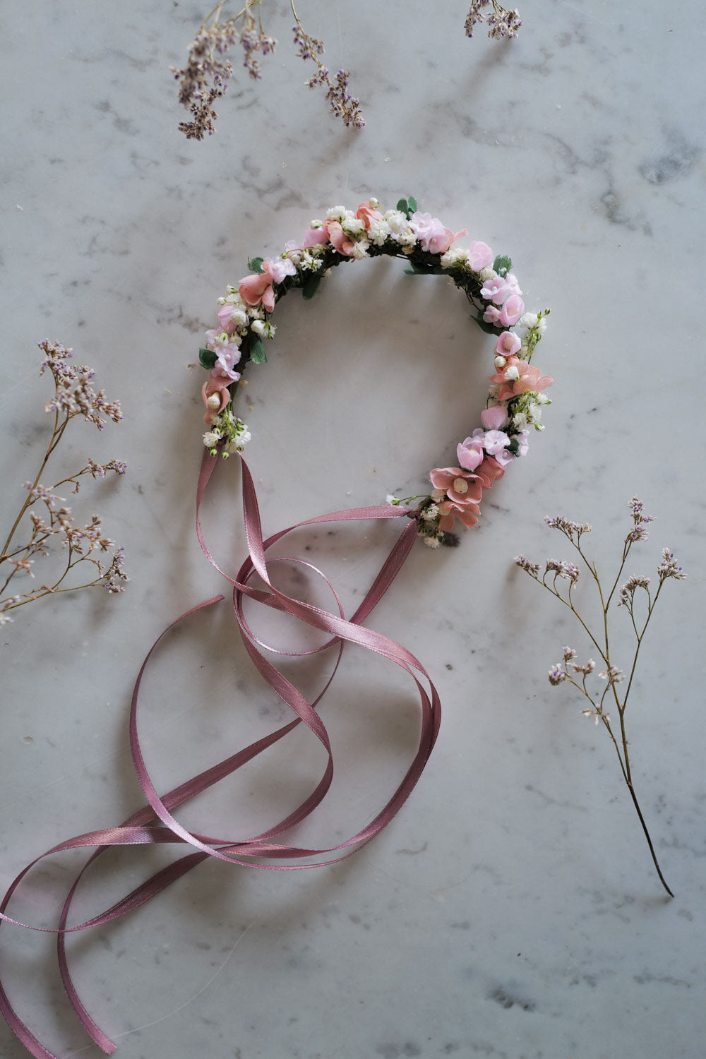 Blumenkrone aus Vintage Seidenblumen - aus den 50er bis 80er Jahren - sowie everlasting dried & preserved Flowers.