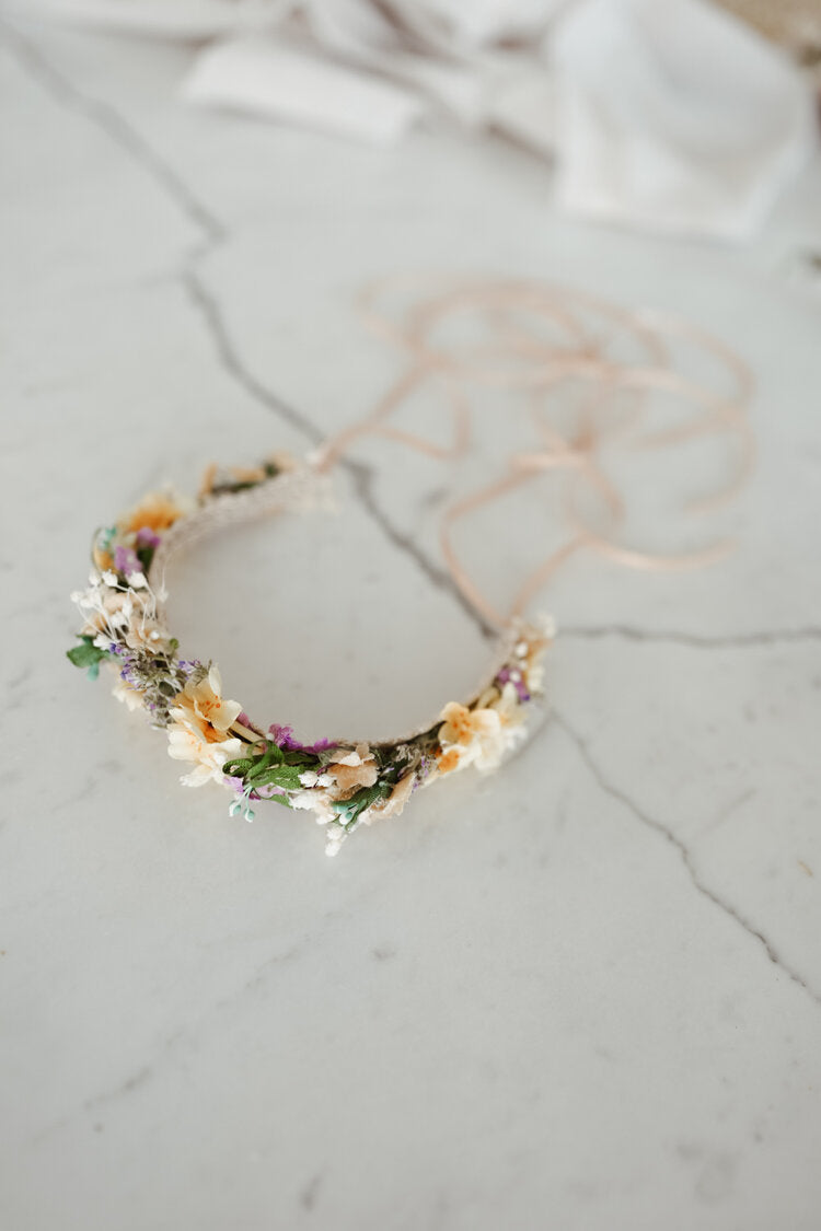 Blumenkrone aus Vintage Seidenblumen - aus den 50er bis 80er Jahren - sowie everlasting dried & preserved Flowers.
