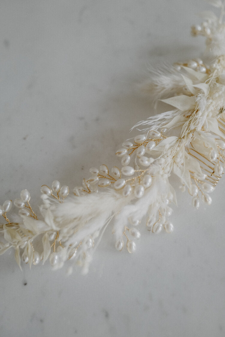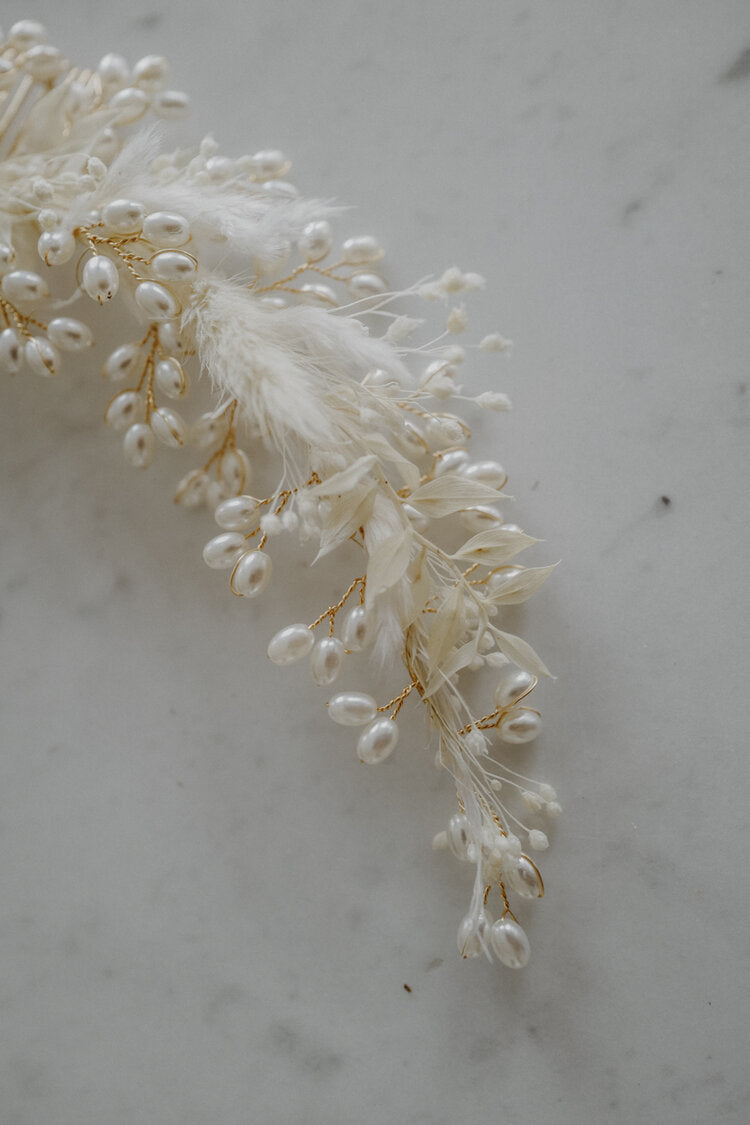 Elisabeth ist ein zartes Headpiece für romantische Brides. Handverziert in Wien mit hochwertigen Dried Flowers - so hält es ein Leben lang.