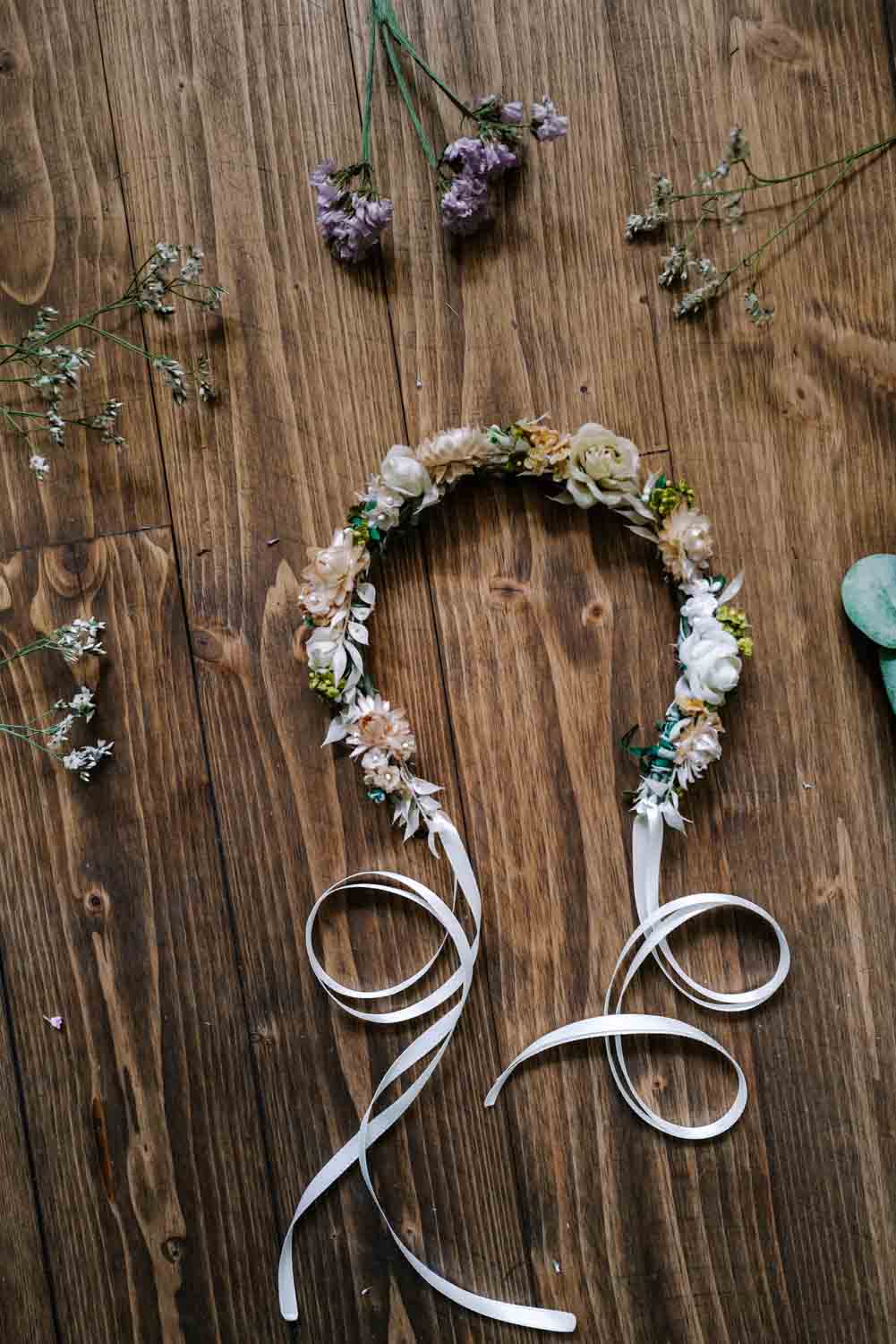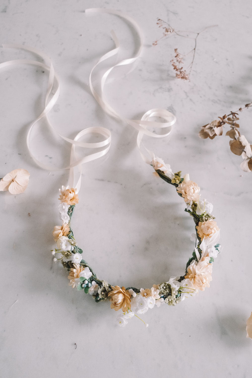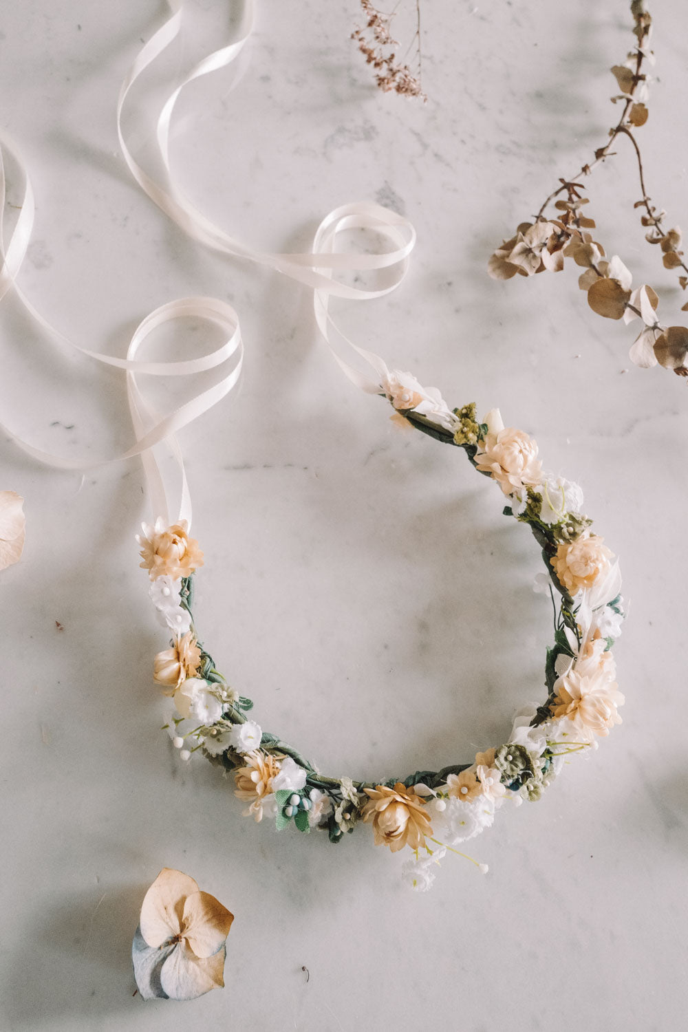 Flowercrown Gabrielle ist eine romantische Blumenkrone für die Ewigkeit die niemals verblüht. Handgemacht in Wien aus Vintage Seidenblumen & und Dried Flowers im Wiener Atelier von We Are Flowergirls.