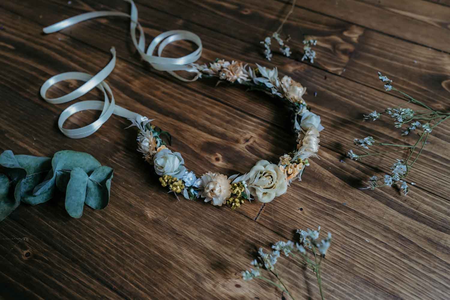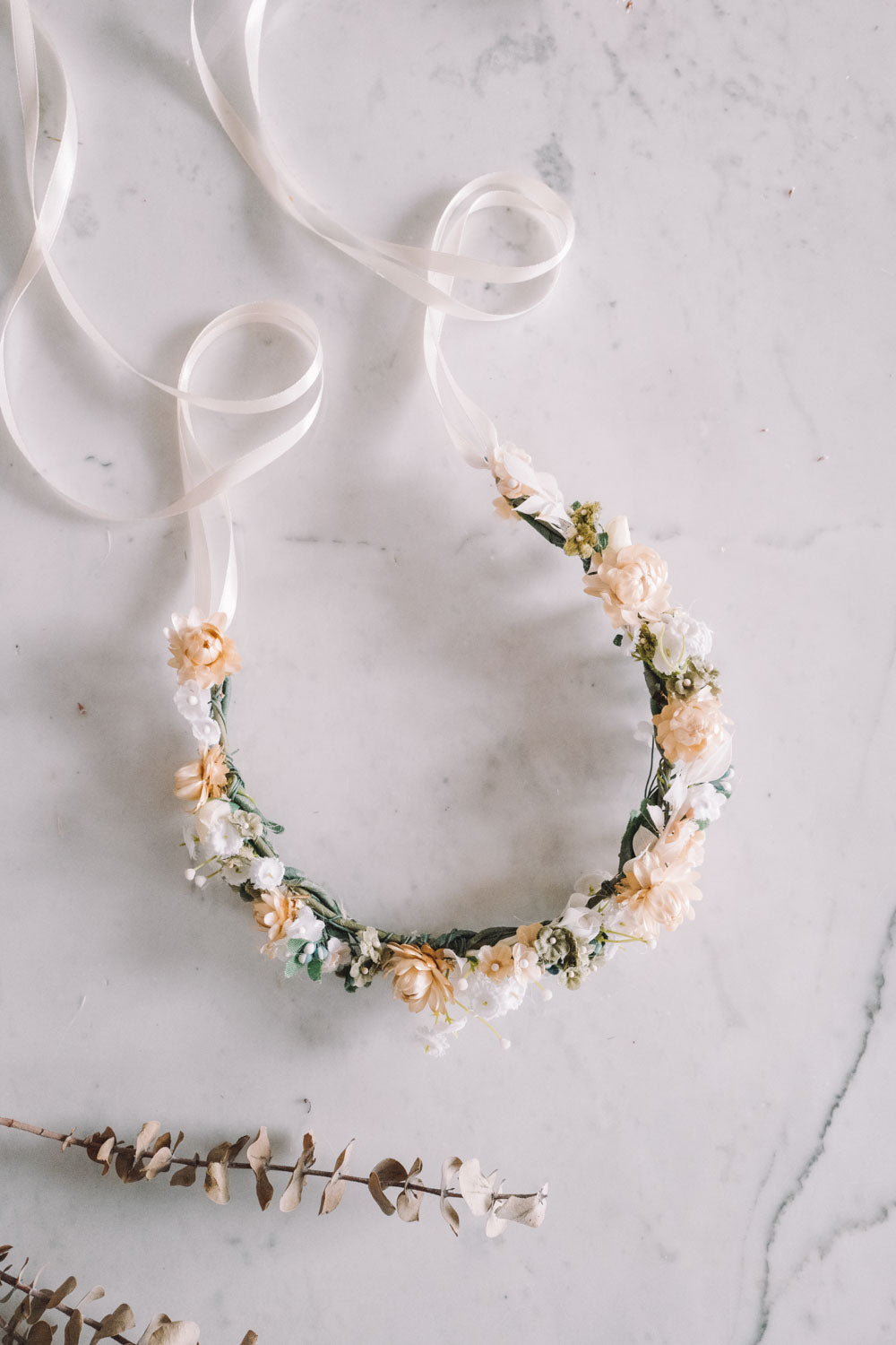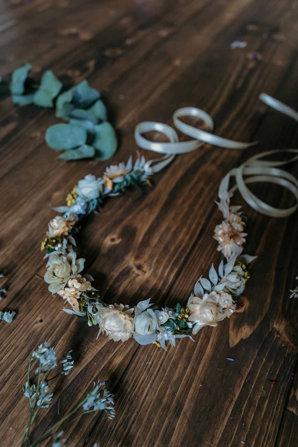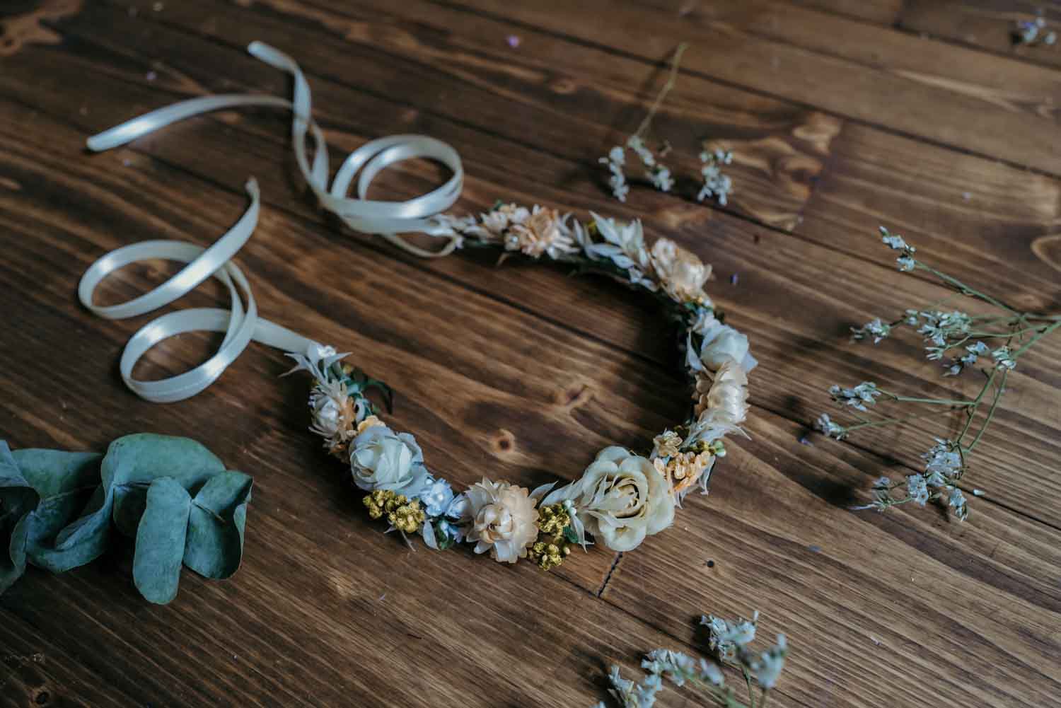 Flowercrown Gabrielle ist eine romantische Blumenkrone für die Ewigkeit die niemals verblüht. Handgemacht in Wien aus Vintage Seidenblumen & und Dried Flowers im Wiener Atelier von We Are Flowergirls.