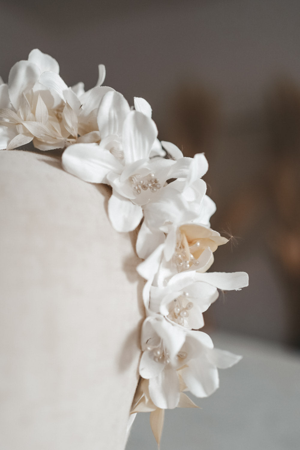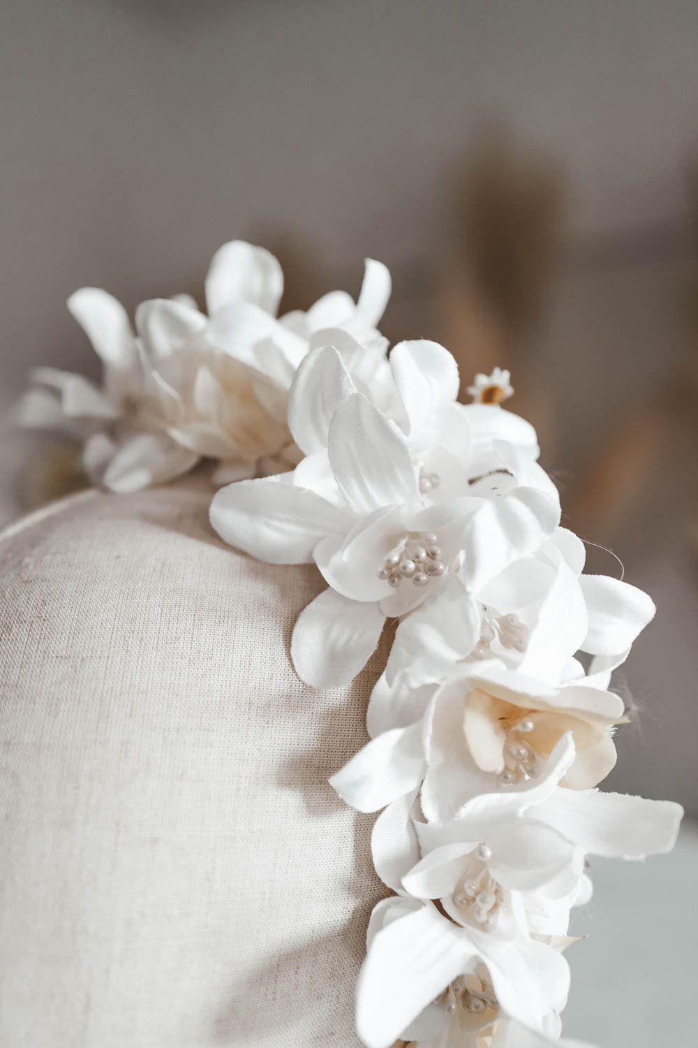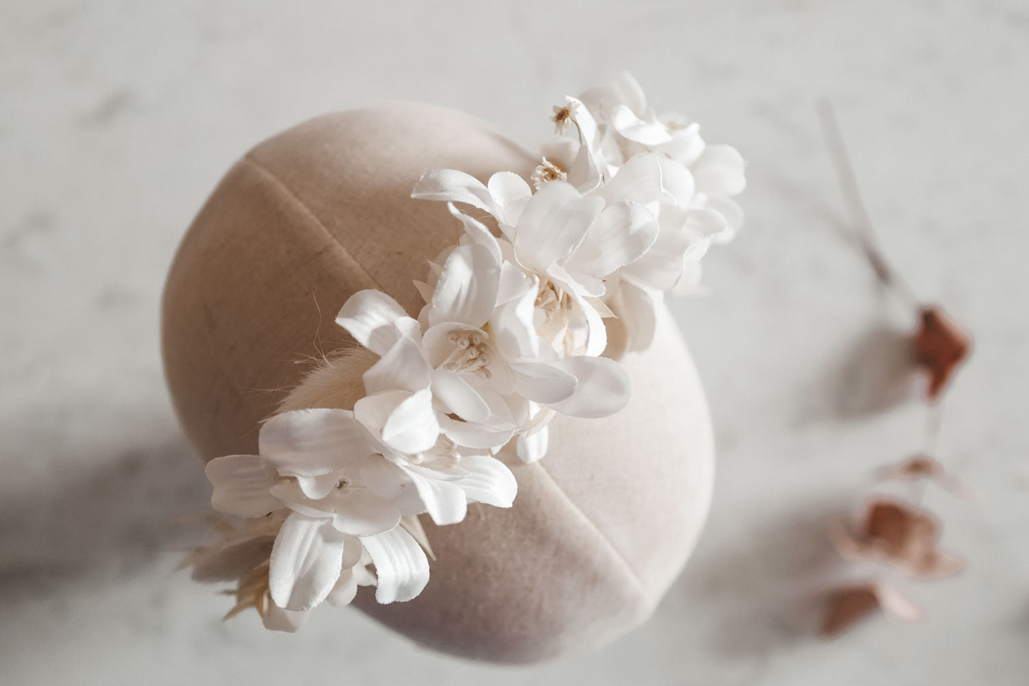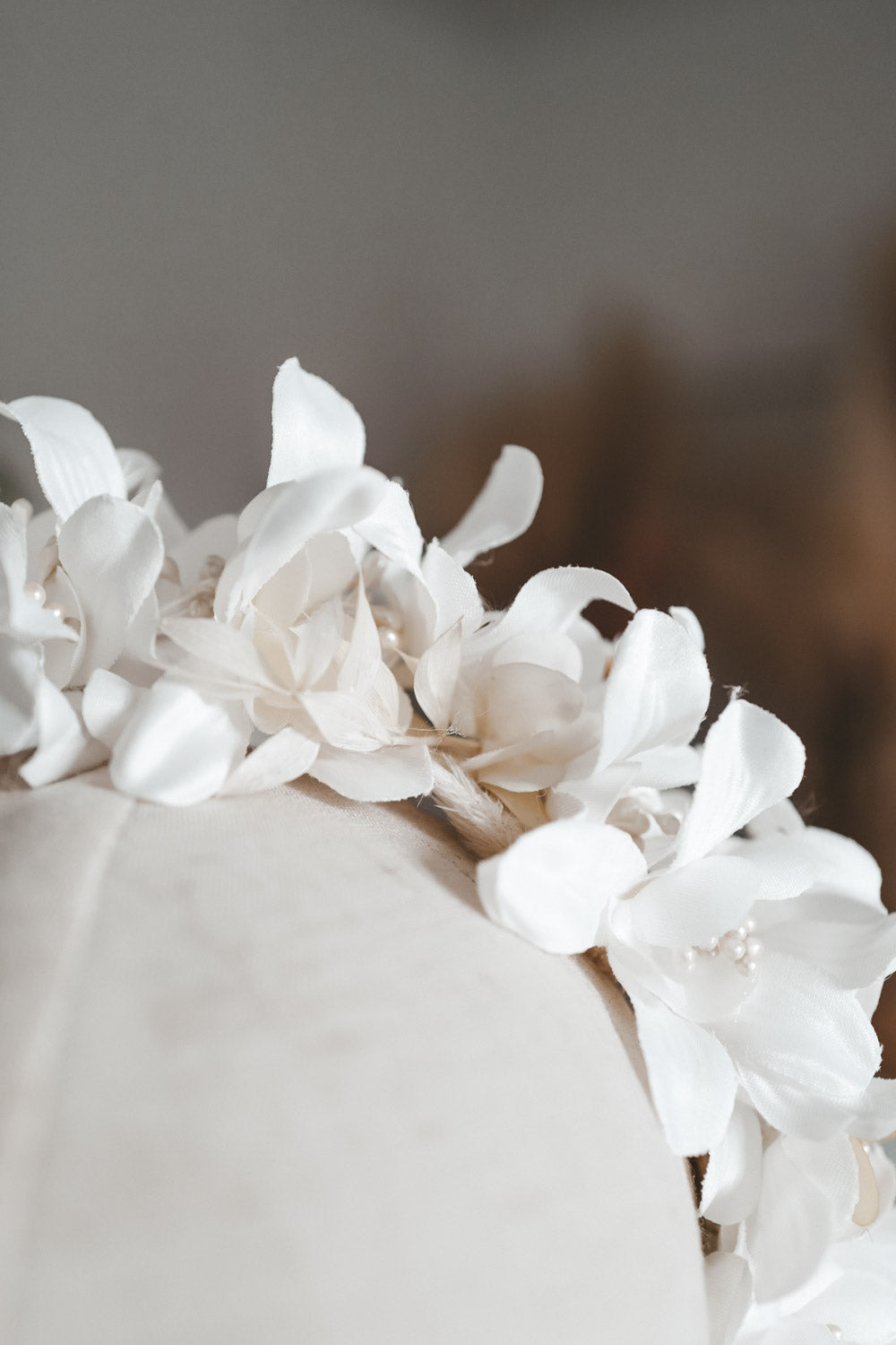 Unser handgemachter Haarreifen White Flowers ist mit Seidenblumen und Dried Flowers besetzt. Die opulente Krone ist auf einem Haarreifen montiert und leicht seitlich zu tragen. Der perfekte Eye-Catcher für deinen Trau-Hochzeitslook.