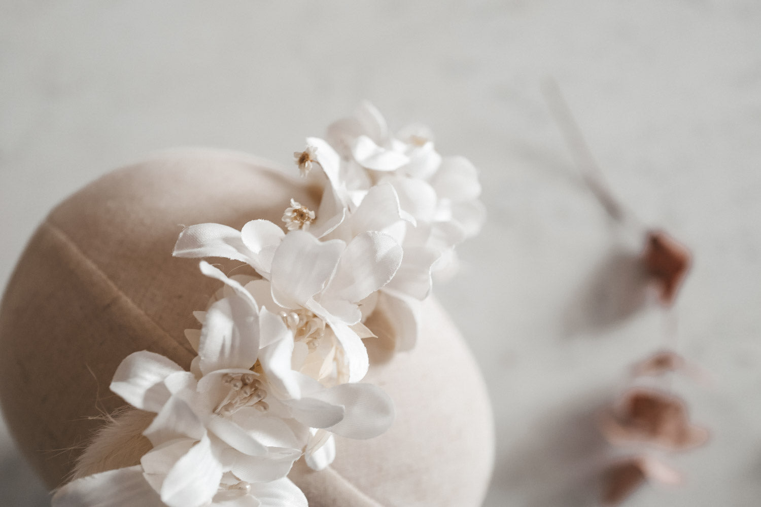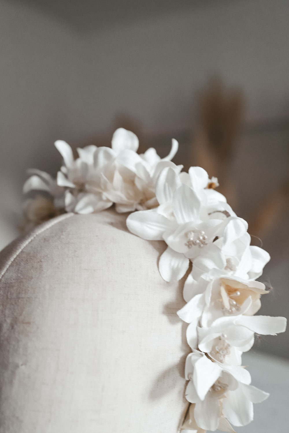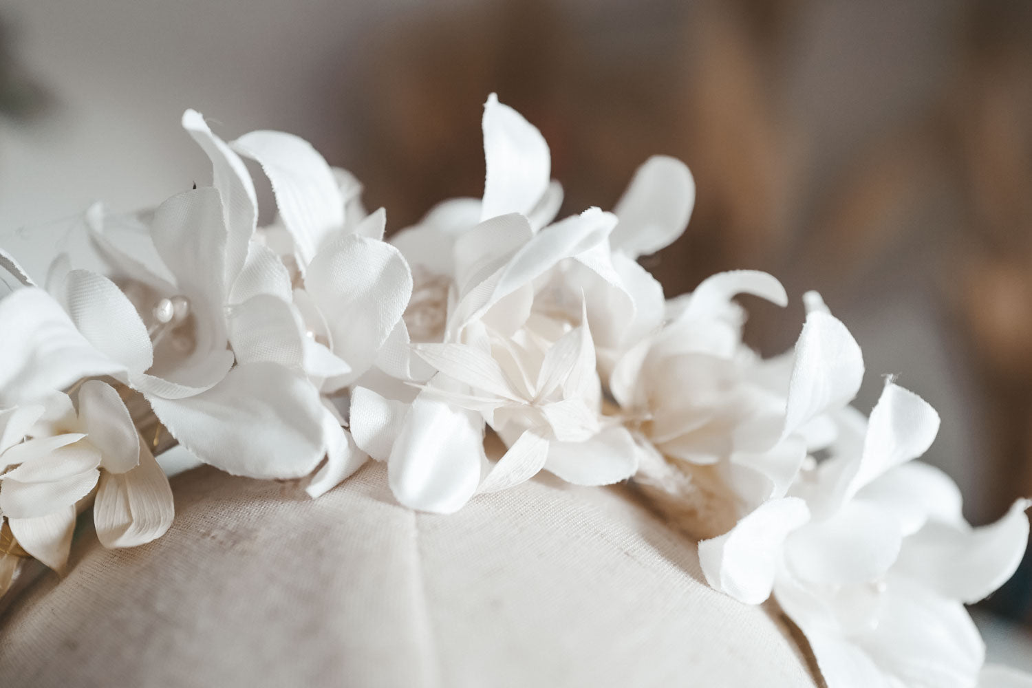 Unser handgemachter Haarreifen White Flowers ist mit Seidenblumen und Dried Flowers besetzt. Die opulente Krone ist auf einem Haarreifen montiert und leicht seitlich zu tragen. Der perfekte Eye-Catcher für deinen Trau-Hochzeitslook.