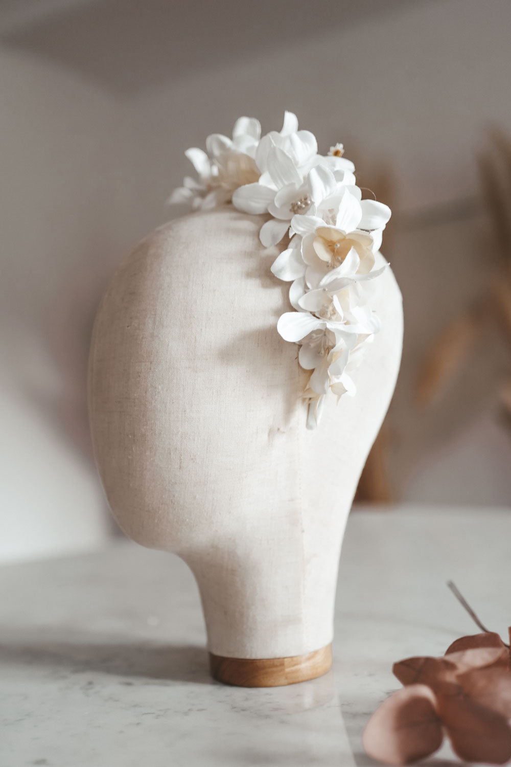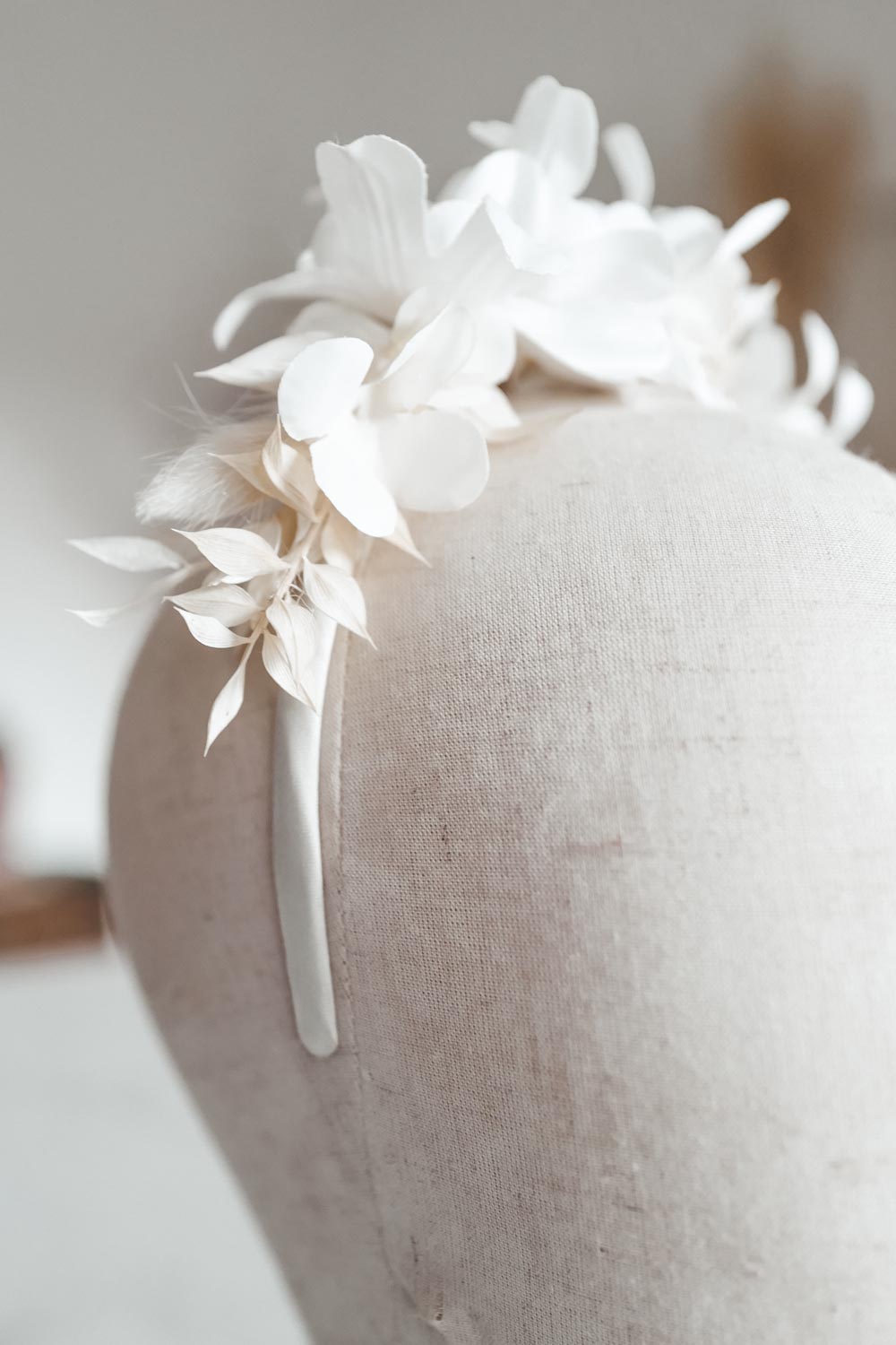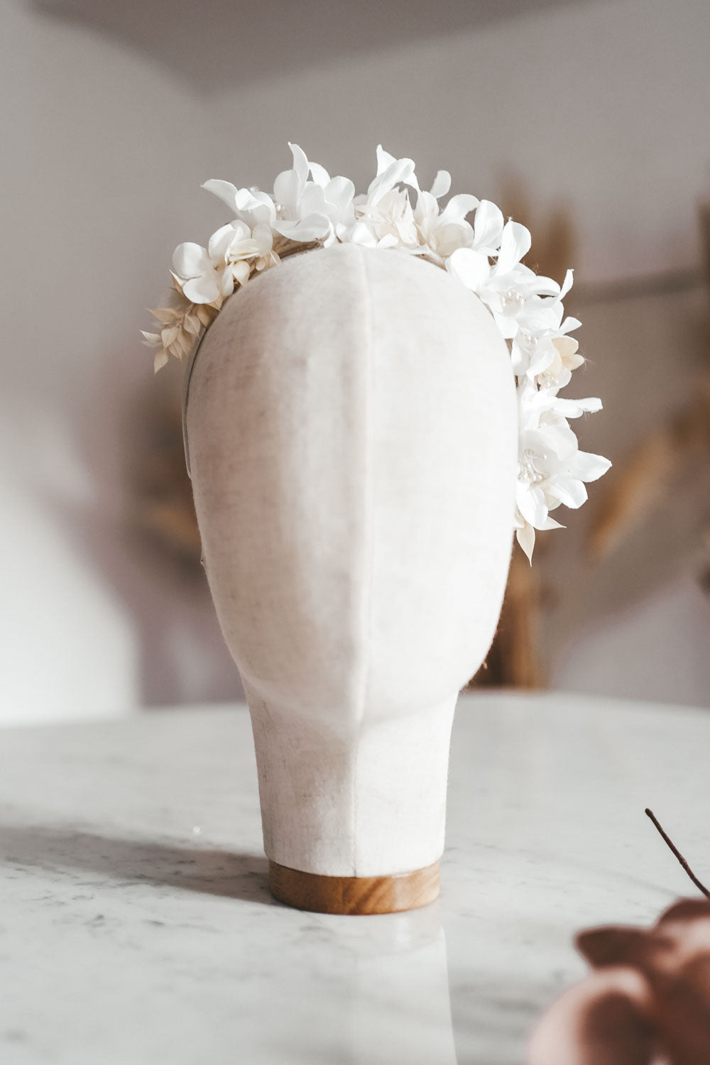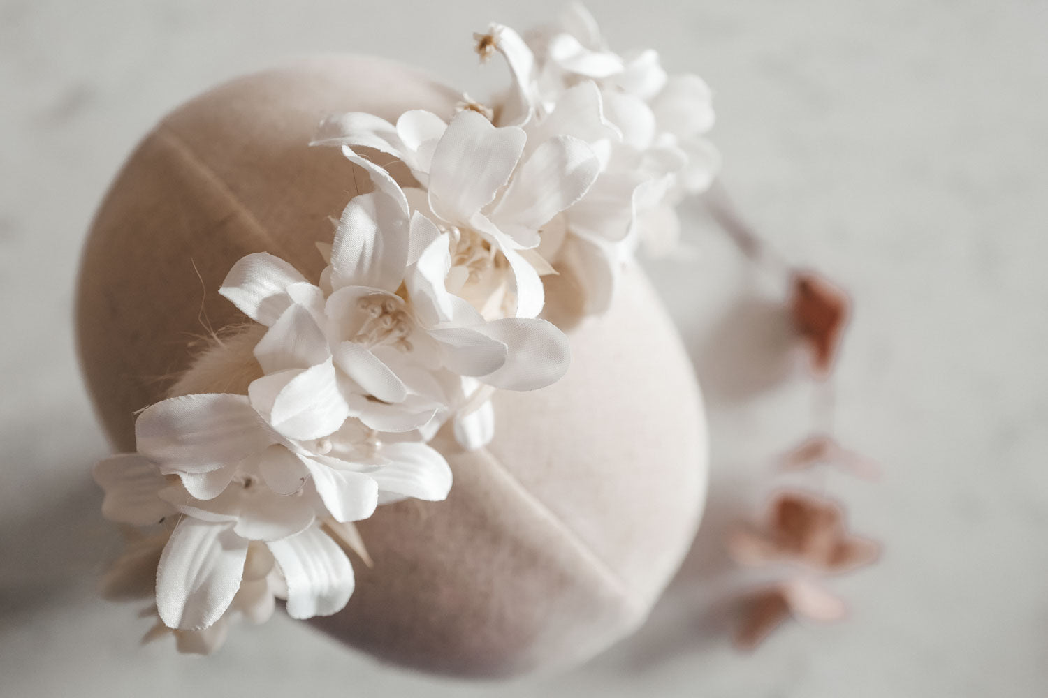 Unser handgemachter Haarreifen White Flowers ist mit Seidenblumen und Dried Flowers besetzt. Die opulente Krone ist auf einem Haarreifen montiert und leicht seitlich zu tragen. Der perfekte Eye-Catcher für deinen Trau-Hochzeitslook.