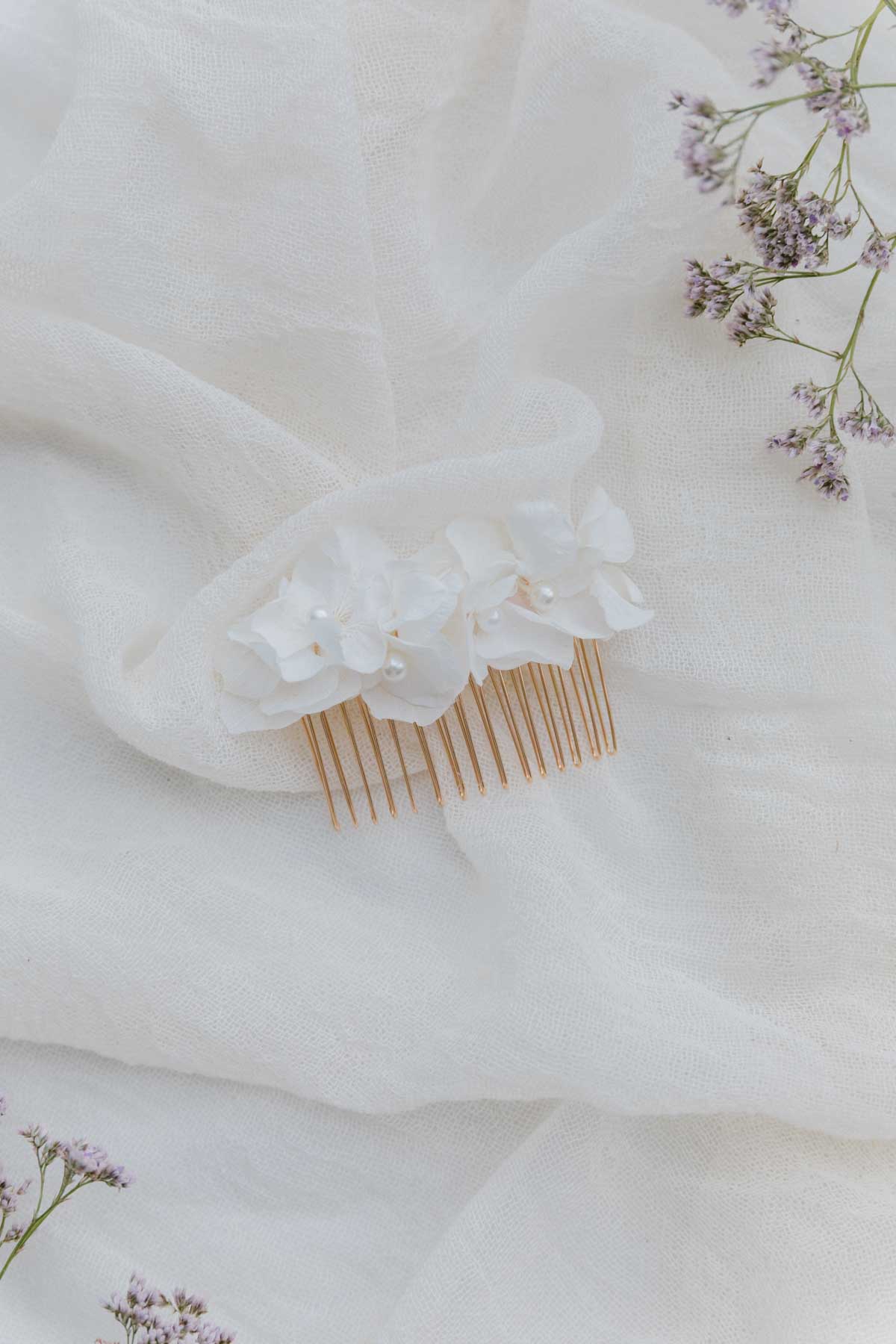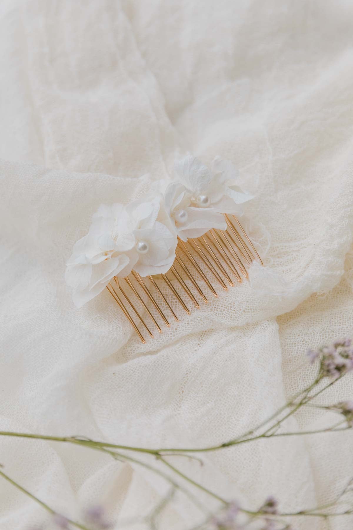 Odette ist ein zarter, handgemachter Hair Comb für den romantischen Bohemian-Bridal-Look. Handgemacht in Wien aus konservierten Blüten und Perlen. So hält dein handgemachtes Bridal-Headpiece ein Leben lang.