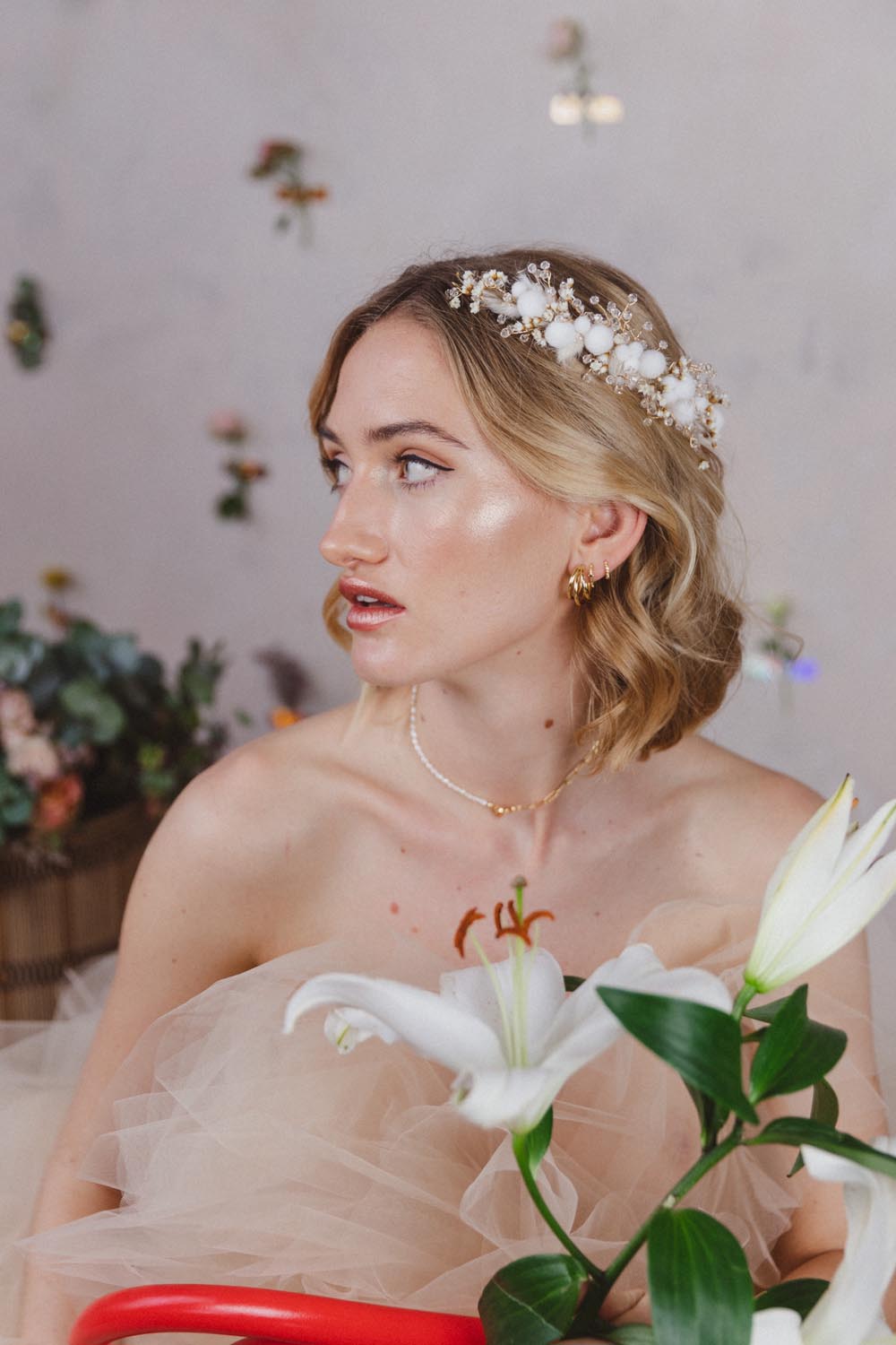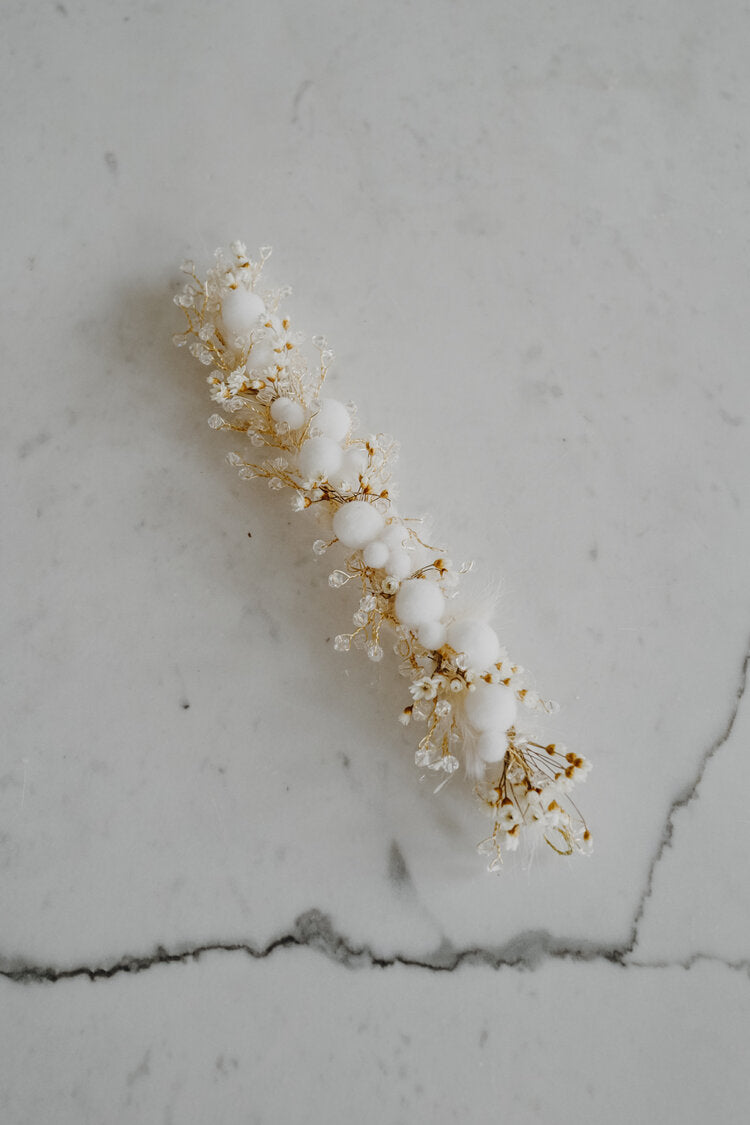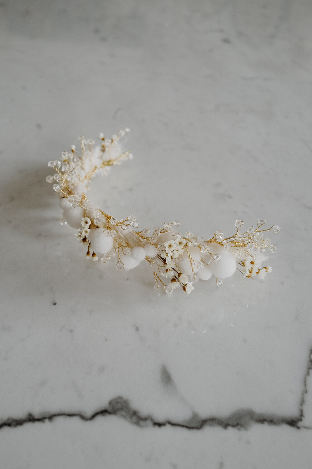 Snowwhite ist ein zartes Headpiece für romantische Brides. Trage es mit oder ohne Bänder im Haar oder auch als Gürtel oder Kette um den Hals. Handgemacht in Wien aus edlen Vintage Seidenblumen, Perlen, PomPoms und Steinen - so hält es ein Leben lang.
