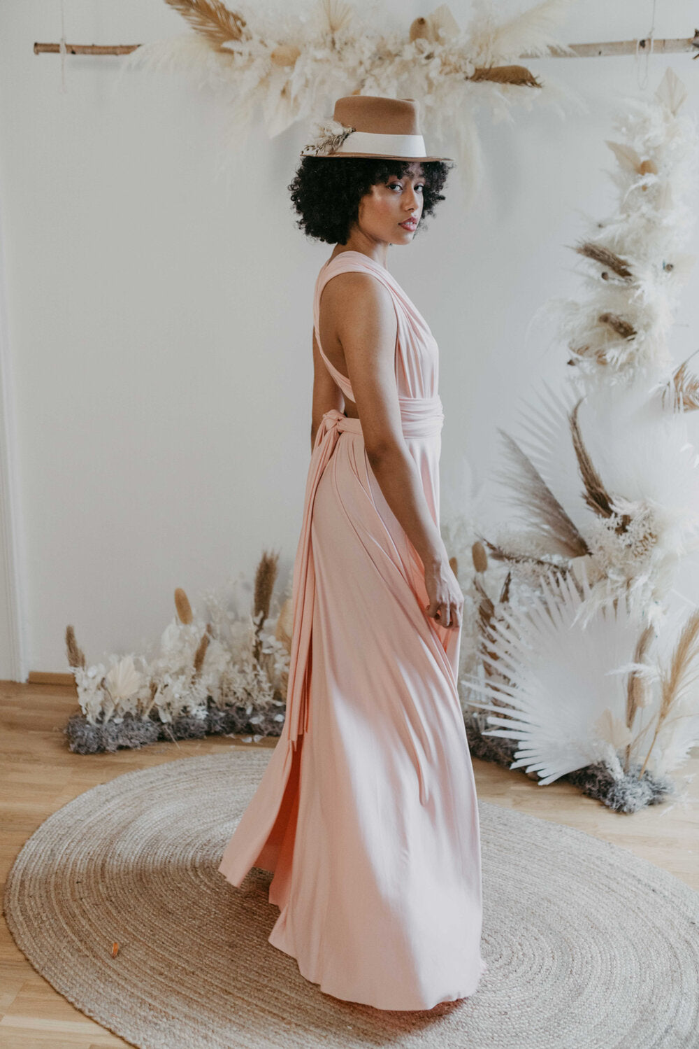 Das Design ist so simpel, die Möglichkeiten so vielseitig. Jedes Kleid besteht aus einem Rockteil, an welchem zwei lange Stoffbahnen genäht sind. Diese ergeben das wickelbare Oberteil. Das Kleid wird mit einem Bandeau in der passenden Farbe geliefert, welches du unter deinem Kleid als Top tragen kannst.