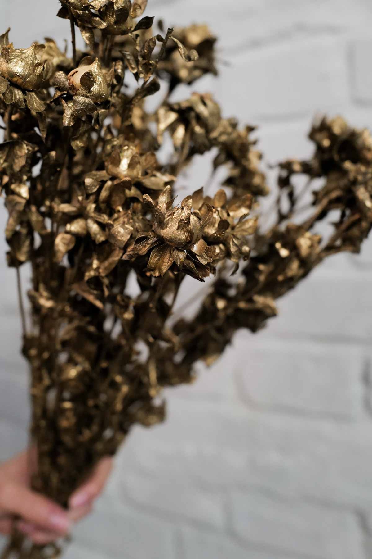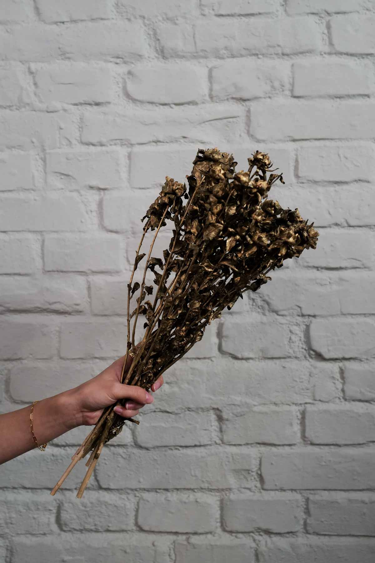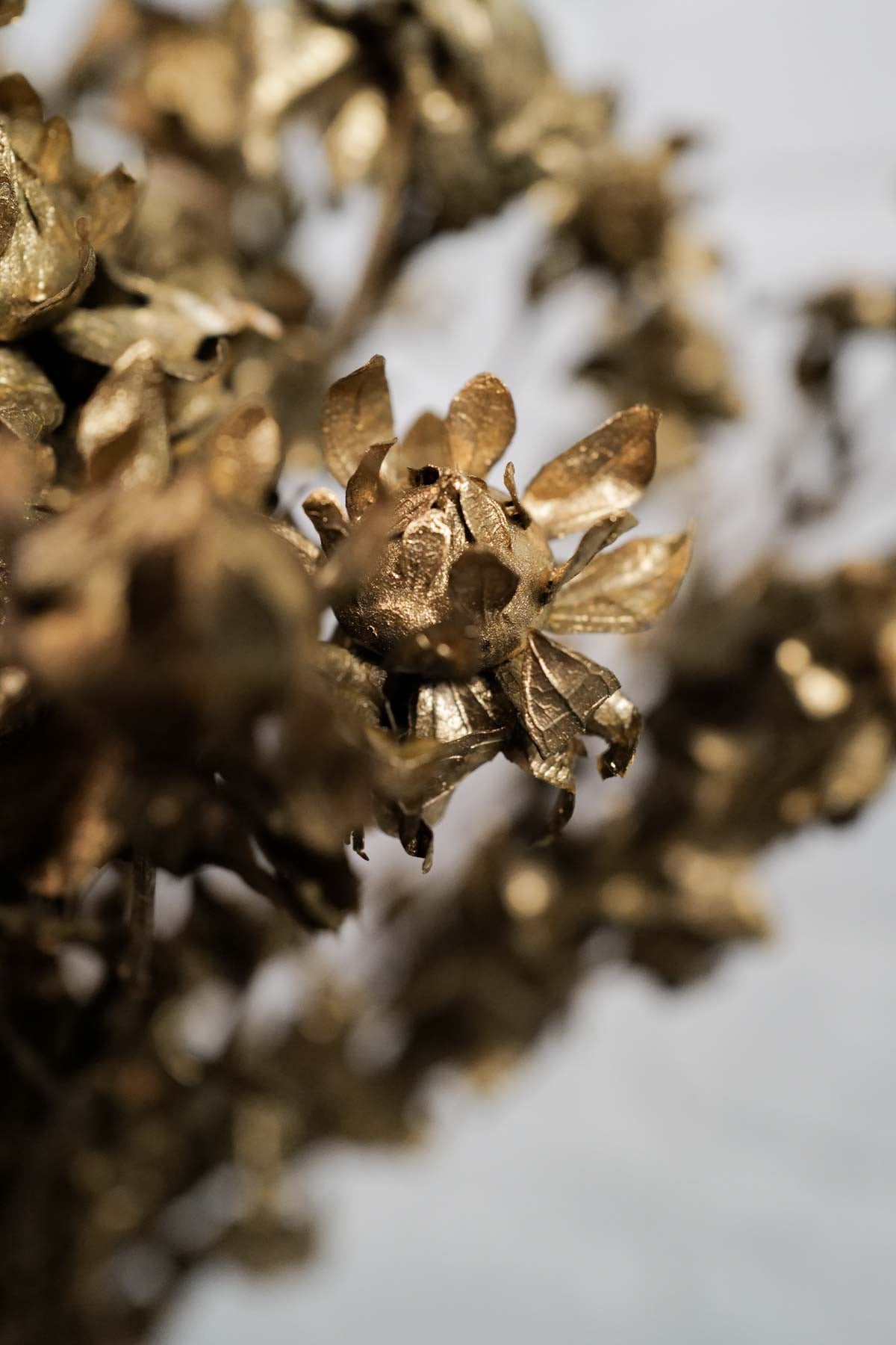 Ein Bund getrockneter, goldene Dekoelemente für die Dekoration in der Vase.