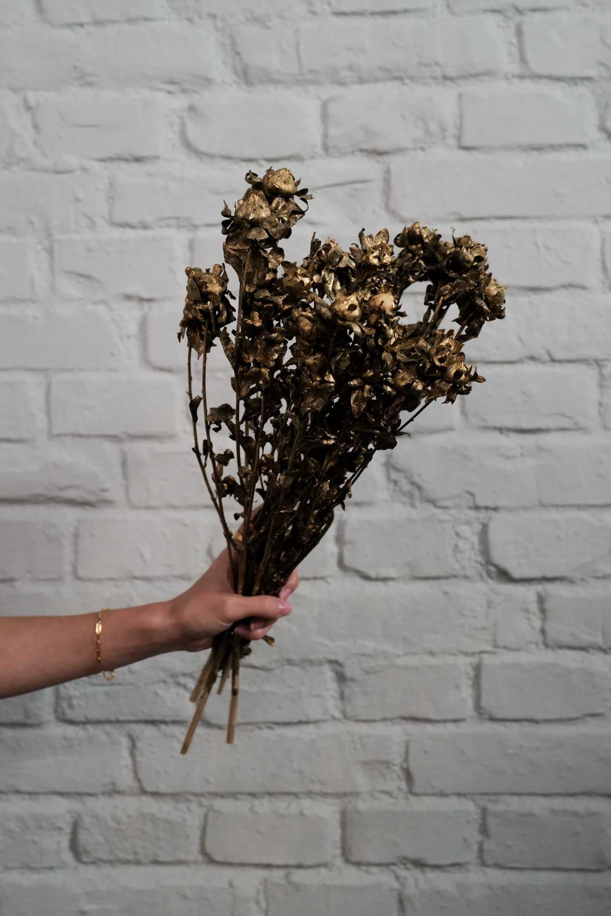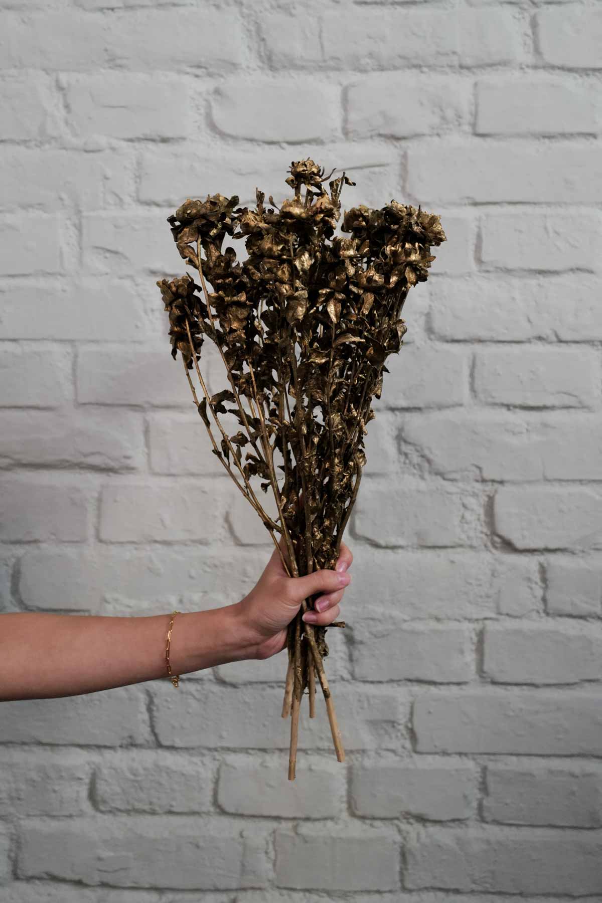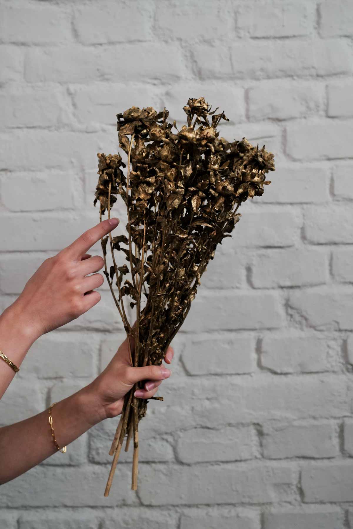 Ein Bund getrockneter, goldene Dekoelemente für die Dekoration in der Vase.
