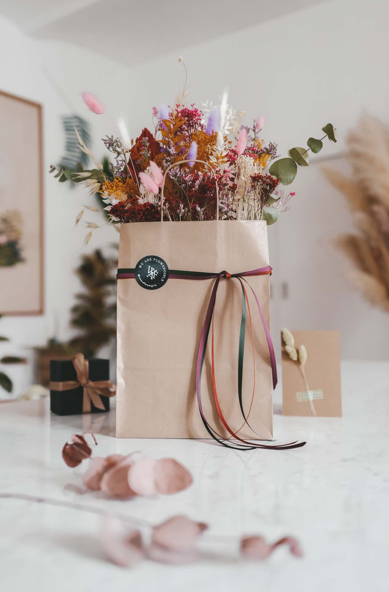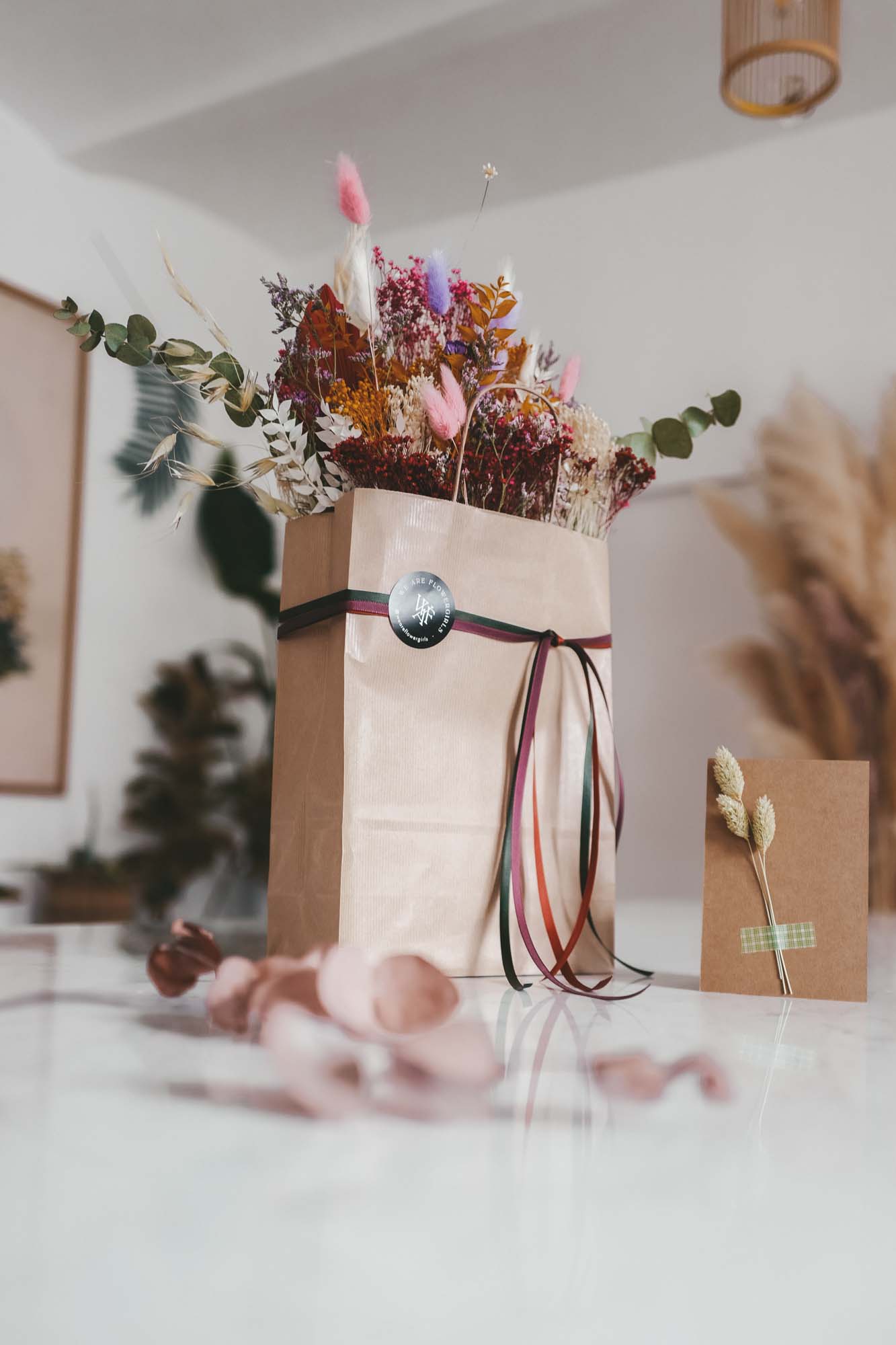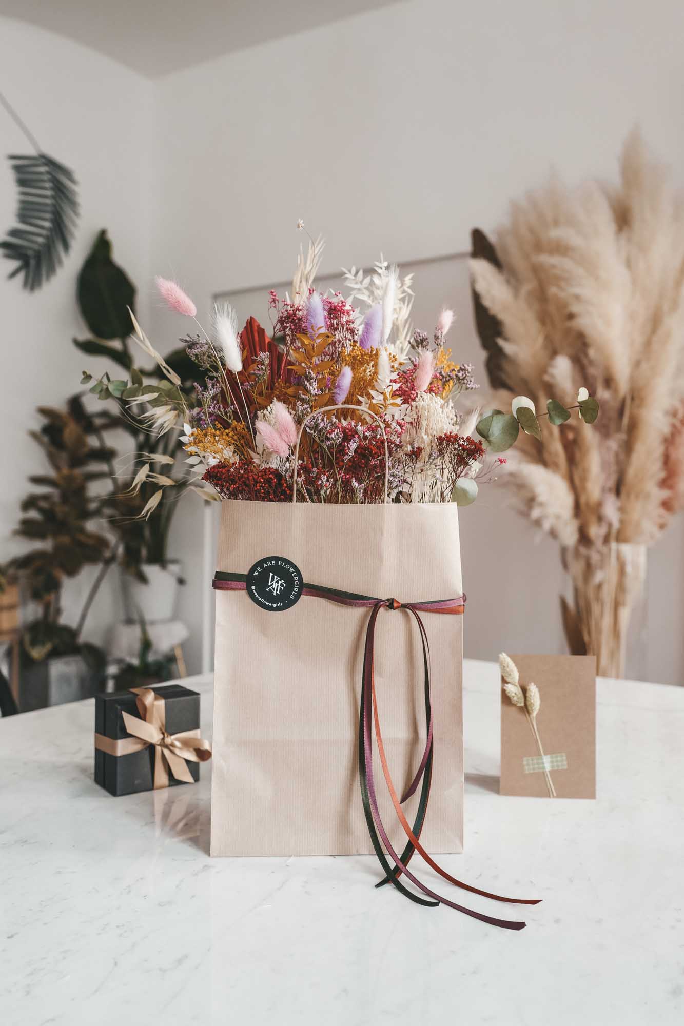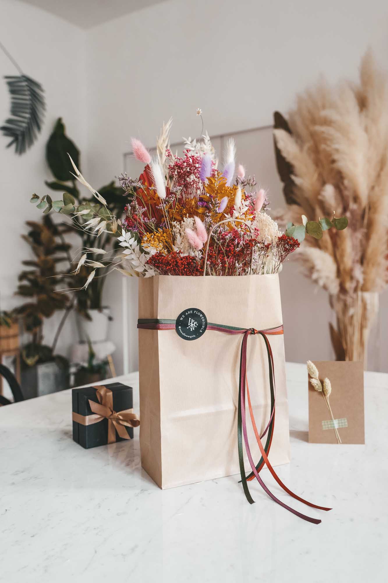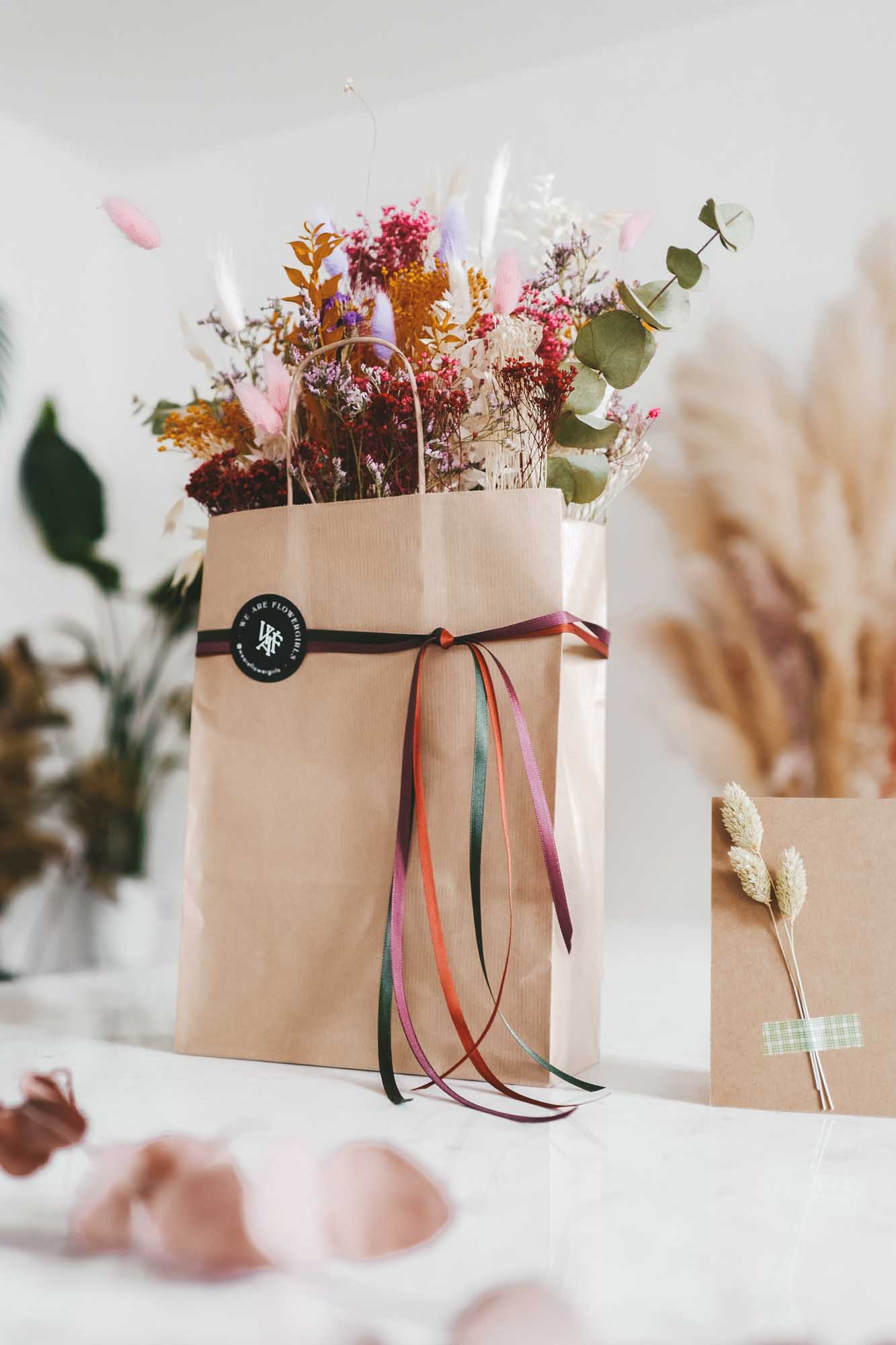 Inkl. sind die Bänder, eine Dried Flower Karte sowie die Papiertasche mit Dried Flowers.