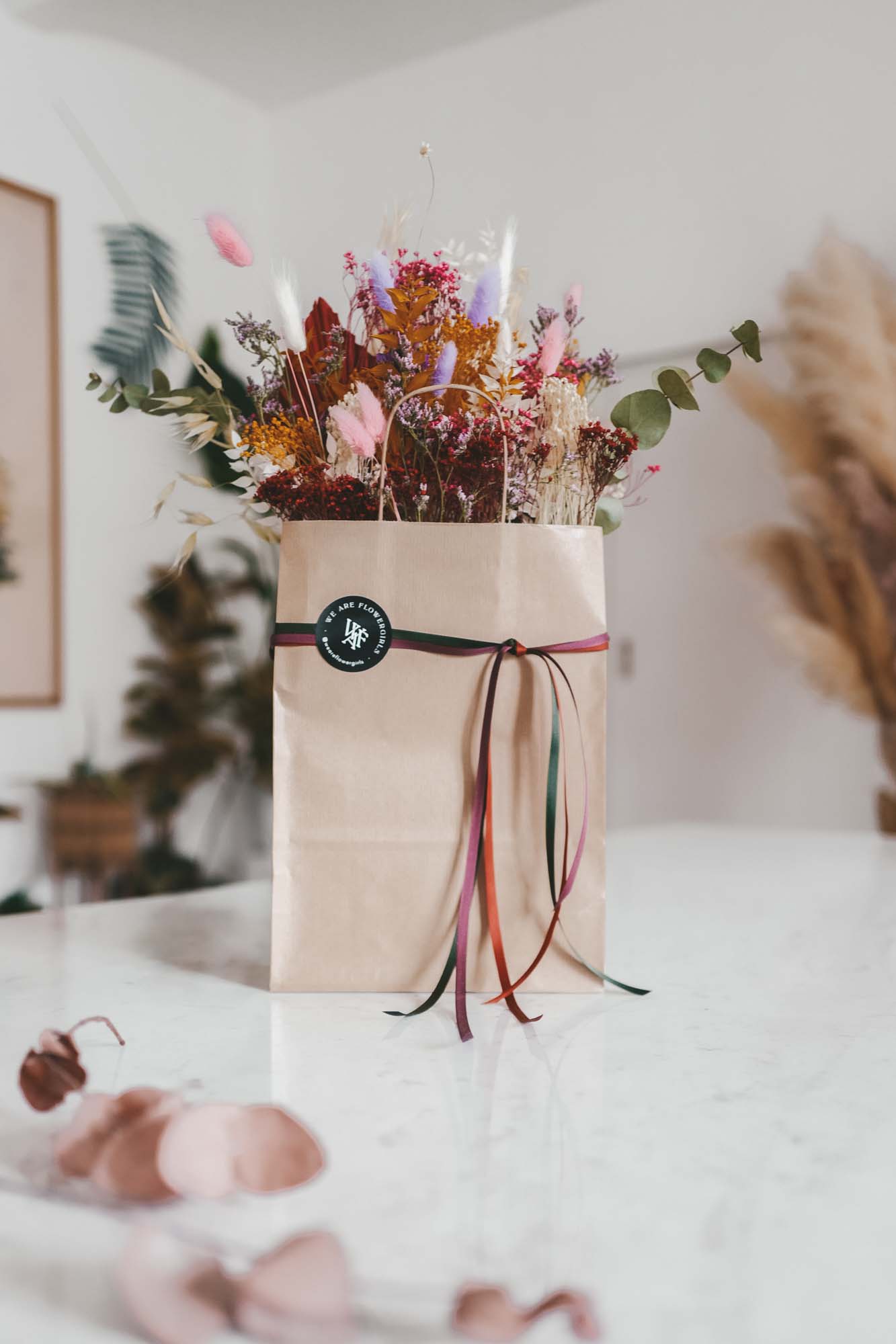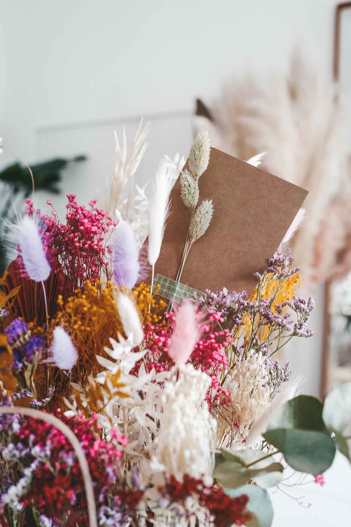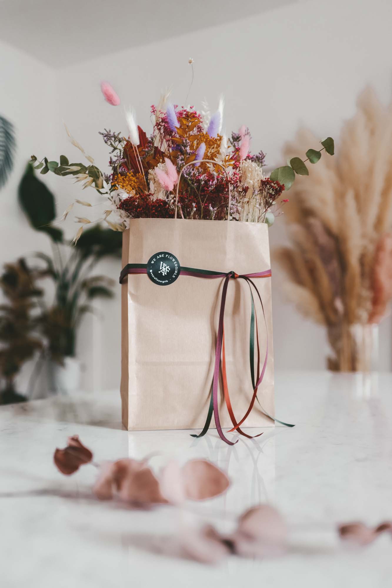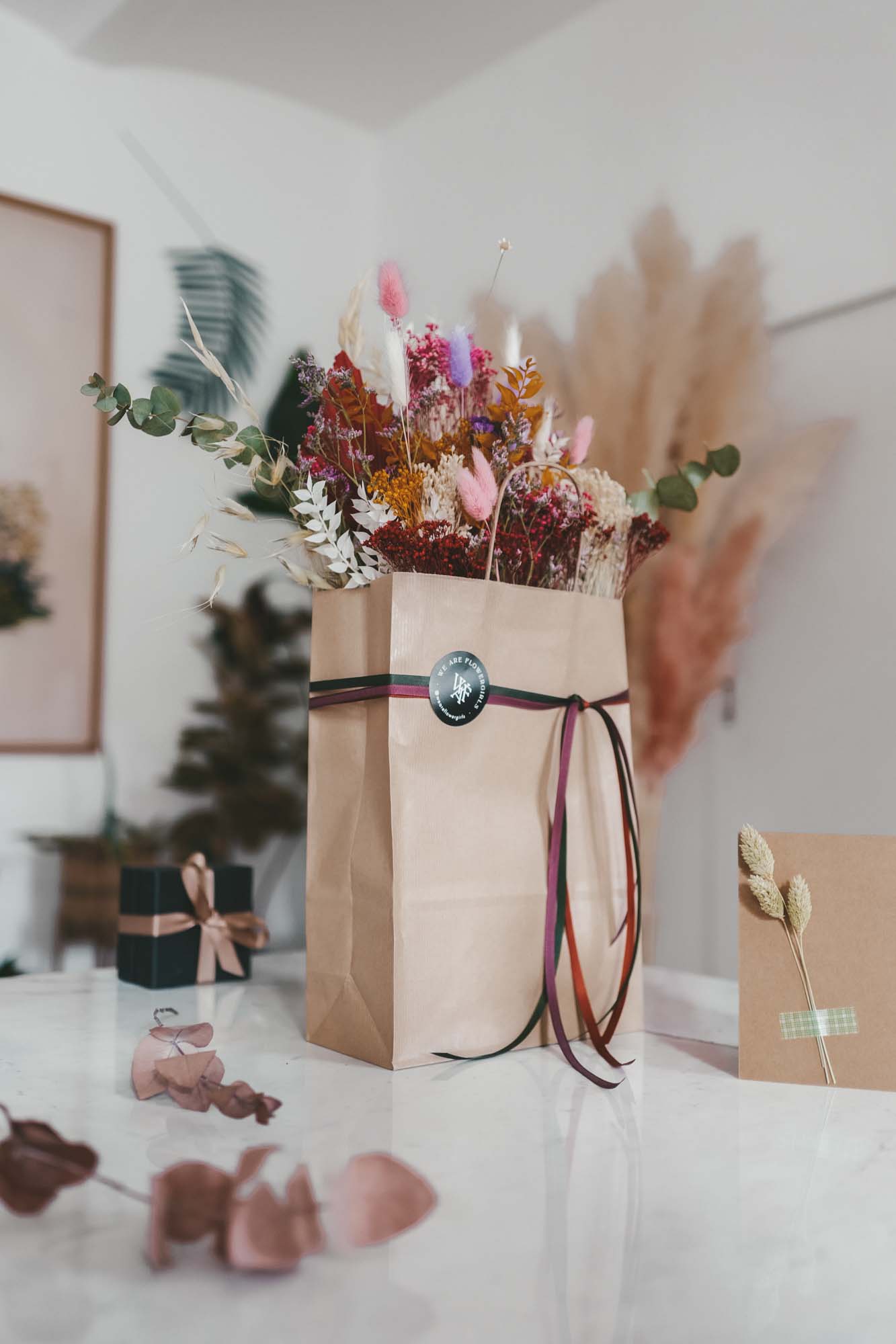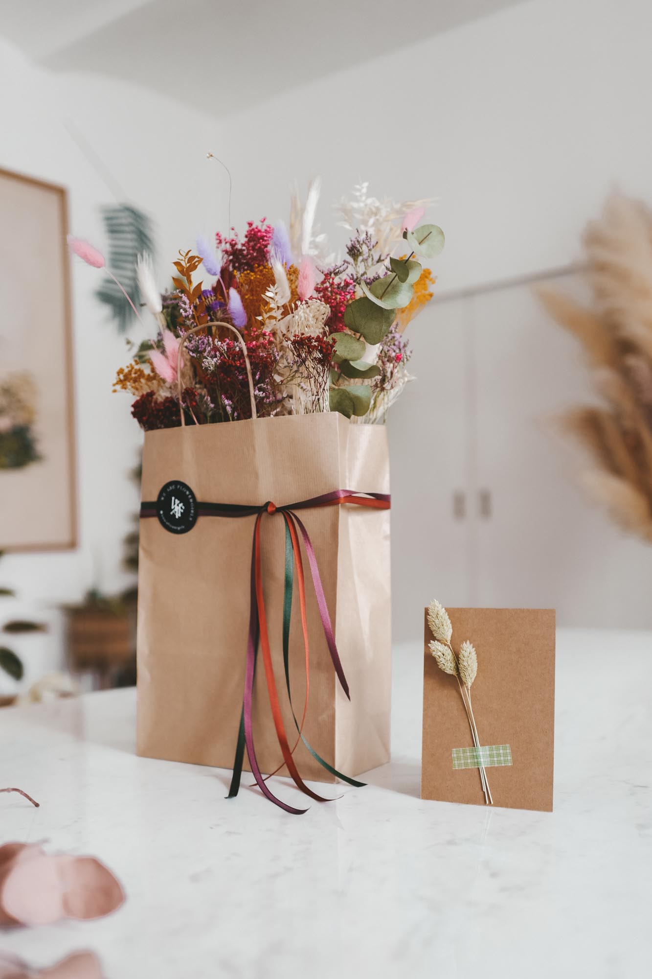 Inkl. sind die Bänder, eine Dried Flower Karte sowie die Papiertasche mit Dried Flowers.