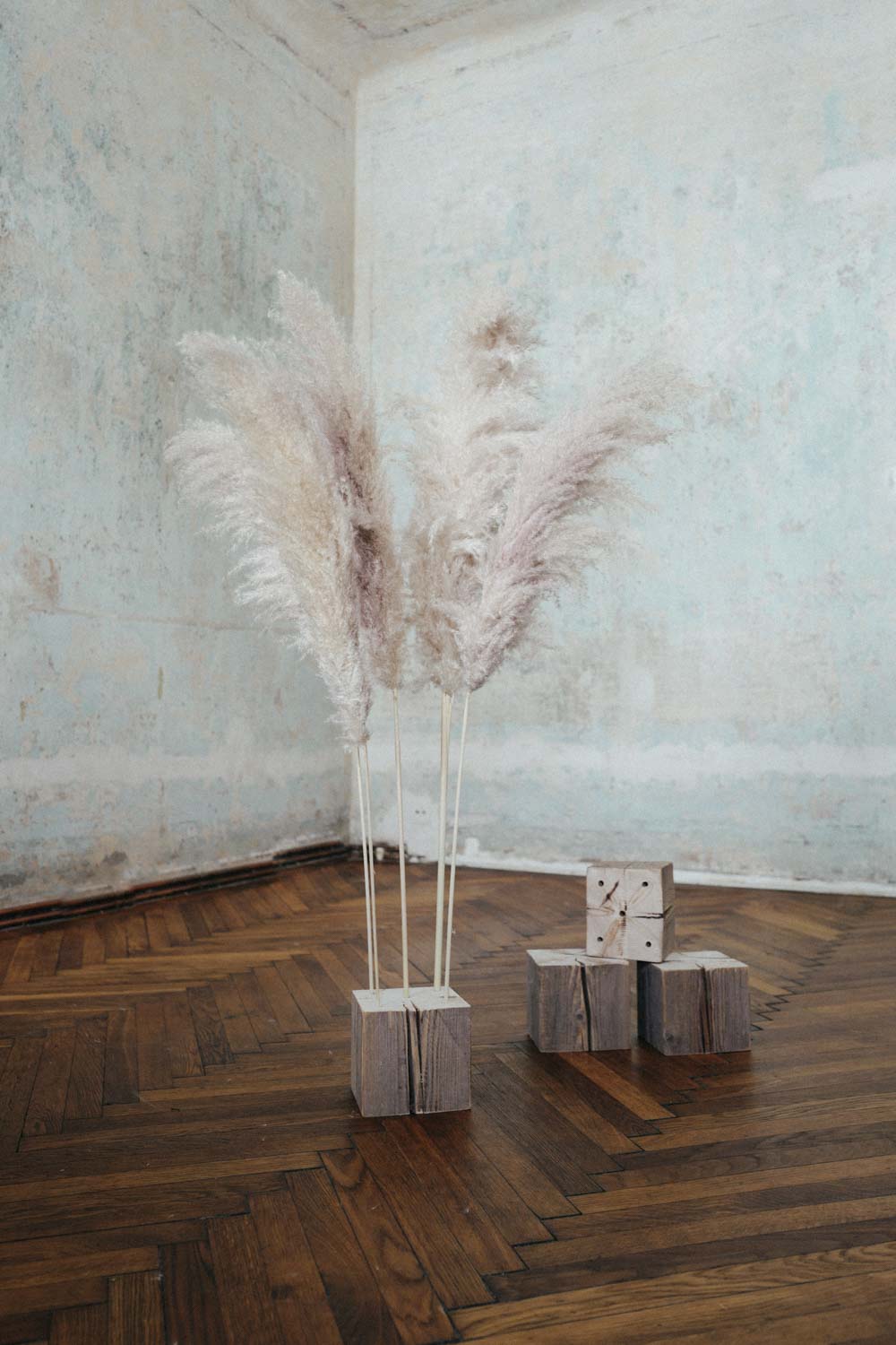 Doch wie können wir auch mit wenigen Gräsern ein Arrangement mit tollem Pampasgras-Volumen schaffen? So kam die Idee zu unserem Wooden Pampas Block.