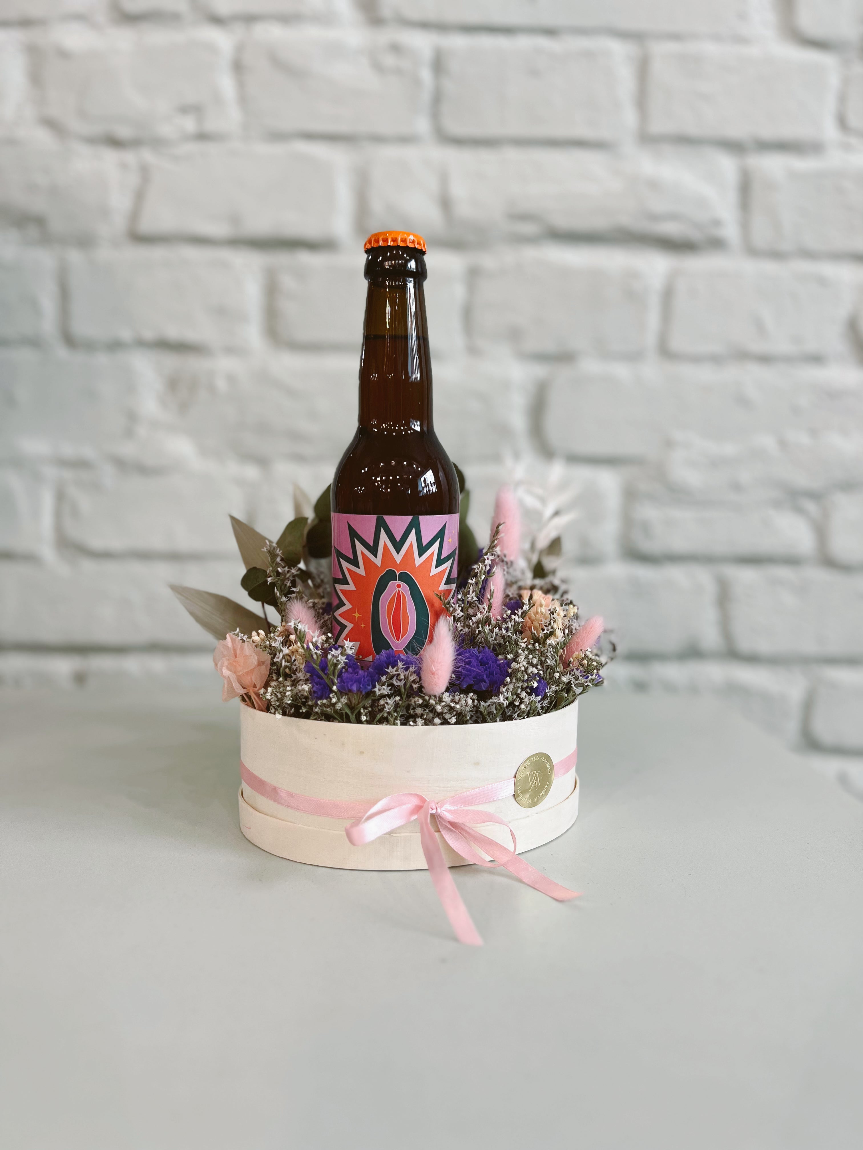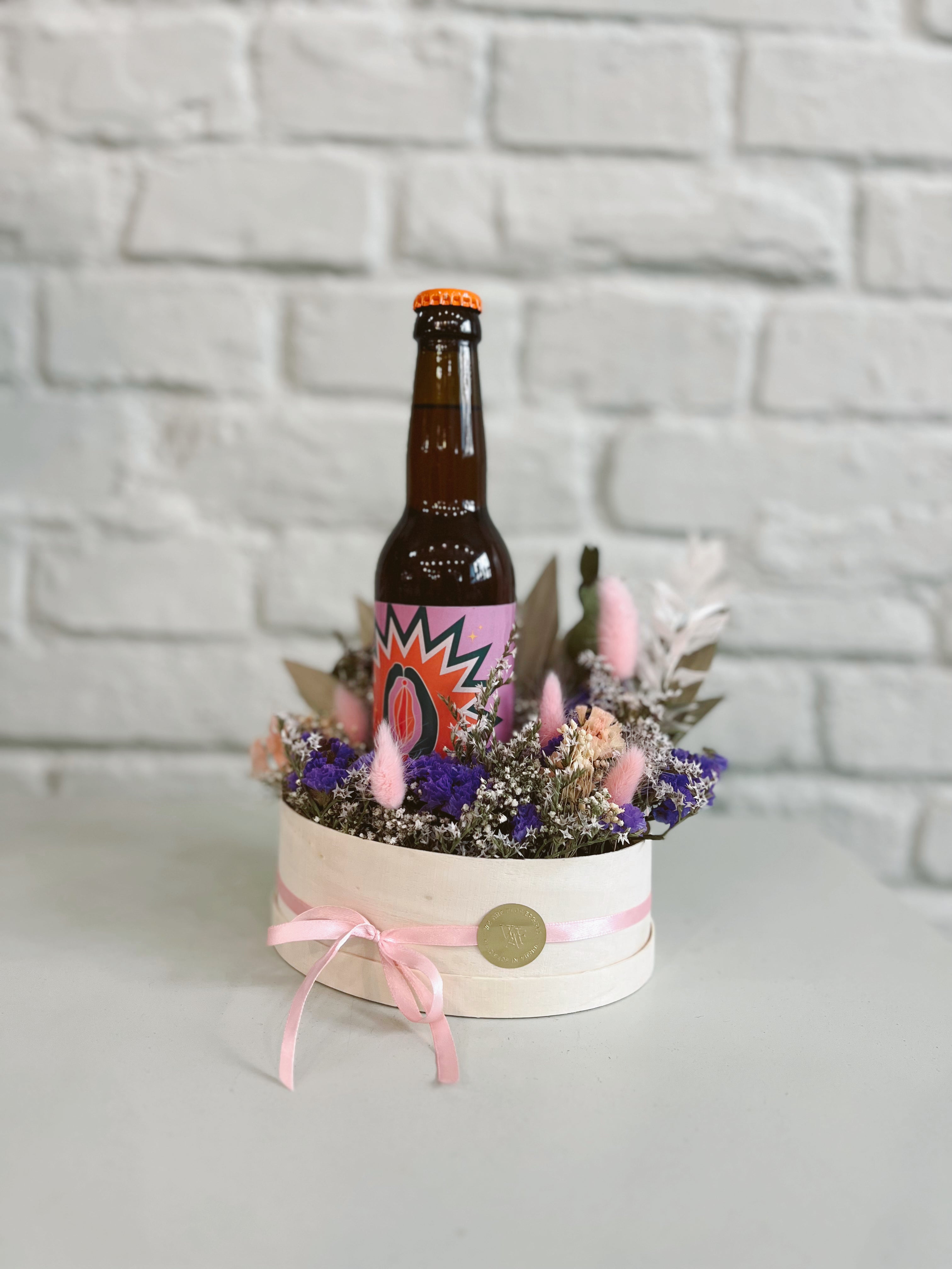 Dried Flower Box aus Holz für die Ewigkeit - gesteckt in ovaler Muschi-Form und befüllt mit einem Muschikraft Bier aus Wien.