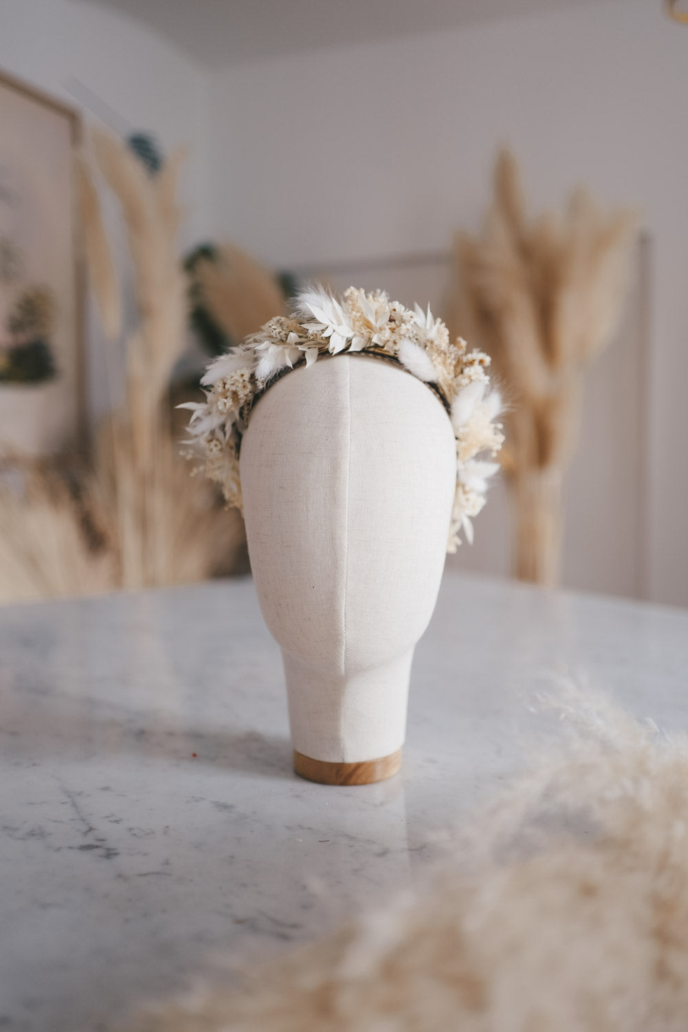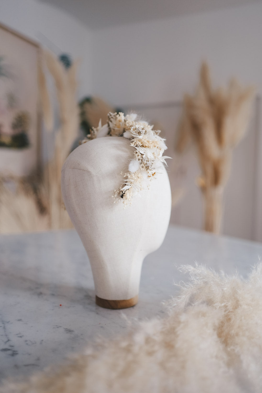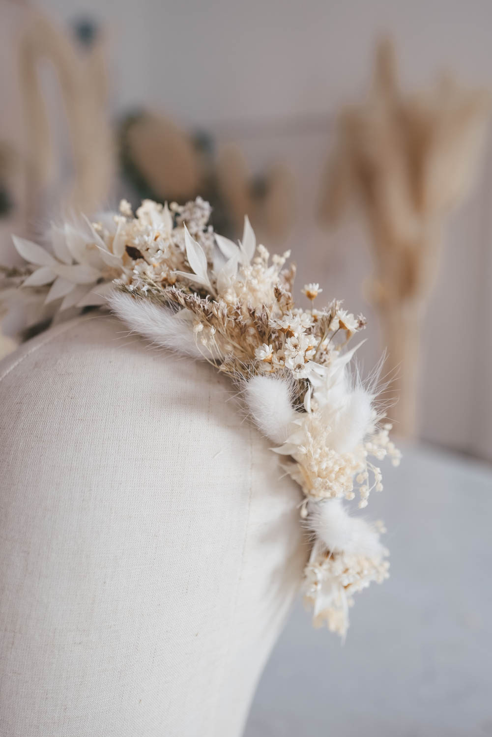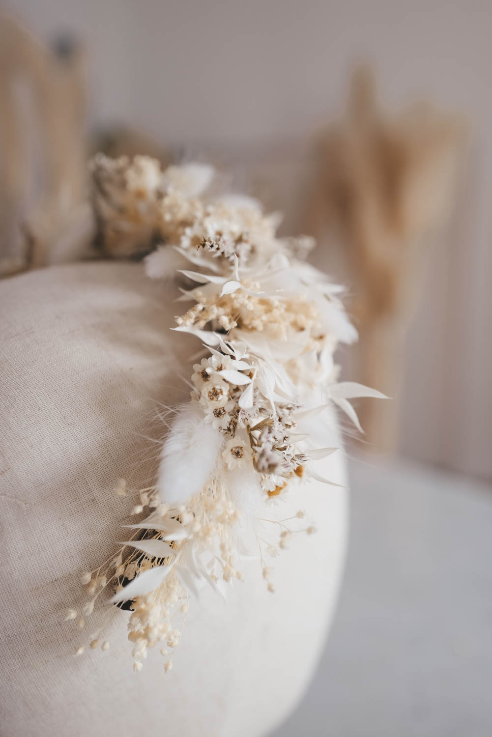 Flowercrown Carine ist eine romantische Blumenkrone für die Ewigkeit die niemals verblüht. Handgemacht in Wien aus preserved Flowers & Trockenblumen im Wiener Atelier von We Are Flowergirls.