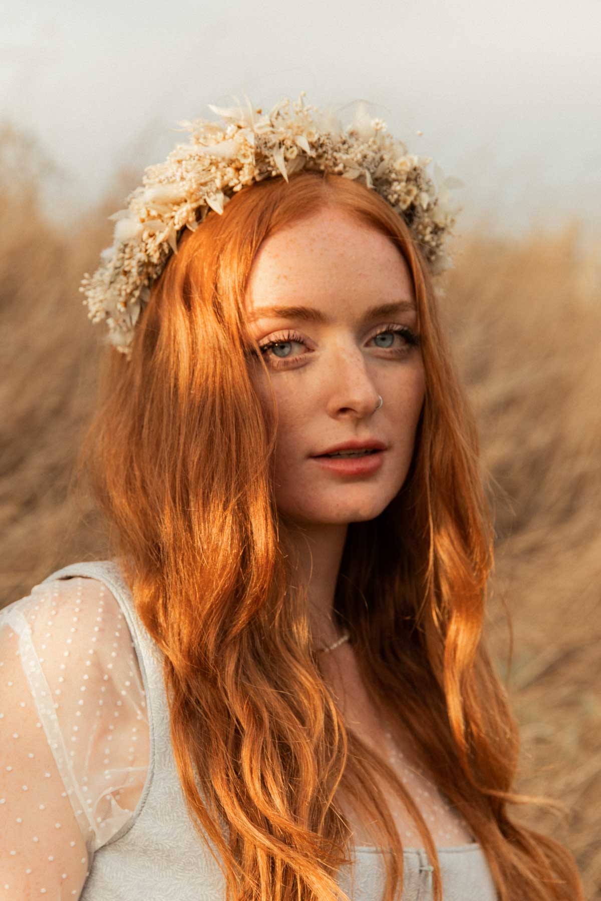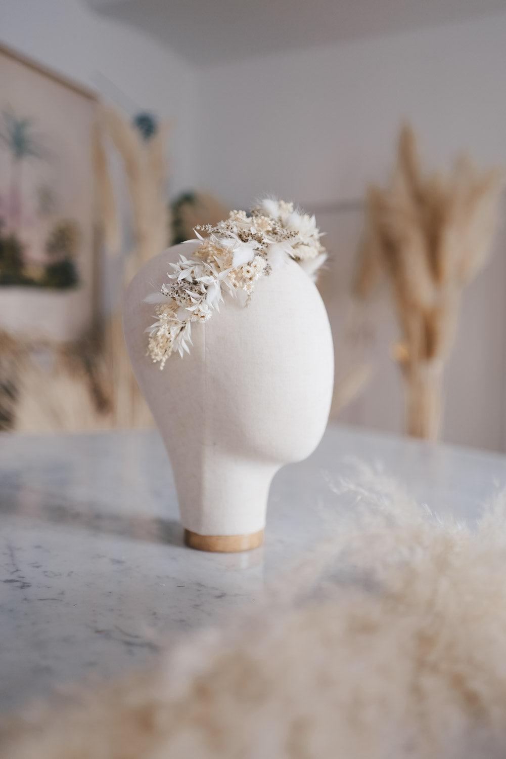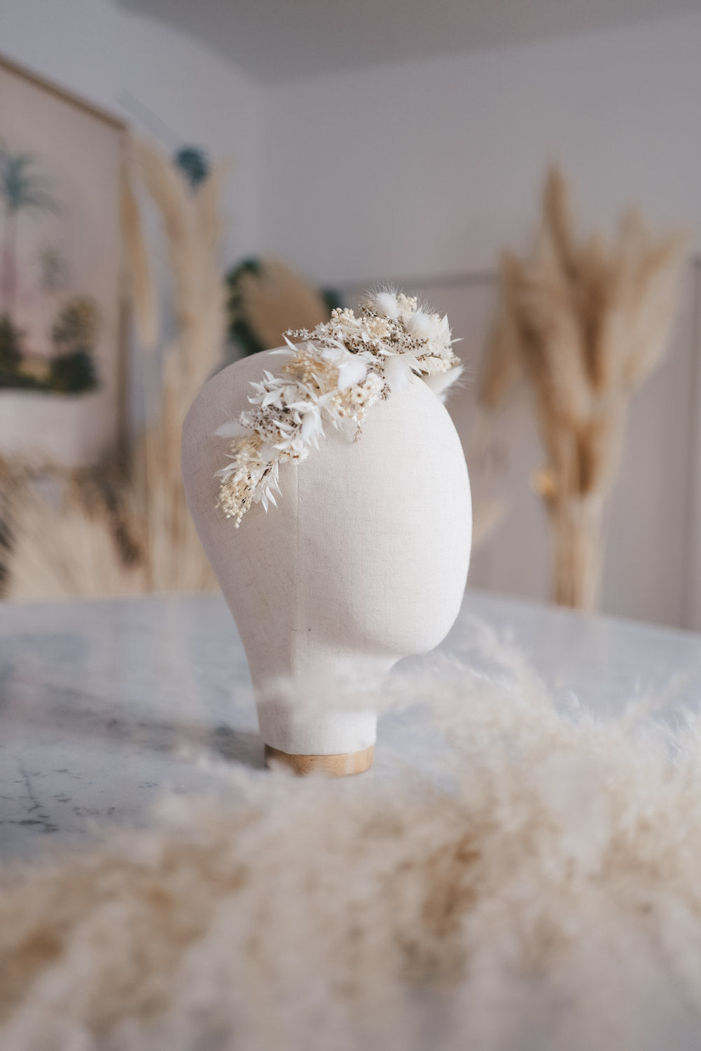 Flowercrown Carine ist eine romantische Blumenkrone für die Ewigkeit die niemals verblüht. Handgemacht in Wien aus preserved Flowers & Trockenblumen im Wiener Atelier von We Are Flowergirls.