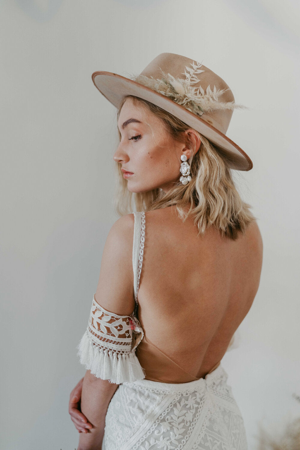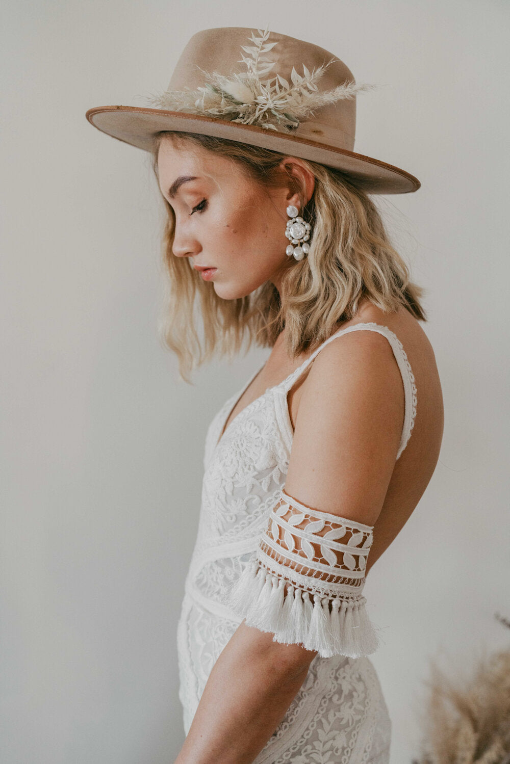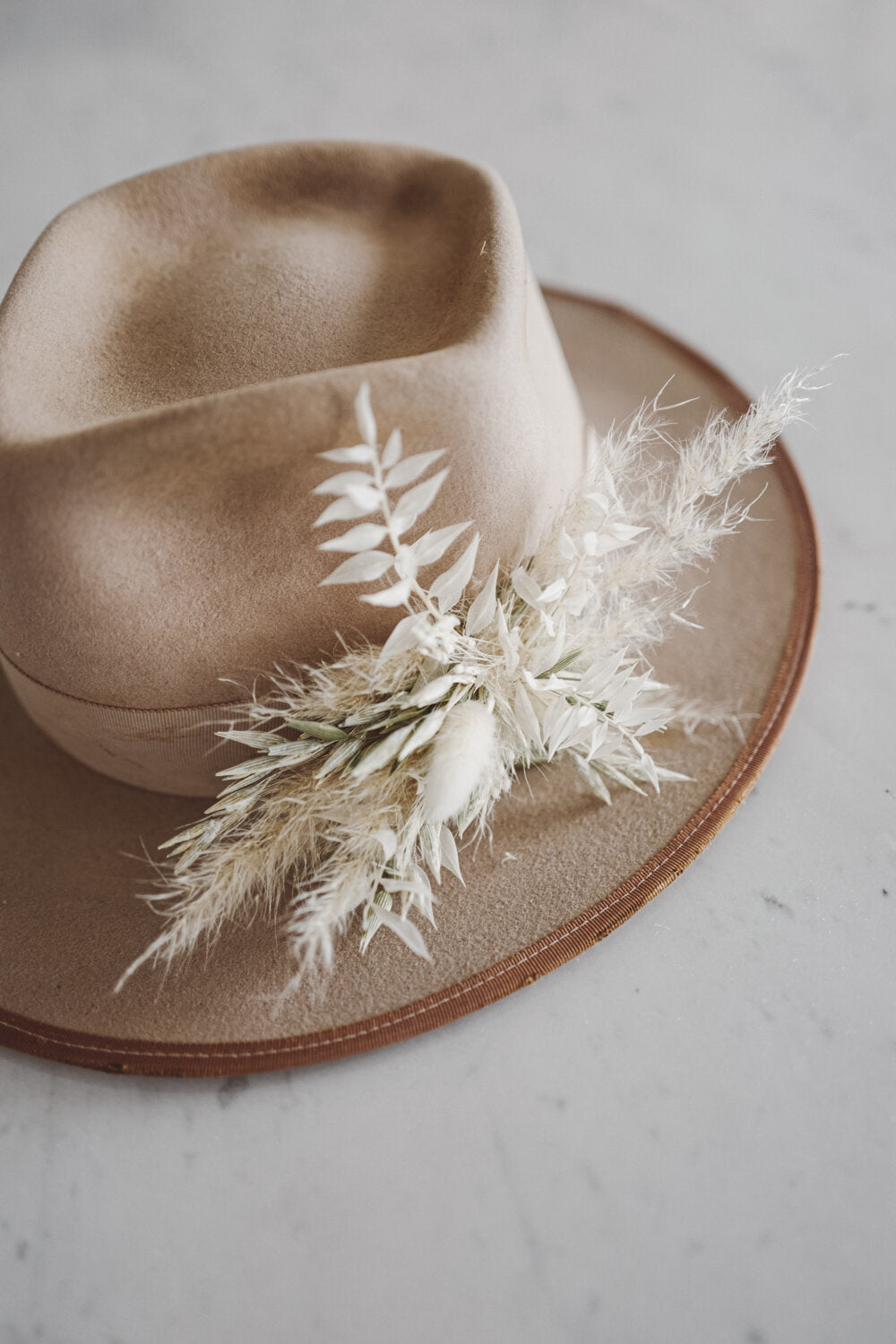 Khali ist ein zarter Clip für Bohemian-Brides. Handgemacht in Wien aus hochwertig getrockneten und konservierten Dried Flowers. Du kannst den Clip auf eine Hutkrempe klemmen oder direkt ins Haar in deine Steckfrisur.