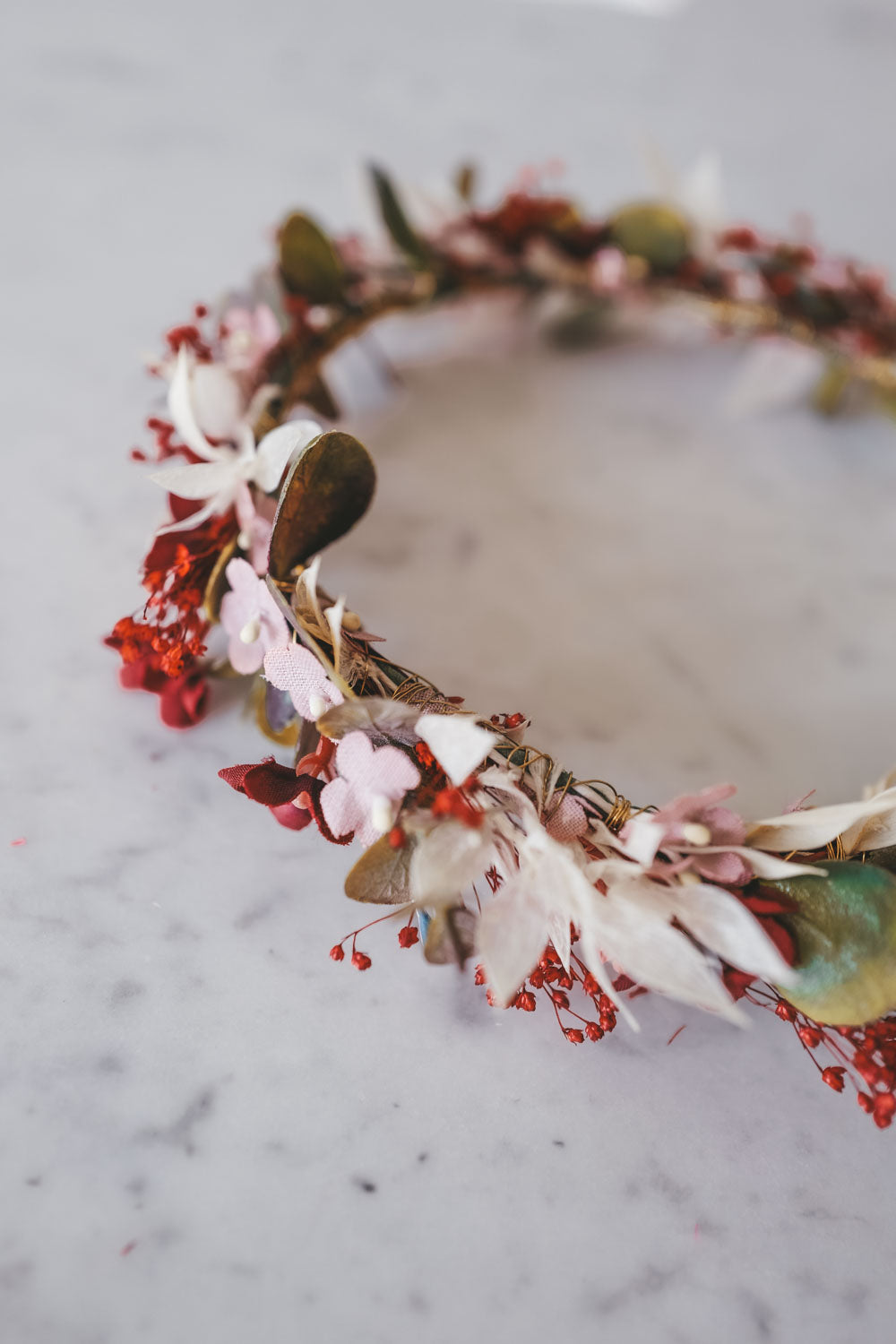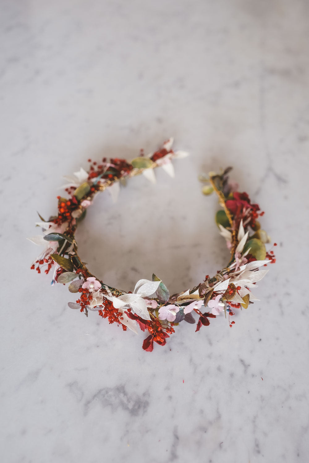 Handgemacht in Wien aus hochwertig getrockneten und konservierten Blüten und Gräser. So hält die Krone ein Leben lang. Blühender Luxus der nie verwelkt.