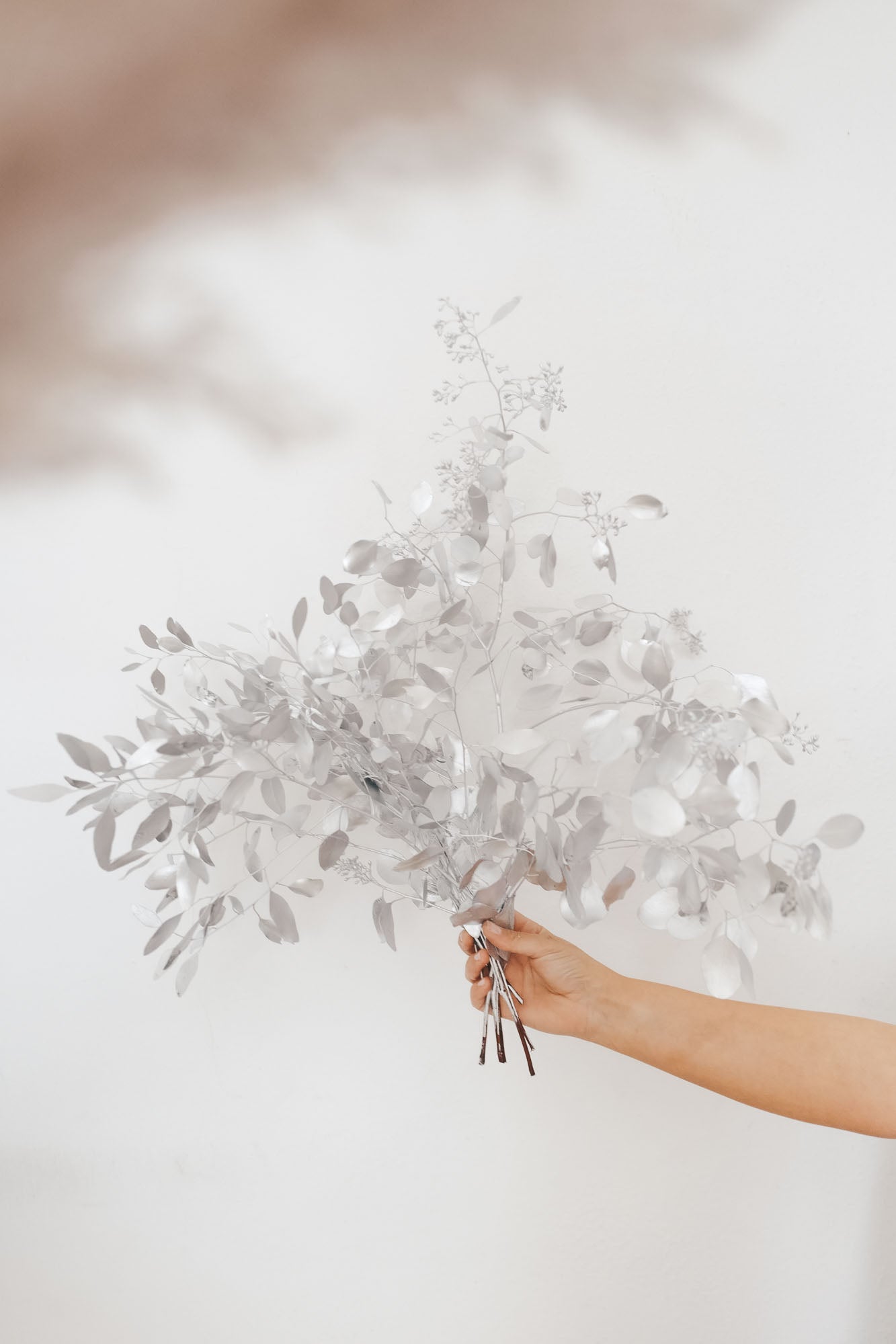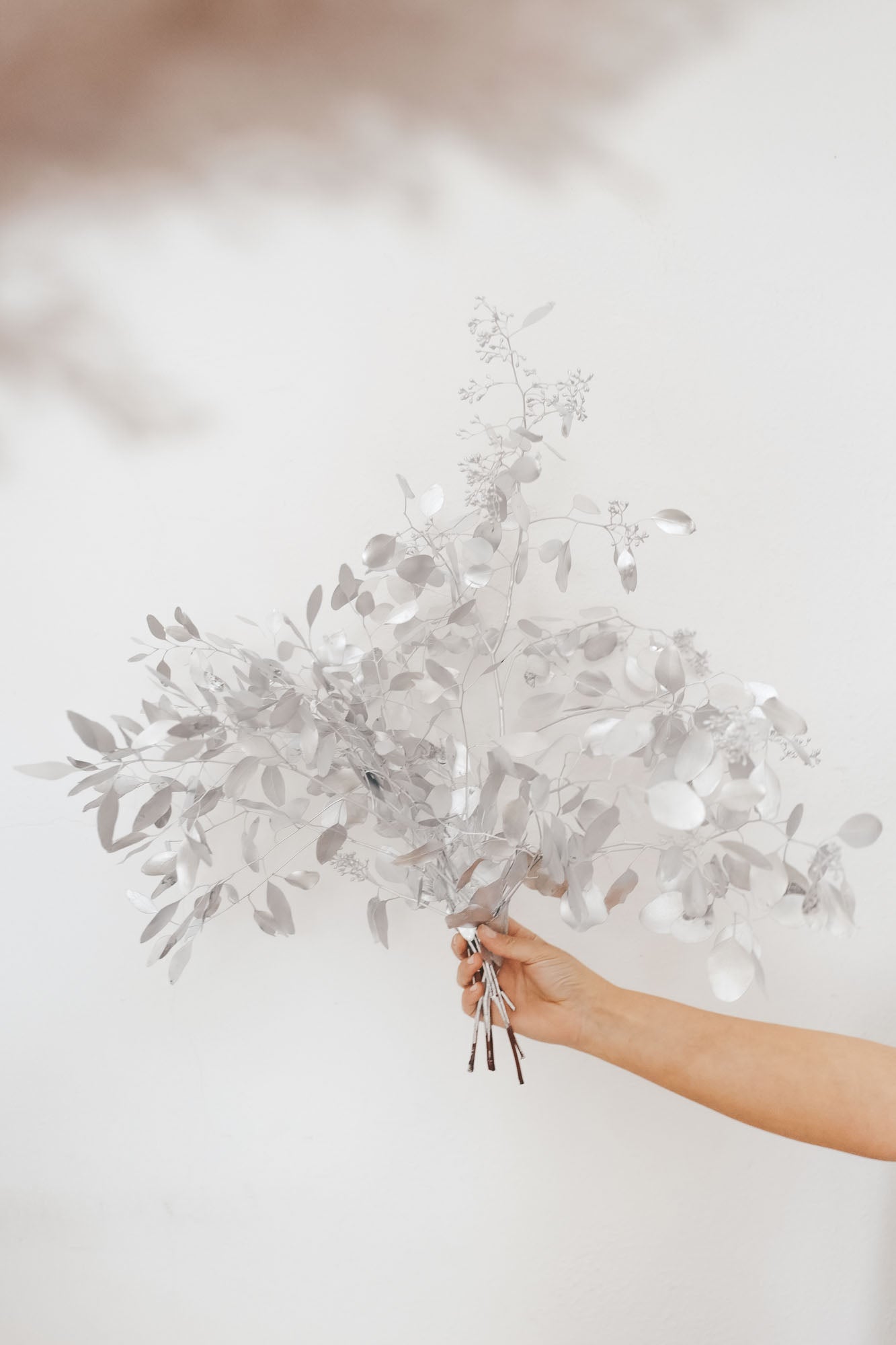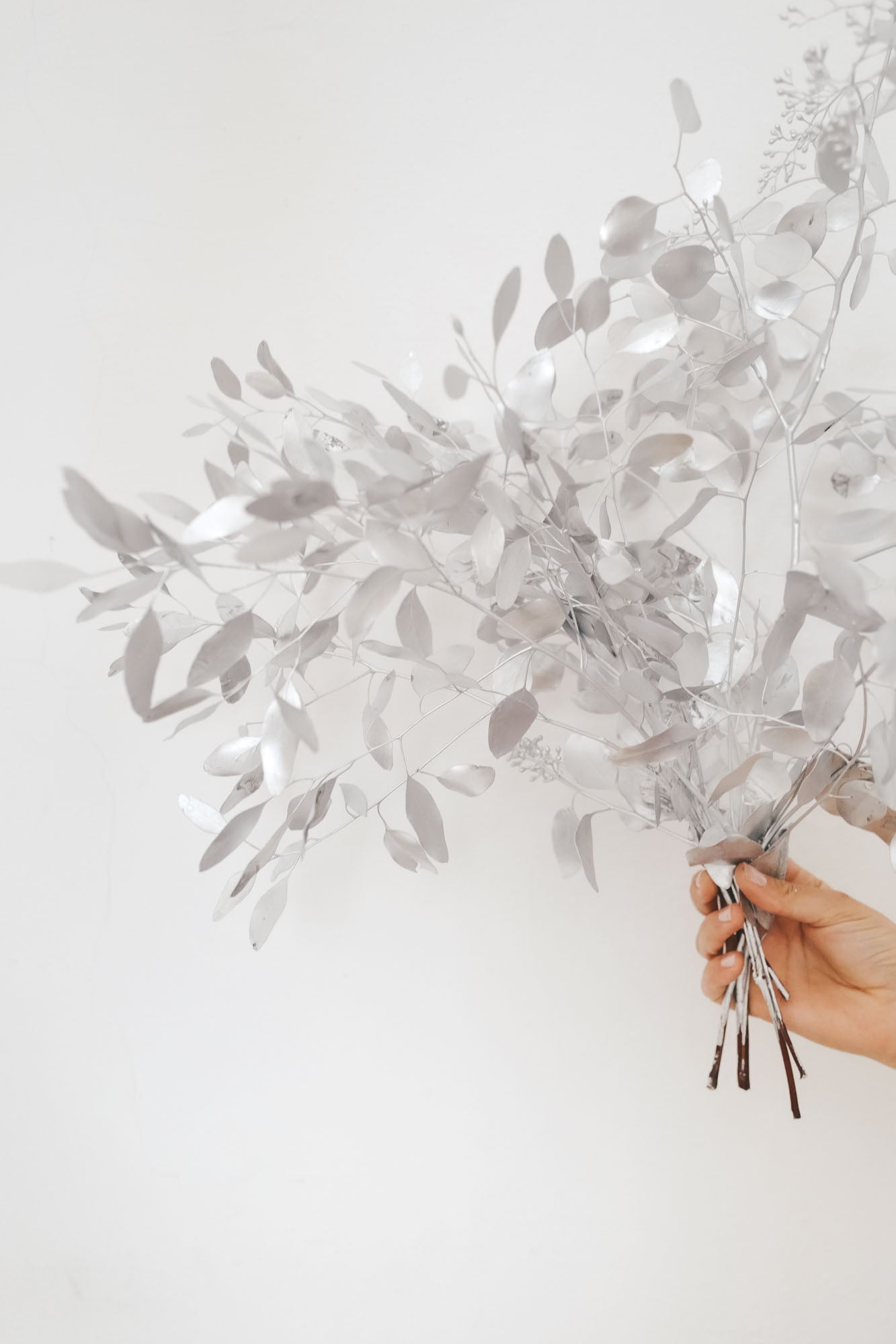 Ein Bund getrockneter, silbener Eukalyptus für die Dekoration in der Vase.