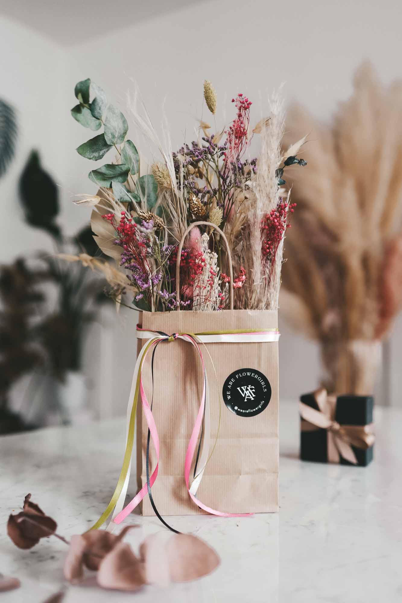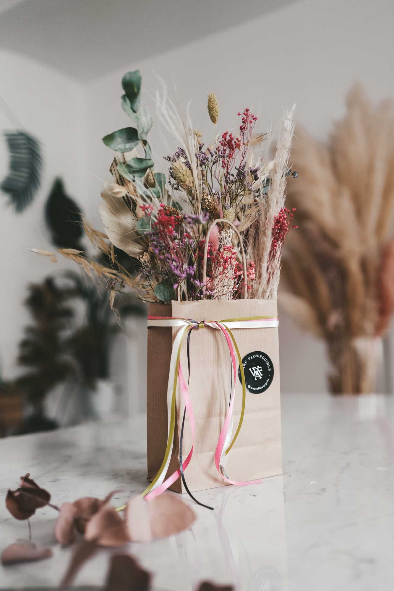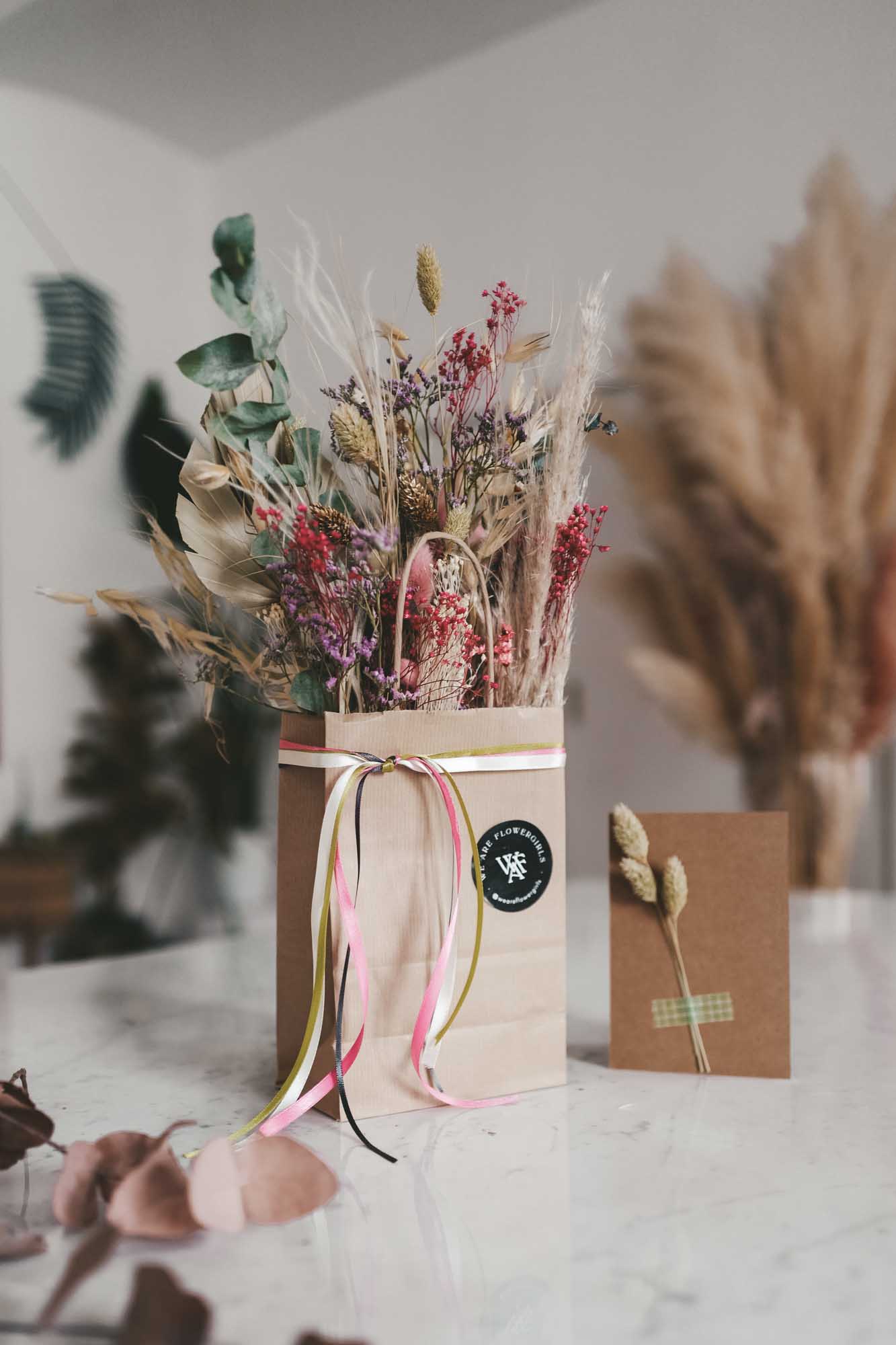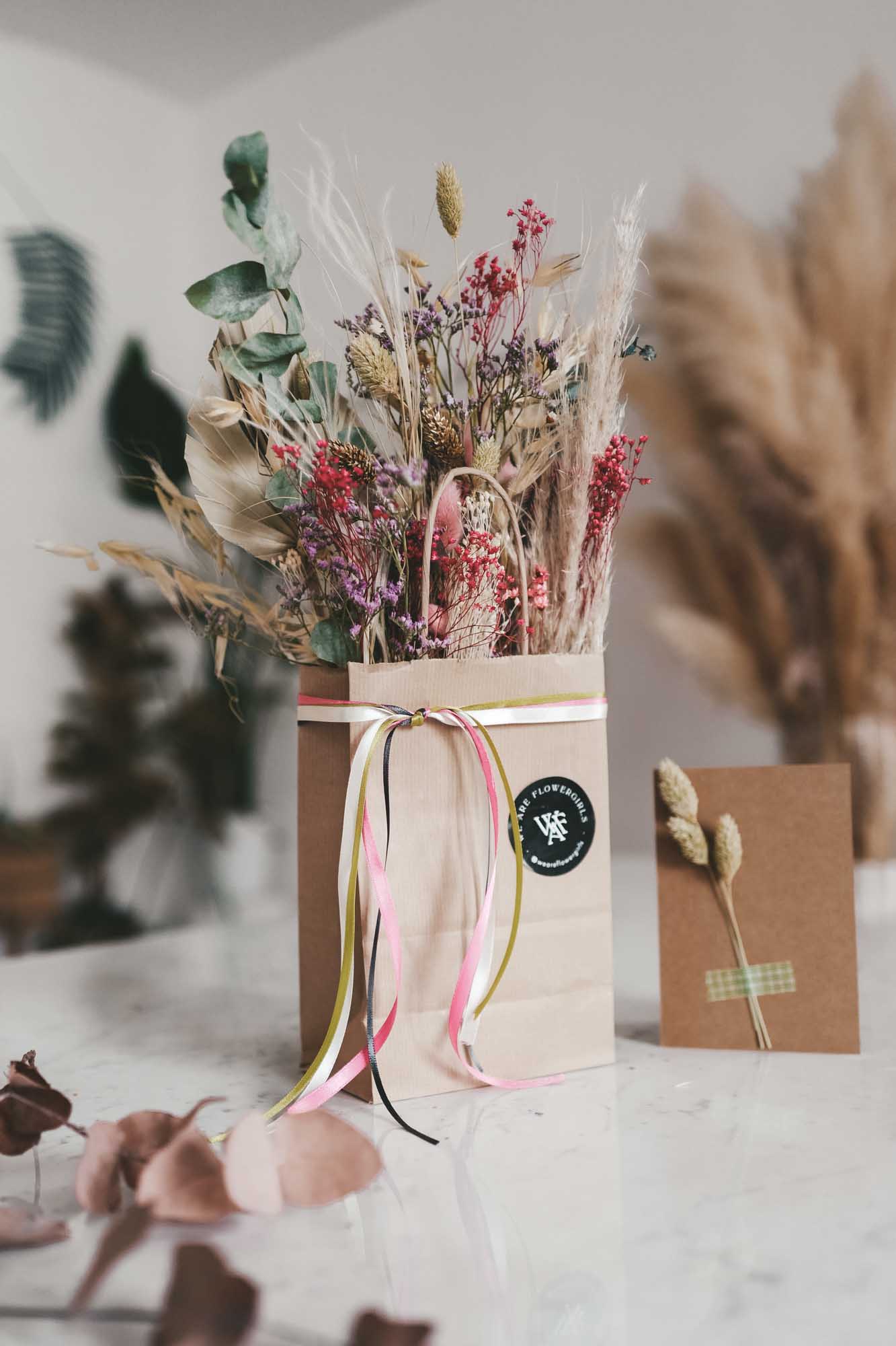 Inkl. sind die Bänder, eine Dried Flower Karte sowie die Papiertasche mit Dried Flowers.