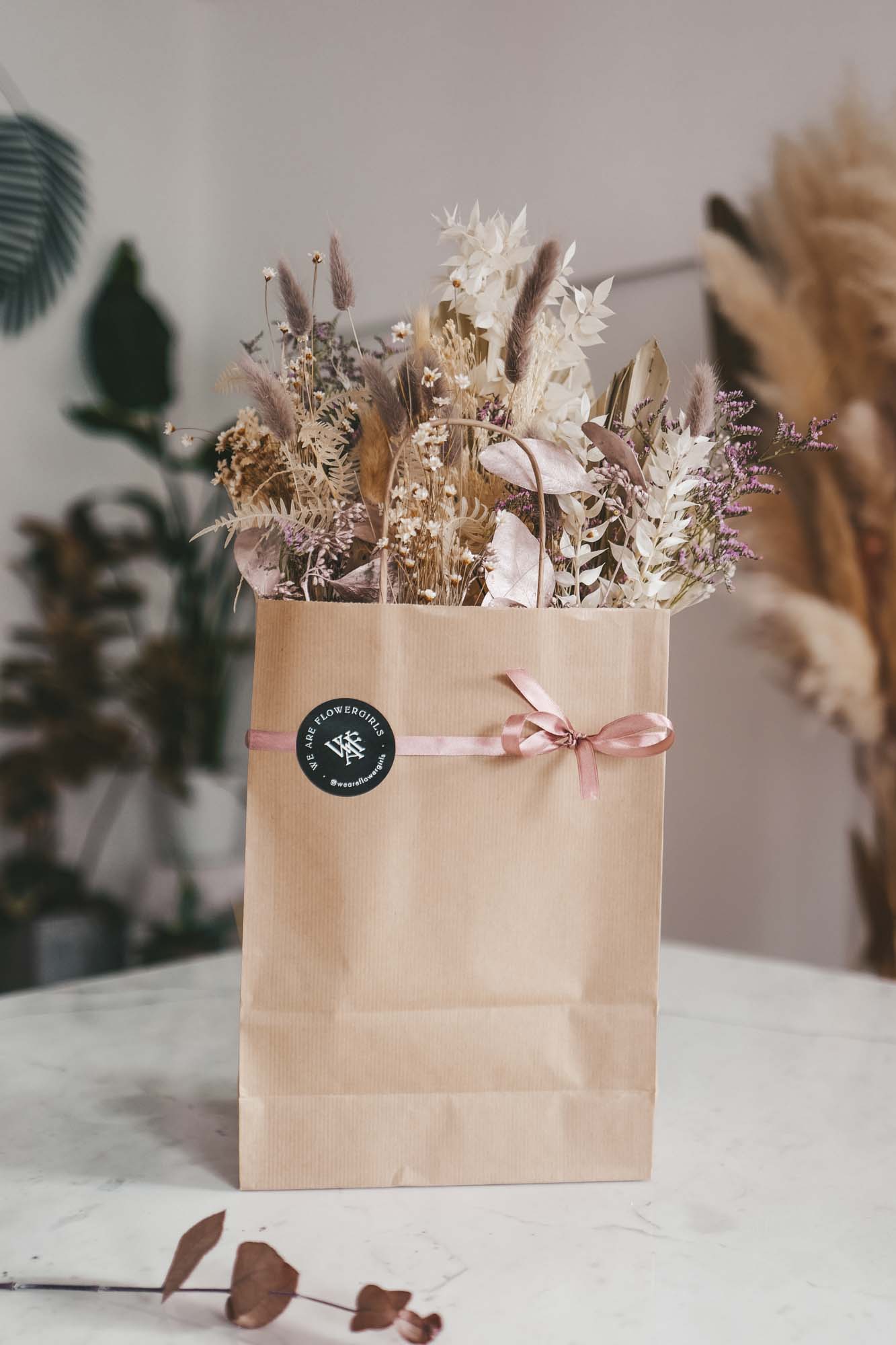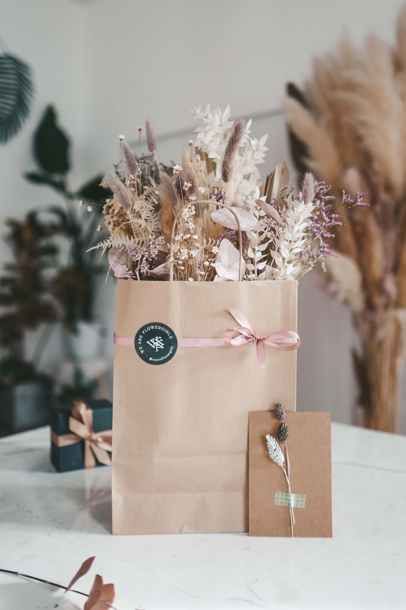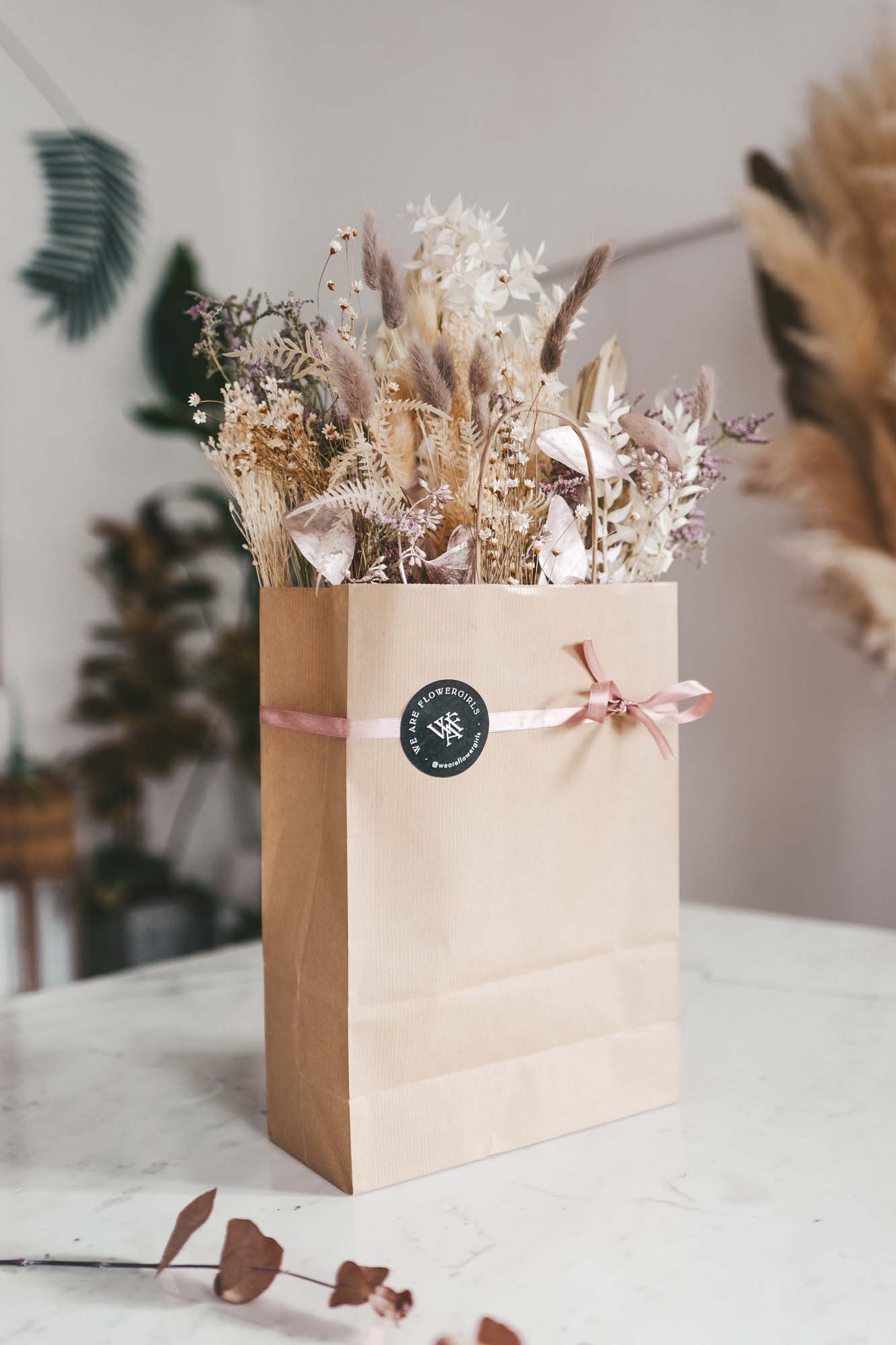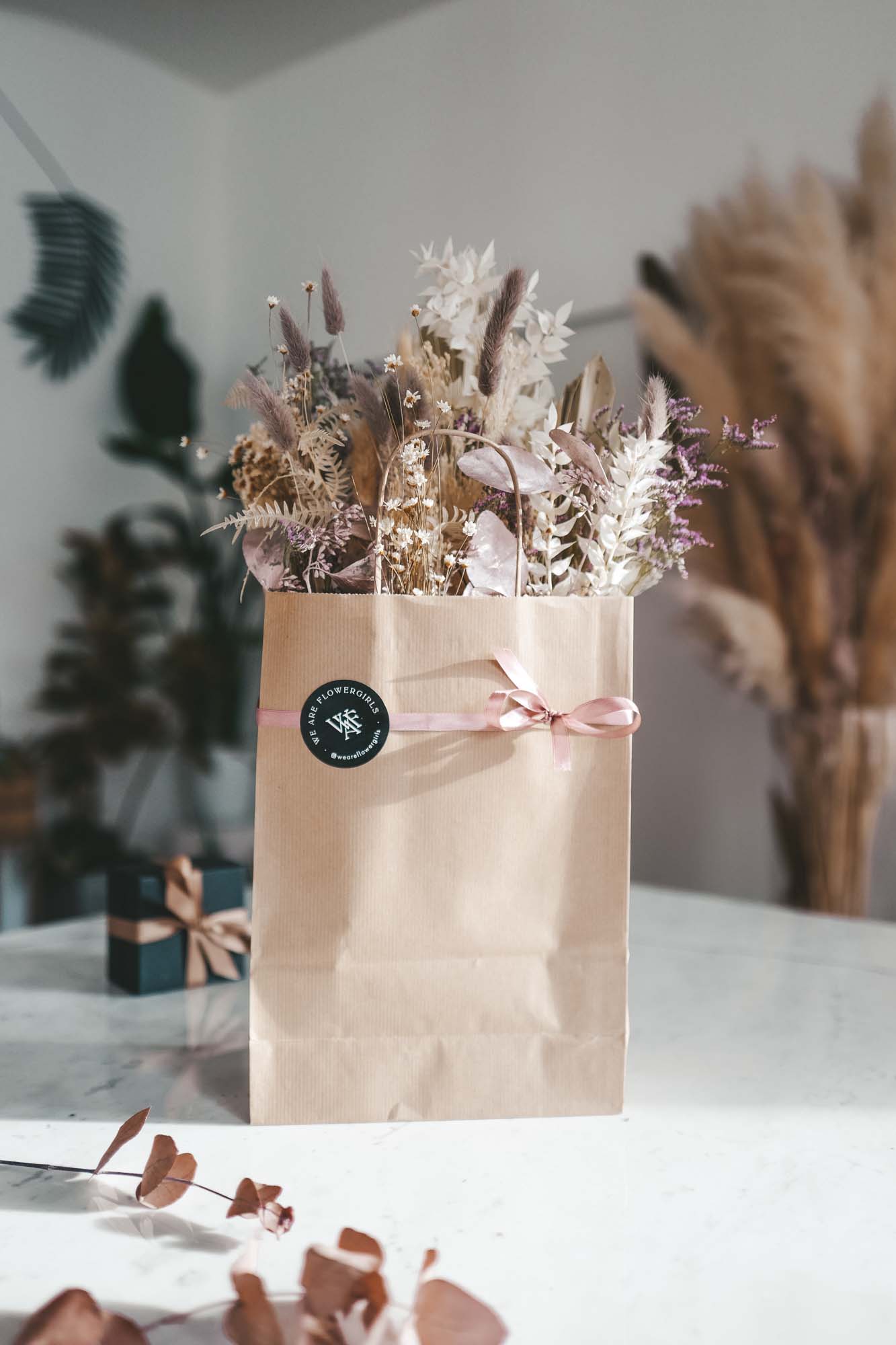 2. Wir versenden deine Flowerbag als DIY-Package. Du bekommst die recycelte Papiertasche gefüllt mit einem Trockensteckschwamm und die Trockenblumen in einer Box zum Selberstecken. Das Stecken ist ganz einfach. Arbeite dich von hinten nach vorne vor und für die genaue Anleitung schau bei uns auf Instagram vorbei.