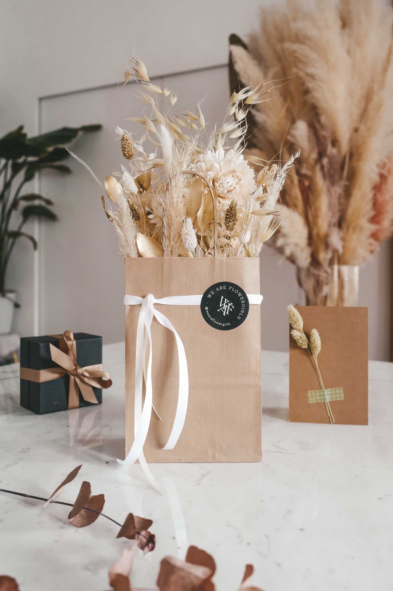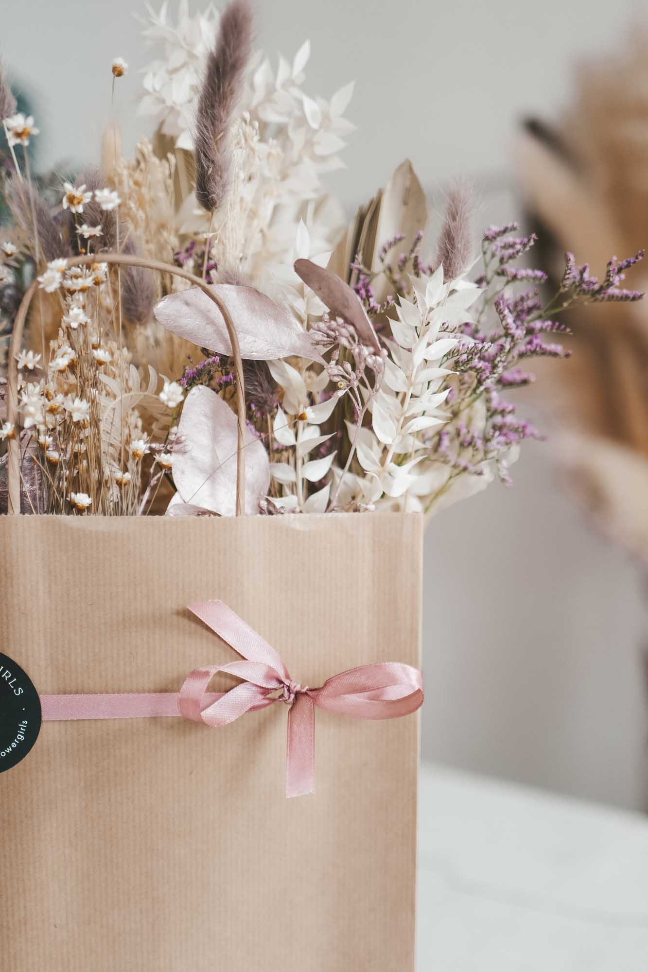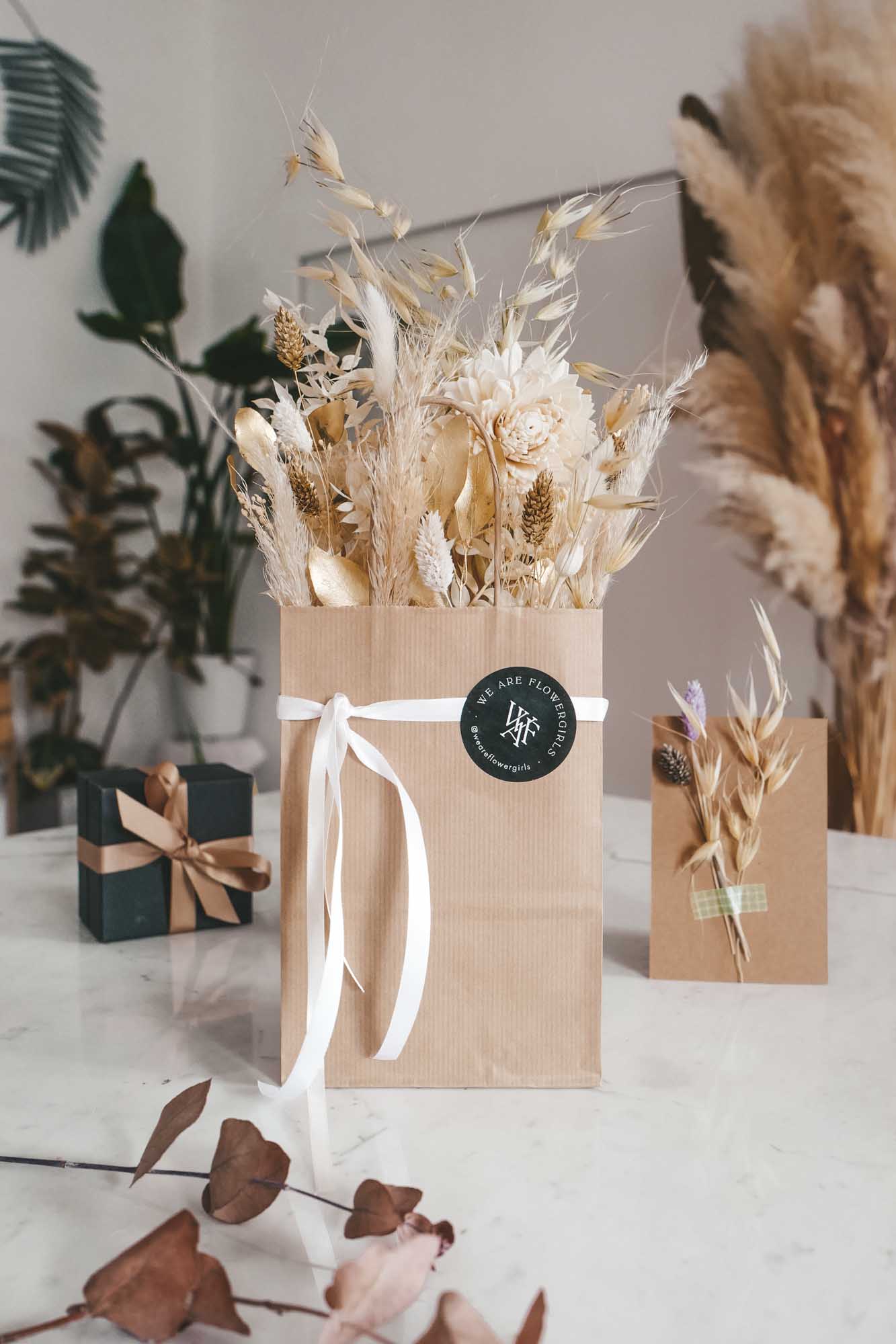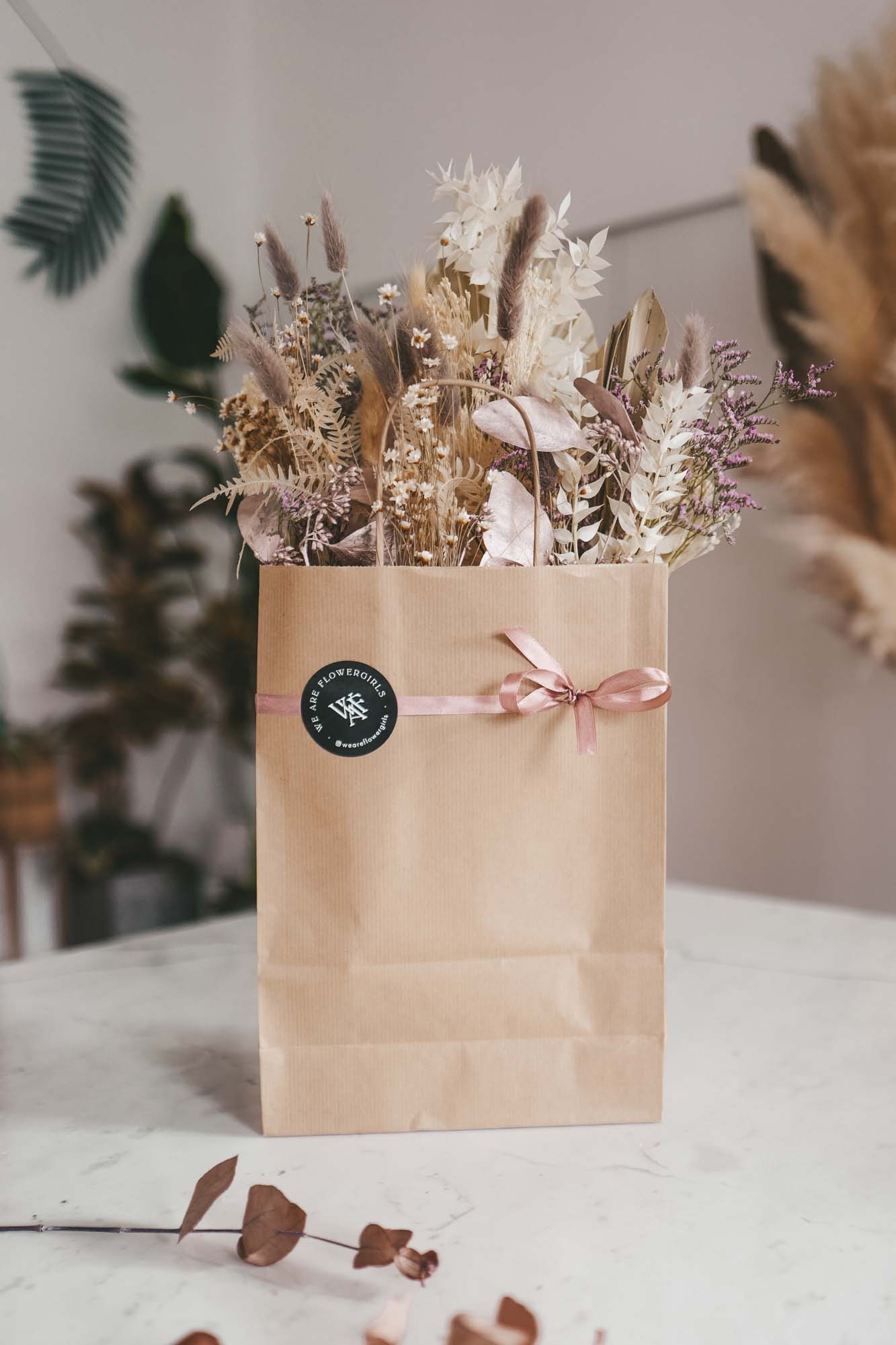 Inkl. sind die Bänder, eine Dried Flower Karte sowie die Papiertasche mit Dried Flowers.