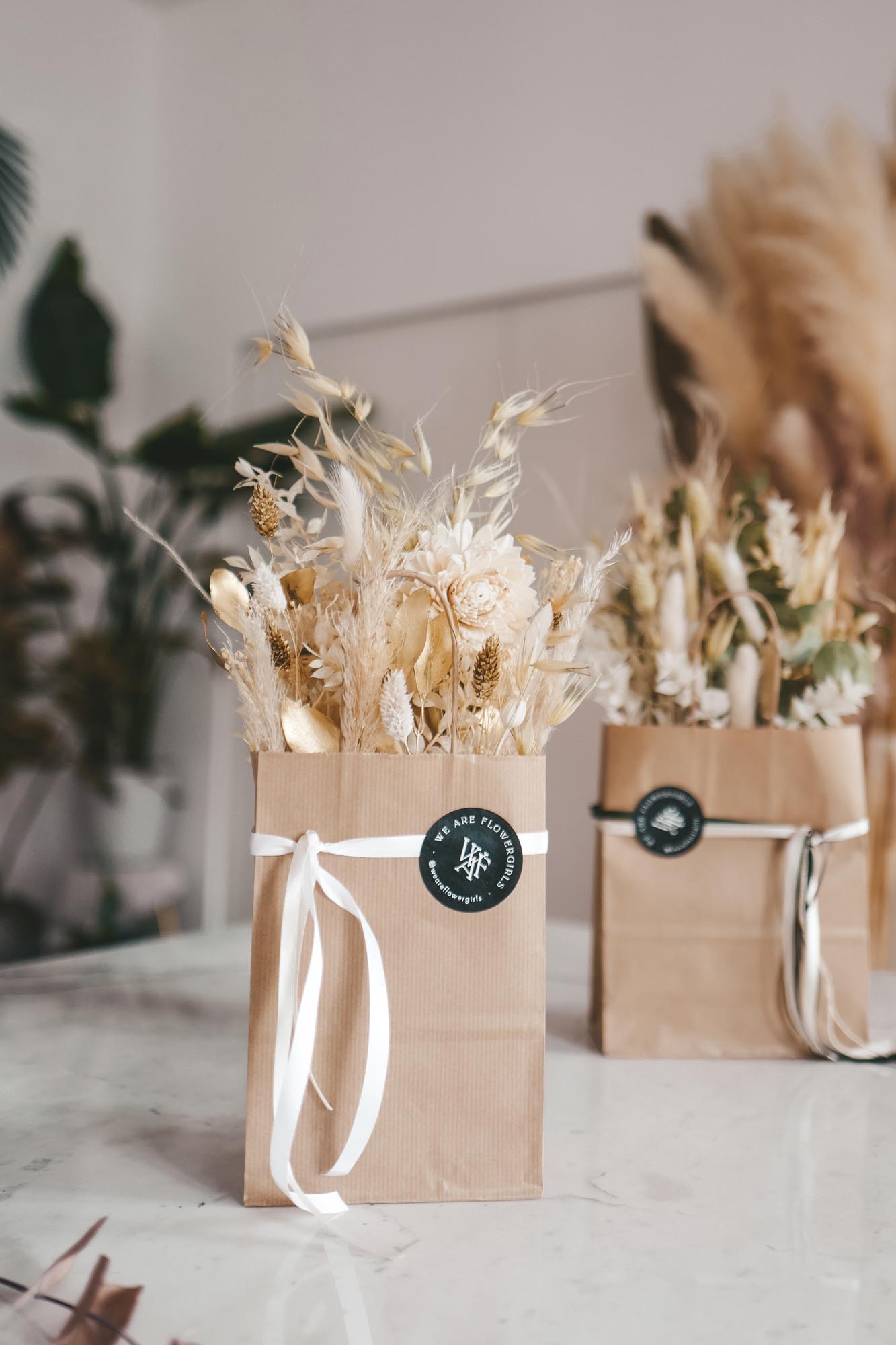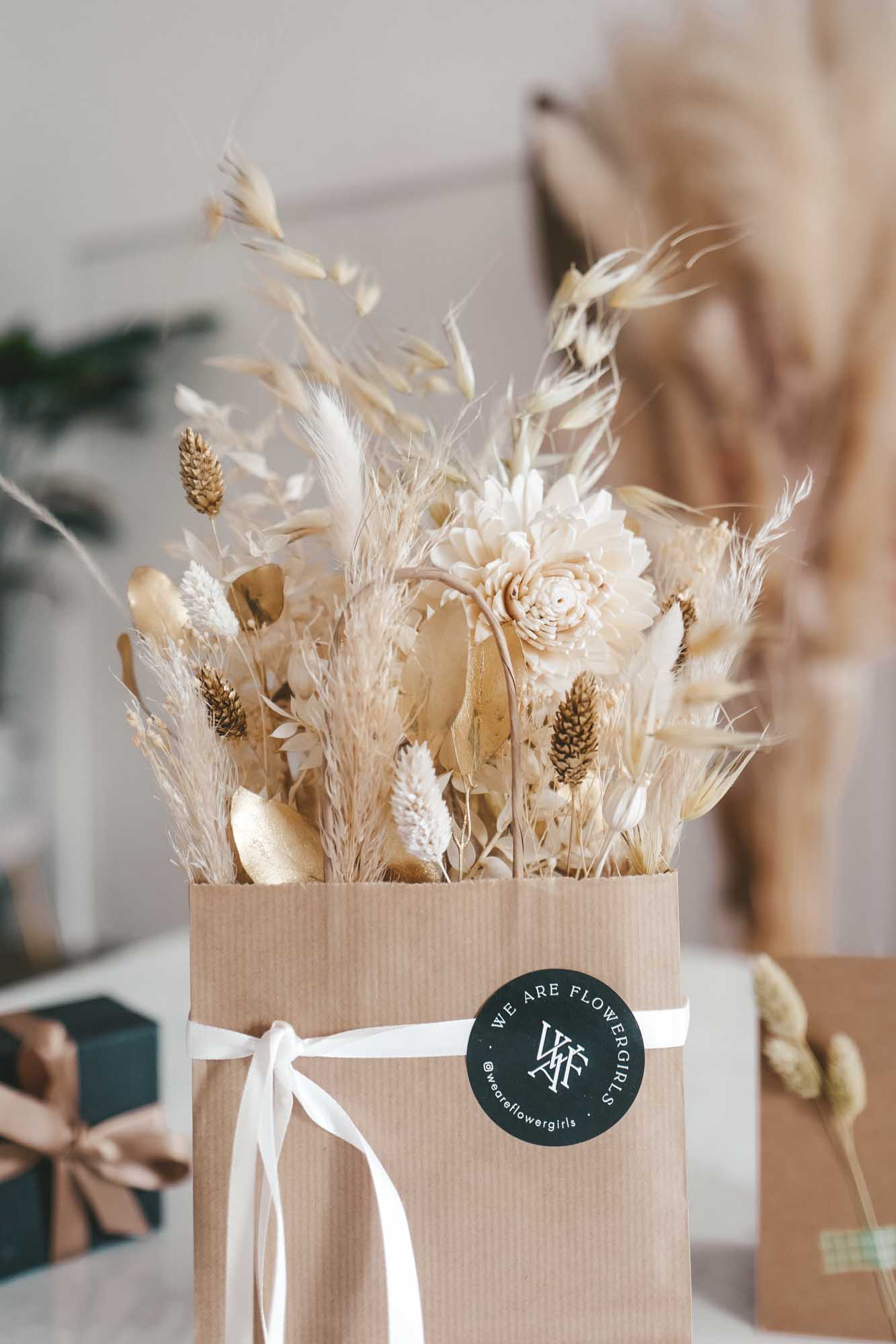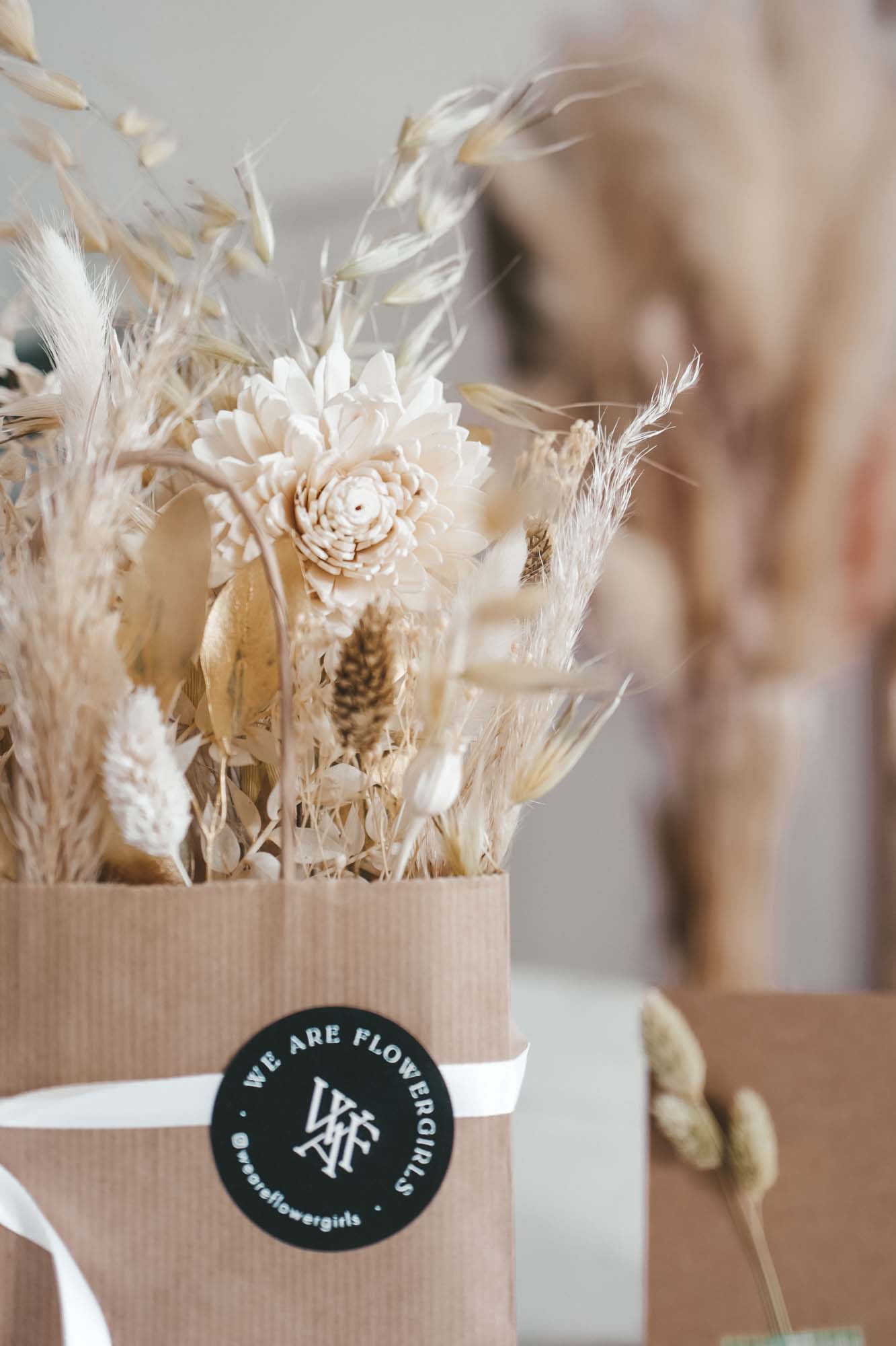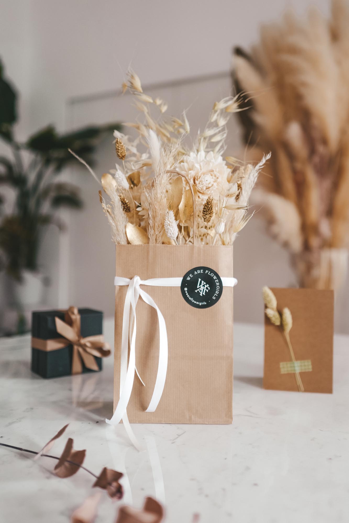 Inkl. sind die Bänder, eine Dried Flower Karte sowie die Papiertasche mit Dried Flowers.