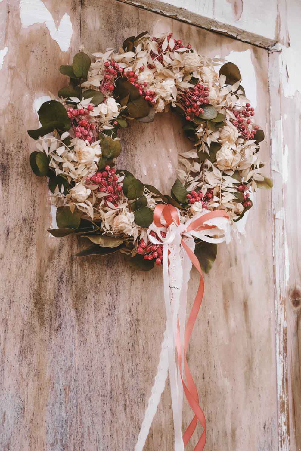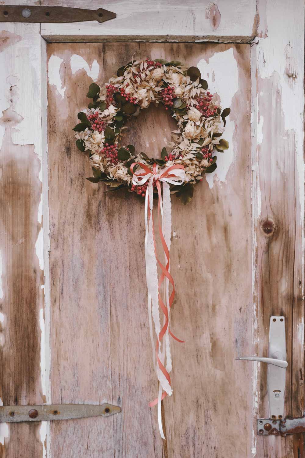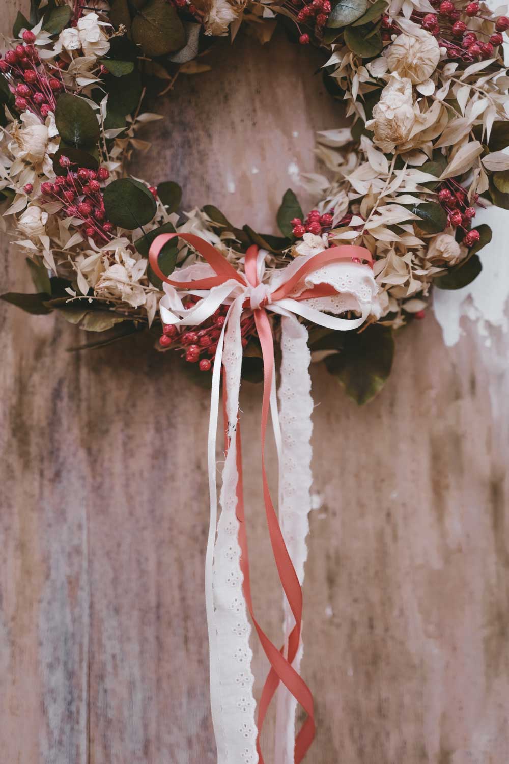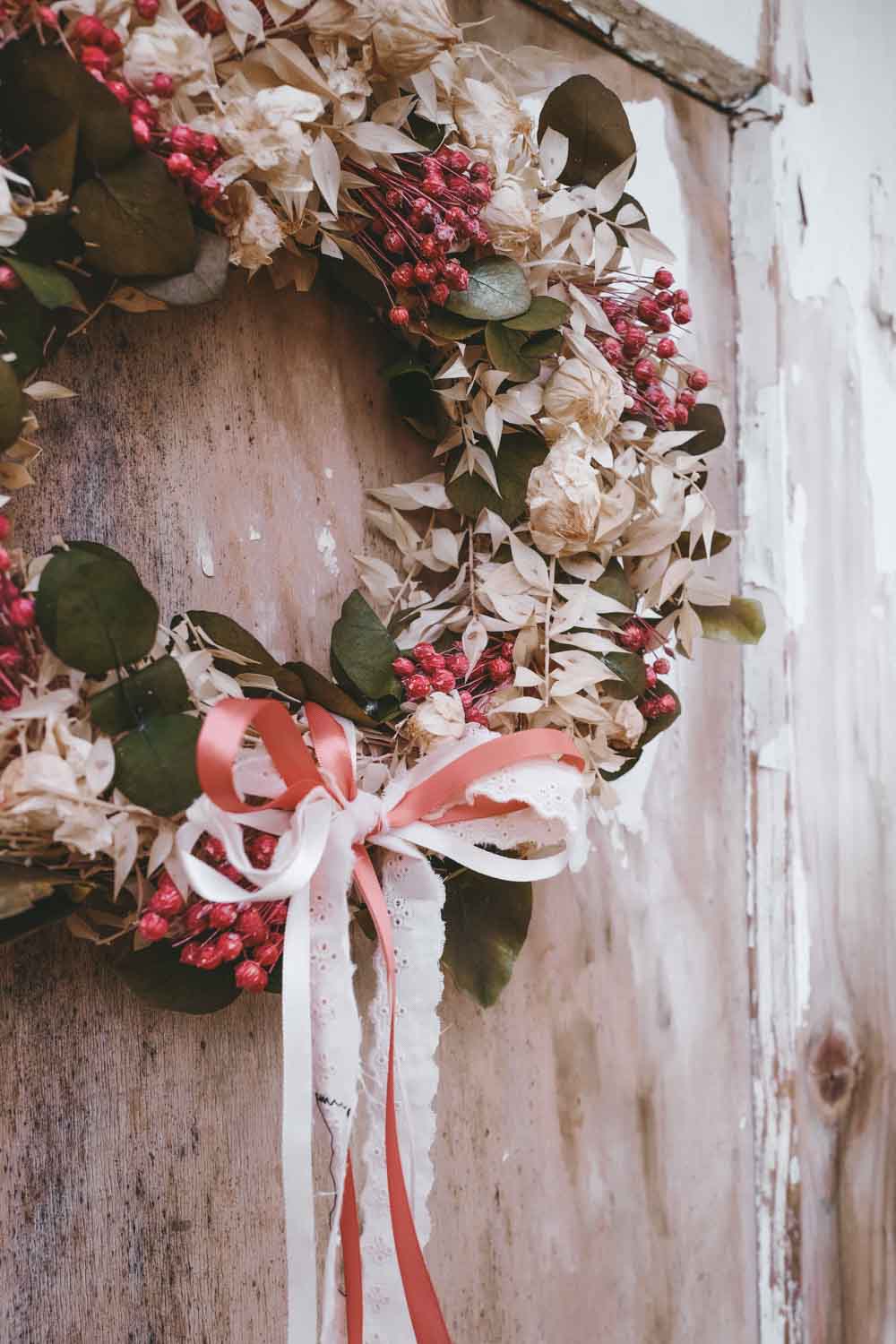 Du kannst den Look deines Dried Flower Wreaths im Handumdrehen jede Saison ändern. Einfach bei deinem stationären Stoffgeschäft oder Deko-Handel Bänder besorgen und immer wieder neue Farben und Bandstrukturen ausprobieren. Du kannst die Bänder ganz einfach in den Kranz einbinden oder mit einer Masche verzieren.