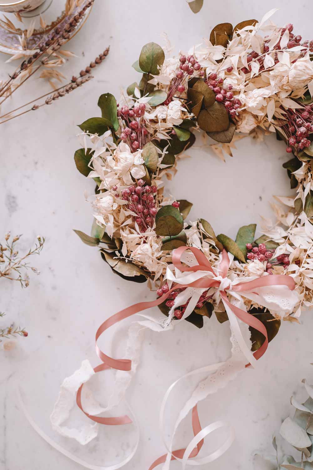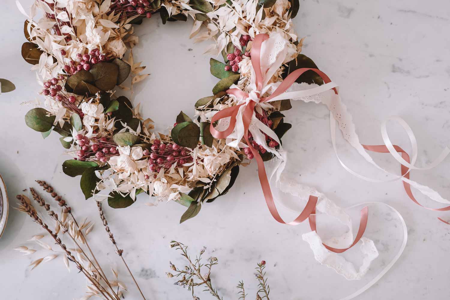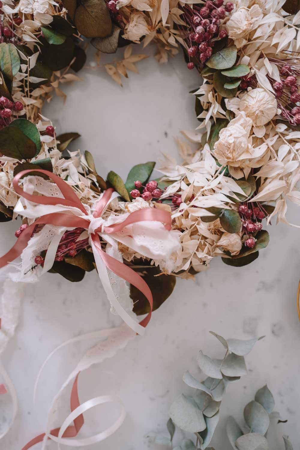 Du kannst den Look deines Dried Flower Wreaths im Handumdrehen jede Saison ändern. Einfach bei deinem stationären Stoffgeschäft oder Deko-Handel Bänder besorgen und immer wieder neue Farben und Bandstrukturen ausprobieren. Du kannst die Bänder ganz einfach in den Kranz einbinden oder mit einer Masche verzieren.