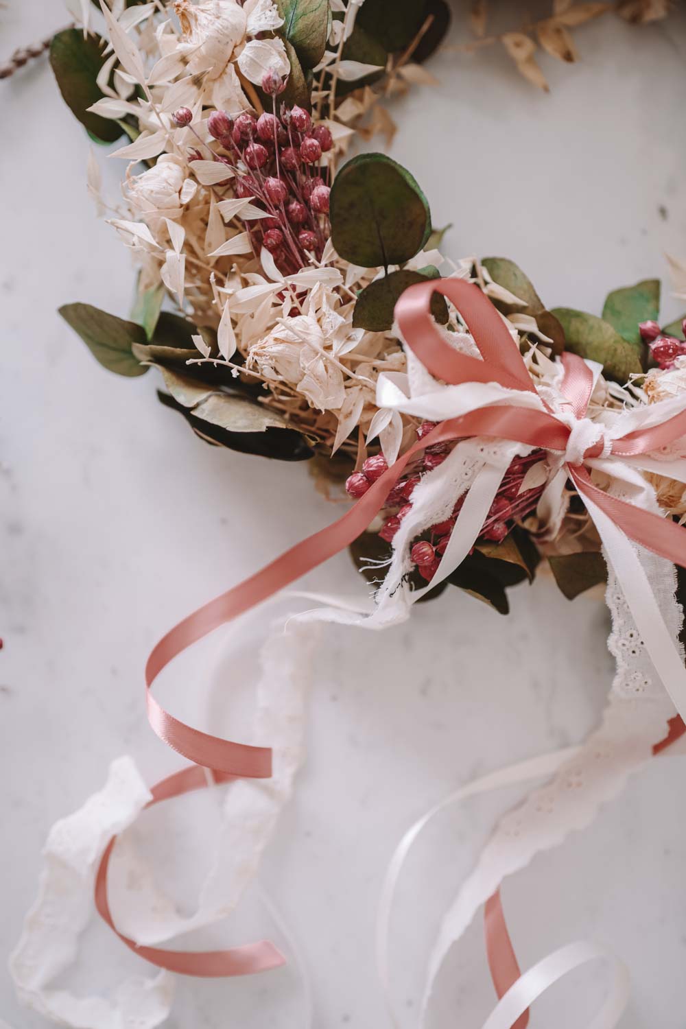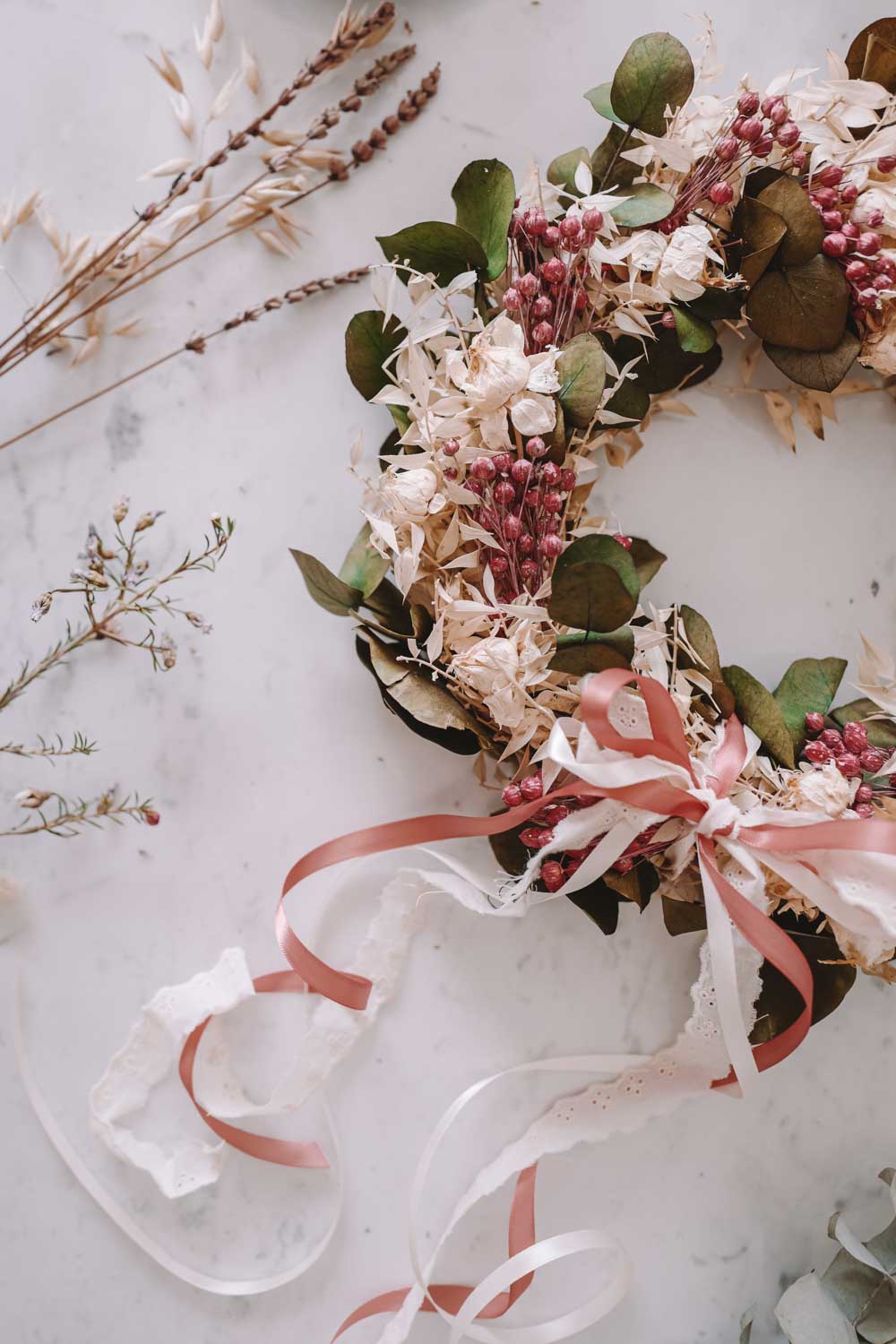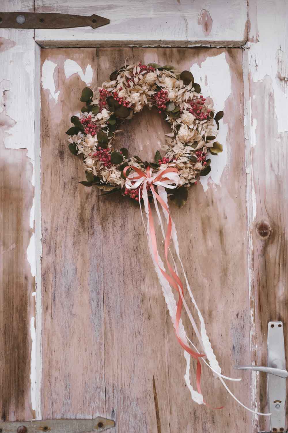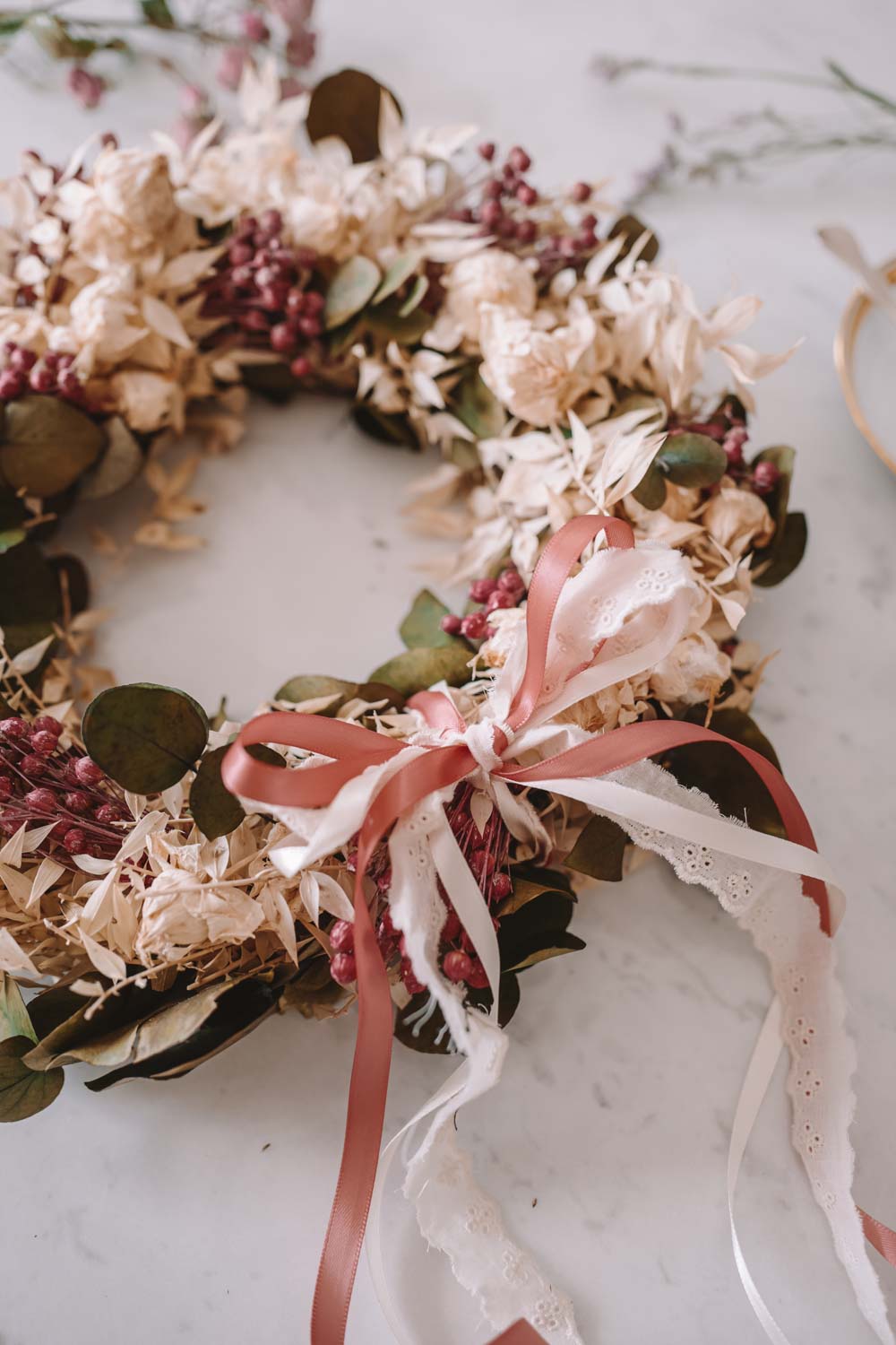 Du kannst den Look deines Dried Flower Wreaths im Handumdrehen jede Saison ändern. Einfach bei deinem stationären Stoffgeschäft oder Deko-Handel Bänder besorgen und immer wieder neue Farben und Bandstrukturen ausprobieren. Du kannst die Bänder ganz einfach in den Kranz einbinden oder mit einer Masche verzieren.