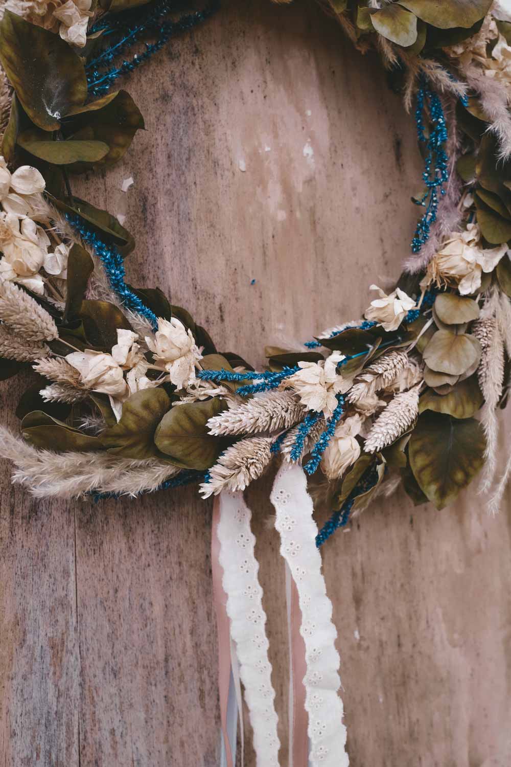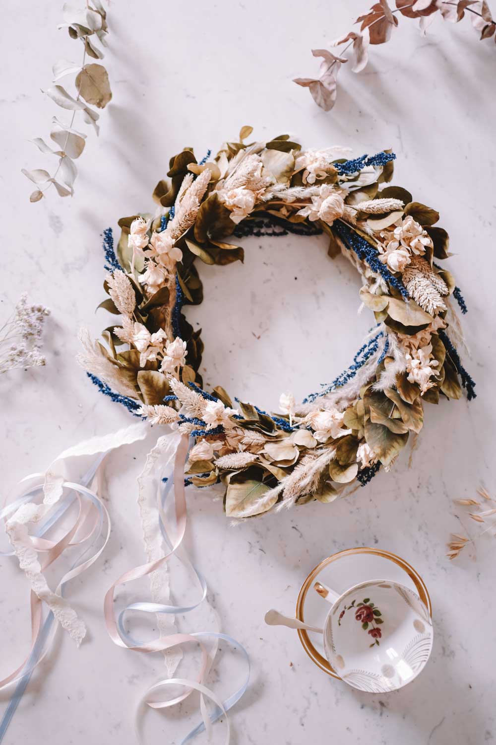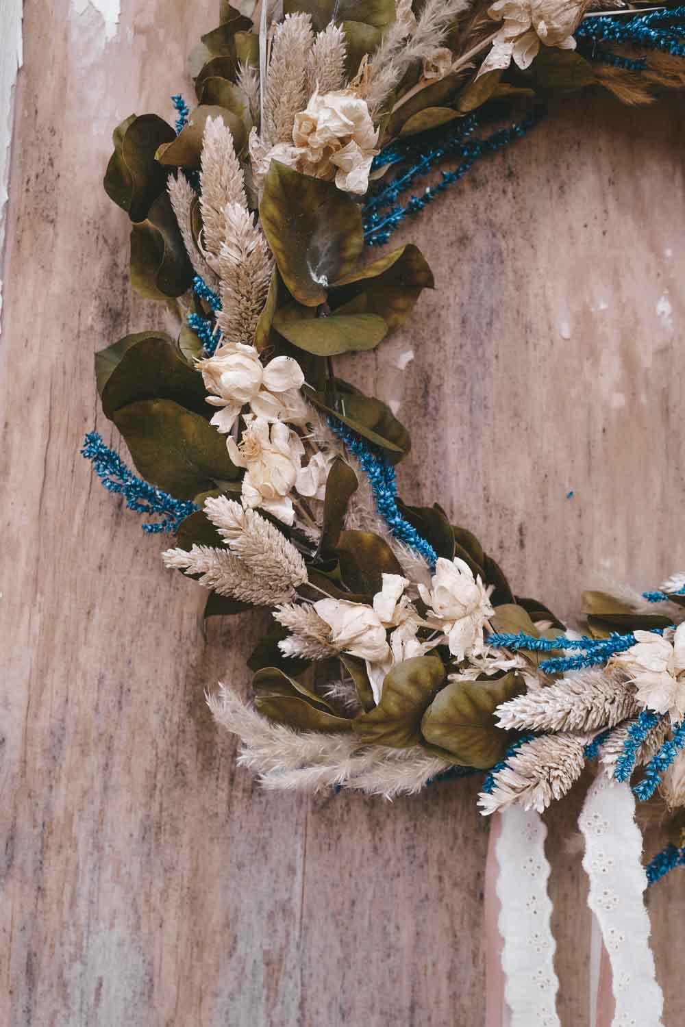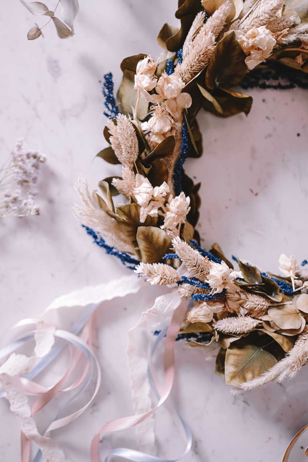 Du kannst den Look deines Dried Flower Wreaths im Handumdrehen jede Saison ändern. Einfach bei deinem stationären Stoffgeschäft oder Deko-Handel Bänder besorgen und immer wieder neue Farben und Bandstrukturen ausprobieren. Du kannst die Bänder ganz einfach in den Kranz einbinden oder mit einer Masche verzieren.