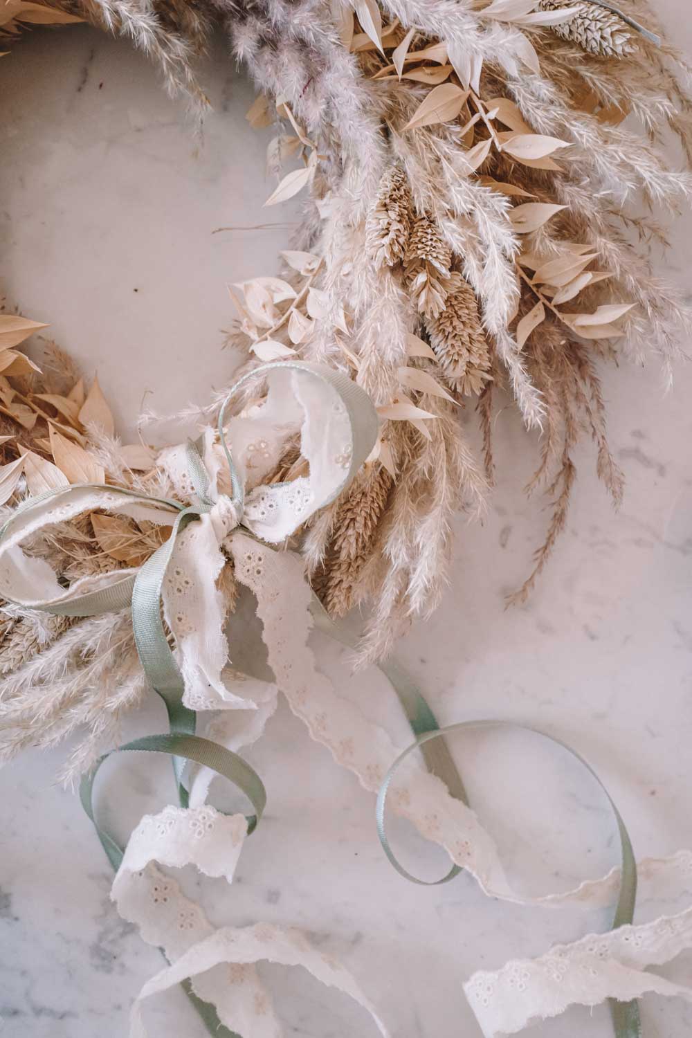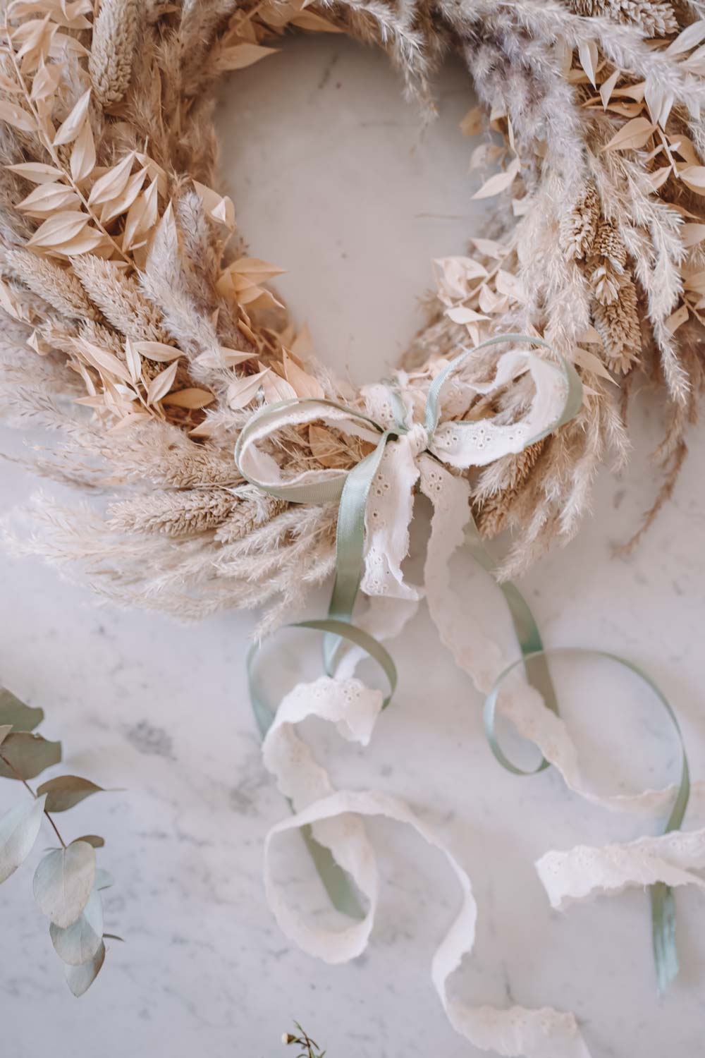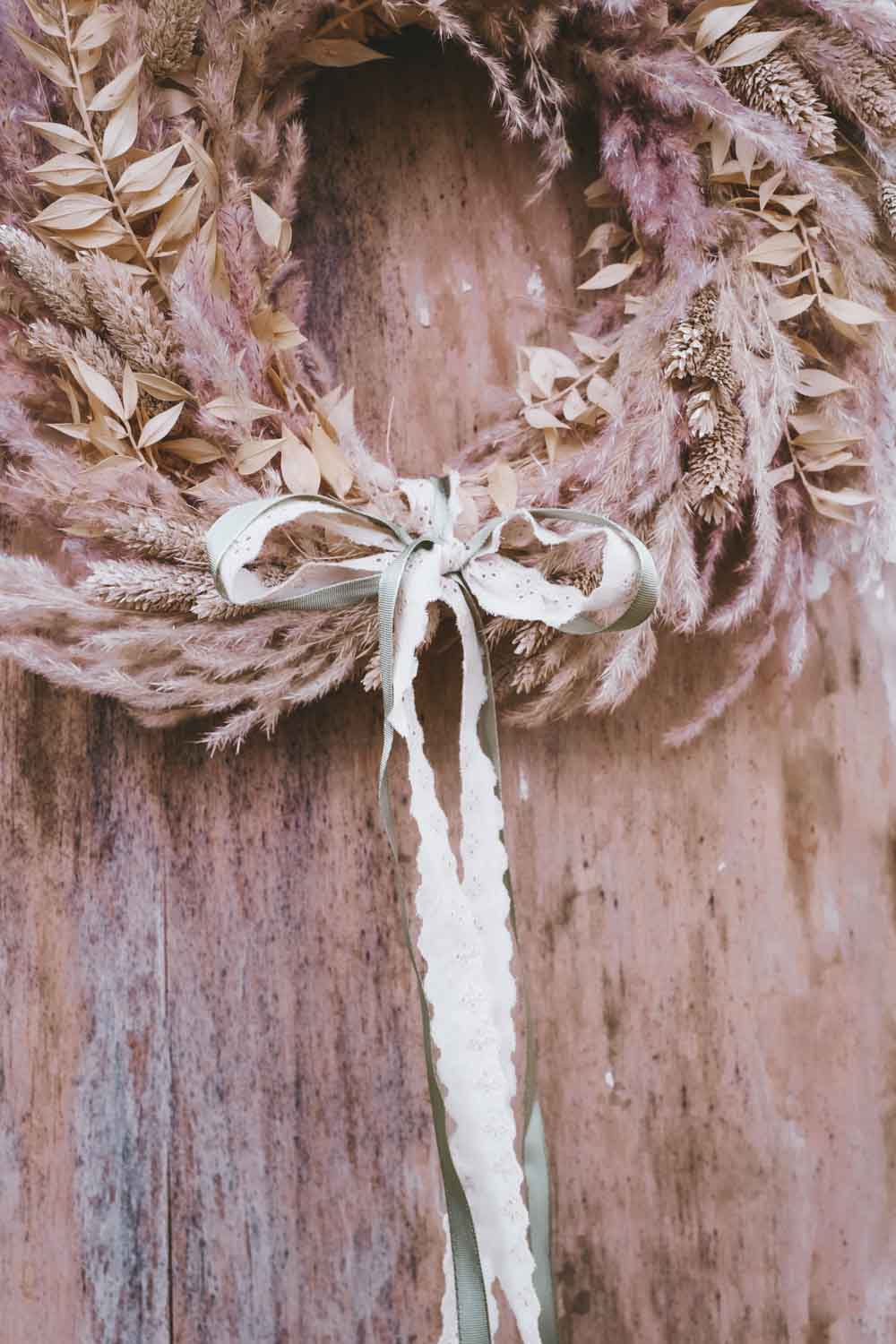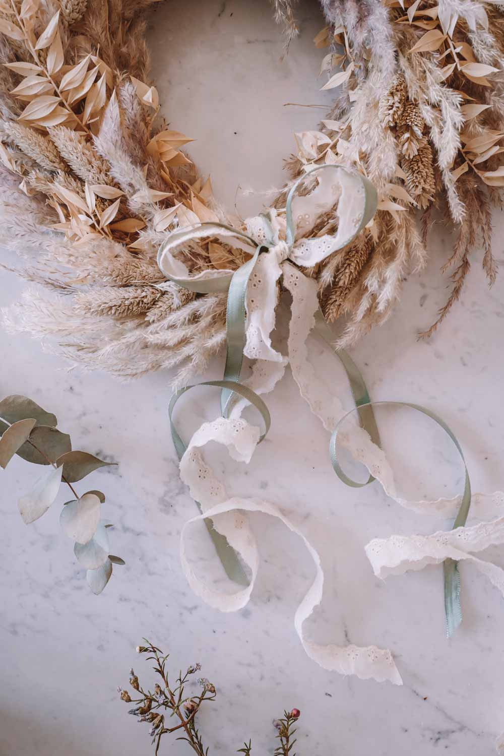Du kannst den Look deines Dried Flower Wreaths im Handumdrehen jede Saison ändern. Einfach bei deinem stationären Stoffgeschäft oder Deko-Handel Bänder besorgen und immer wieder neue Farben und Bandstrukturen ausprobieren. Du kannst die Bänder ganz einfach in den Kranz einbinden oder mit einer Masche verzieren.