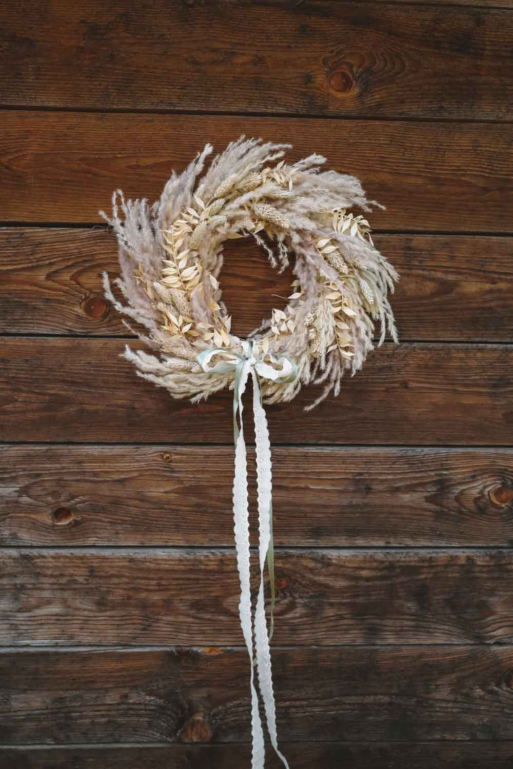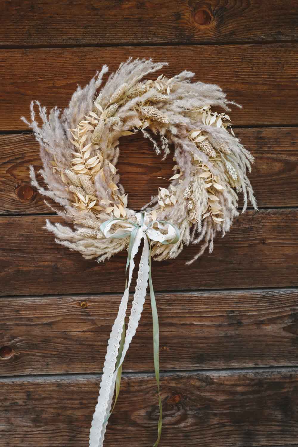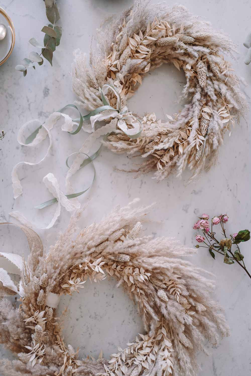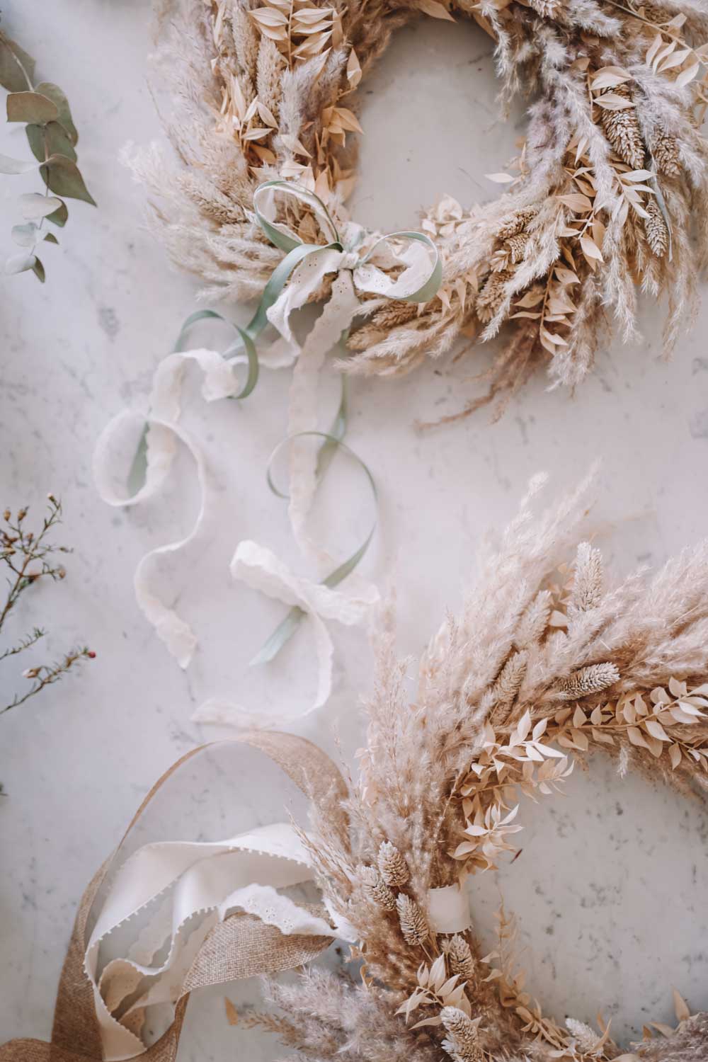 Du kannst den Look deines Dried Flower Wreaths im Handumdrehen jede Saison ändern. Einfach bei deinem stationären Stoffgeschäft oder Deko-Handel Bänder besorgen und immer wieder neue Farben und Bandstrukturen ausprobieren. Du kannst die Bänder ganz einfach in den Kranz einbinden oder mit einer Masche verzieren.
