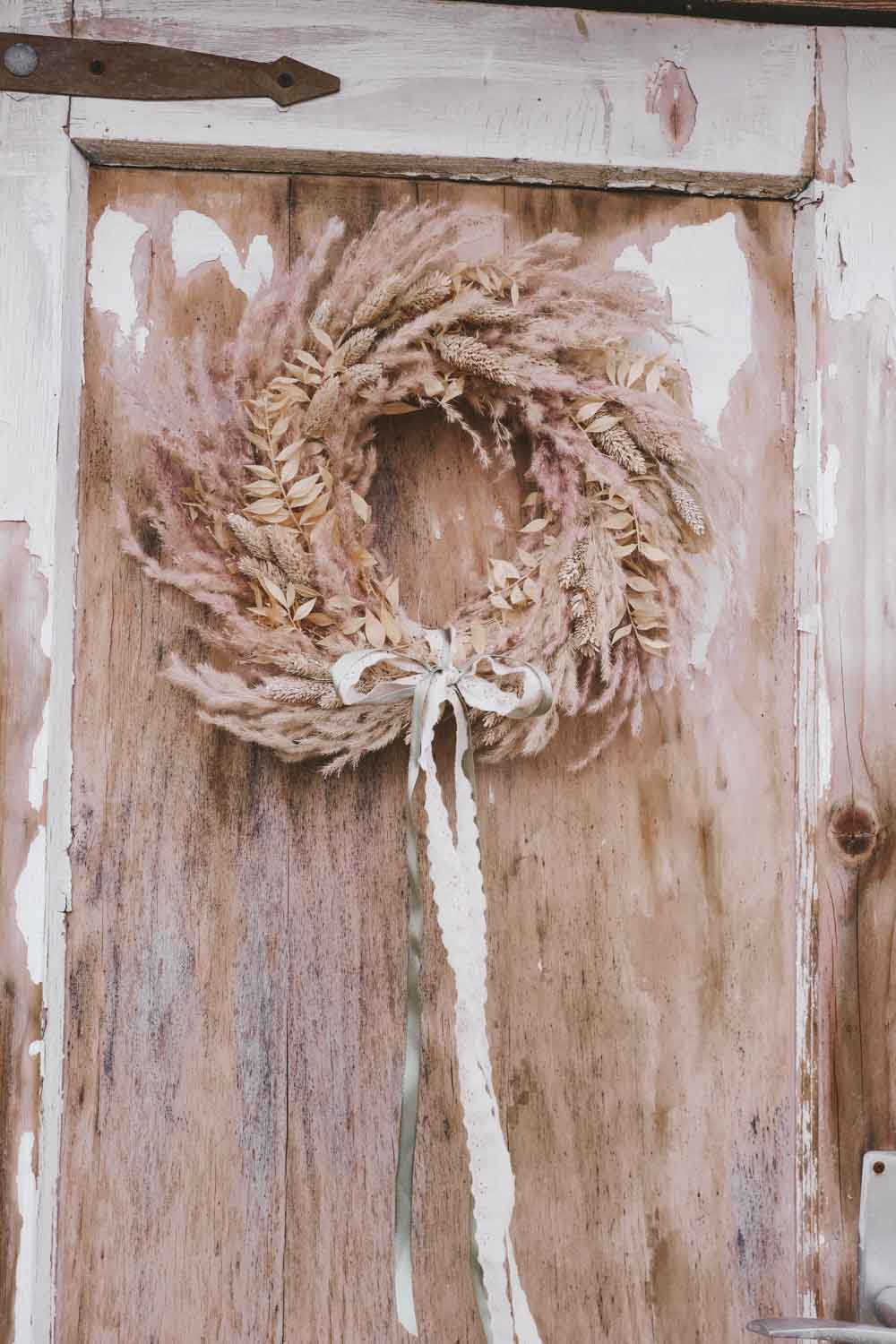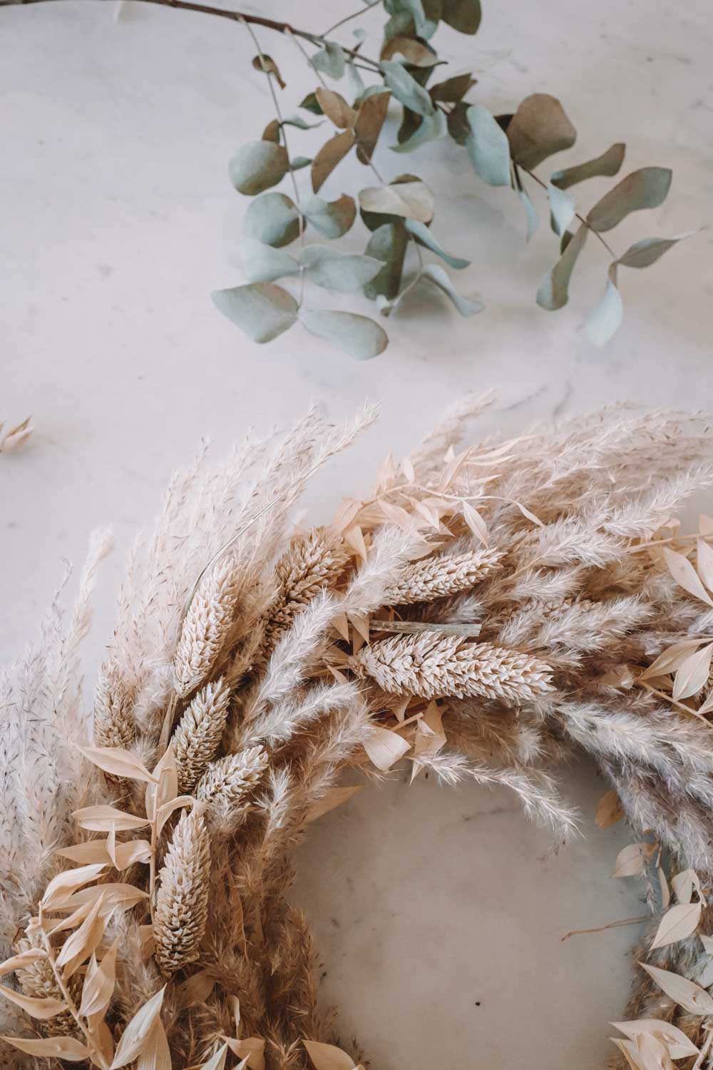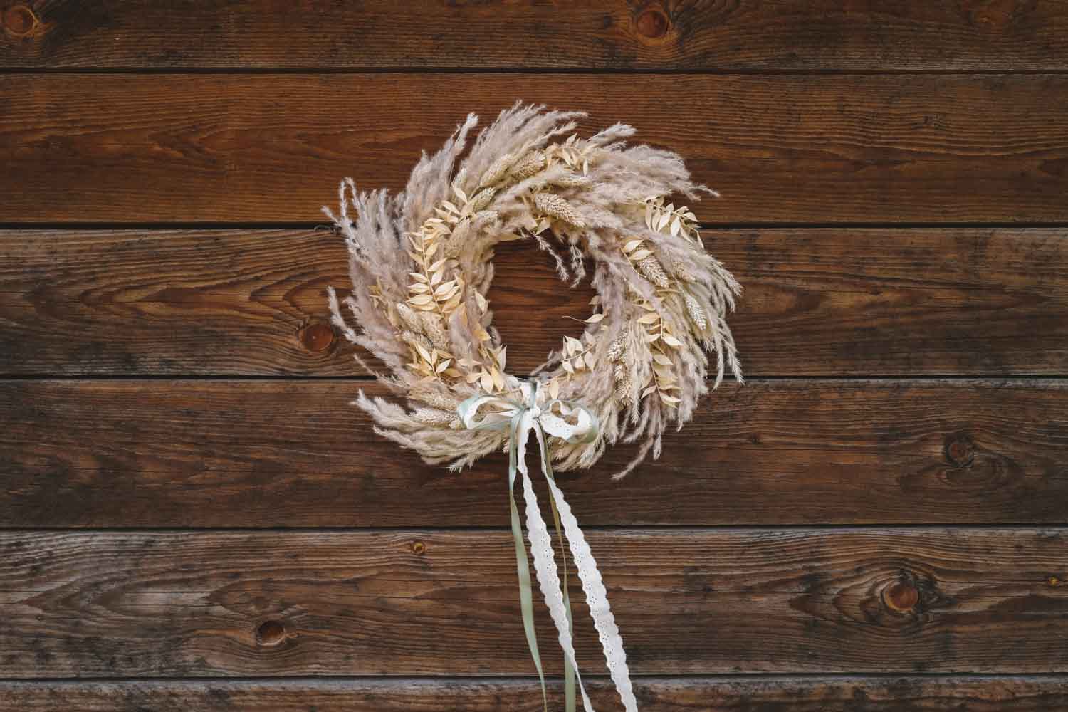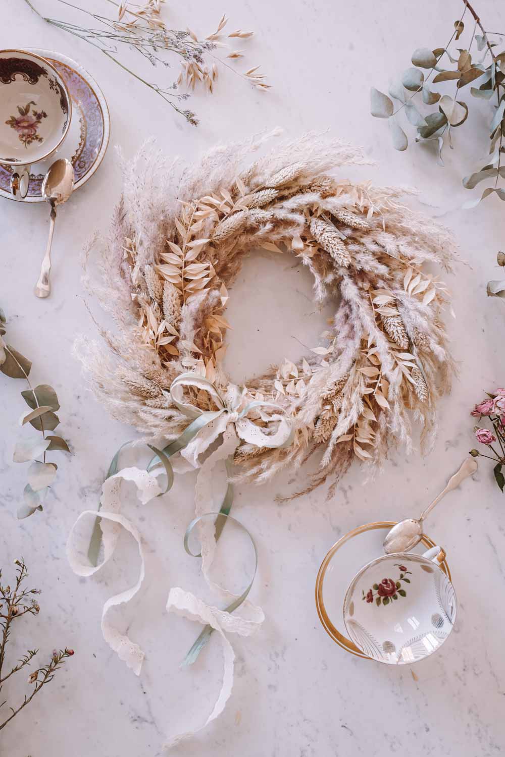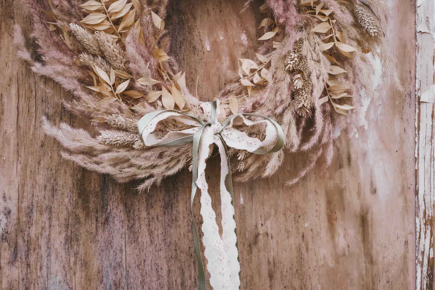 Du kannst den Look deines Dried Flower Wreaths im Handumdrehen jede Saison ändern. Einfach bei deinem stationären Stoffgeschäft oder Deko-Handel Bänder besorgen und immer wieder neue Farben und Bandstrukturen ausprobieren. Du kannst die Bänder ganz einfach in den Kranz einbinden oder mit einer Masche verzieren.