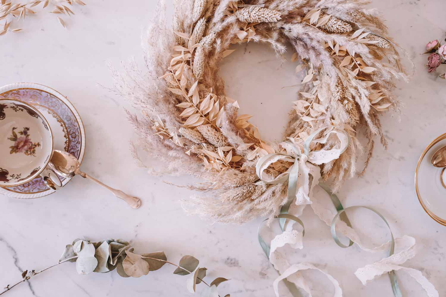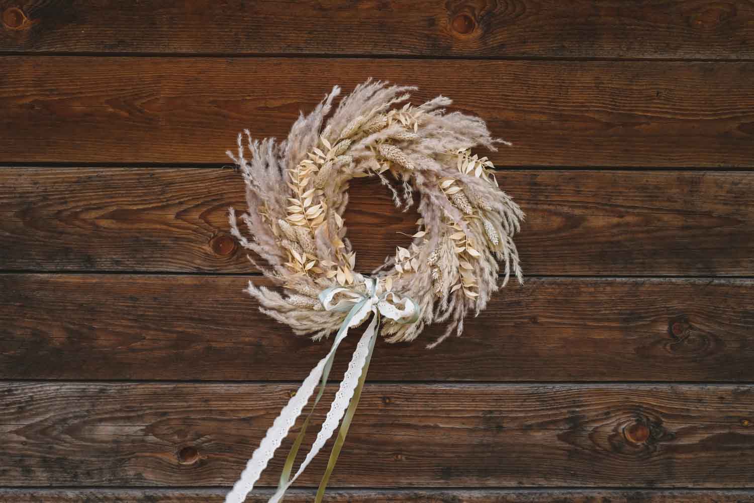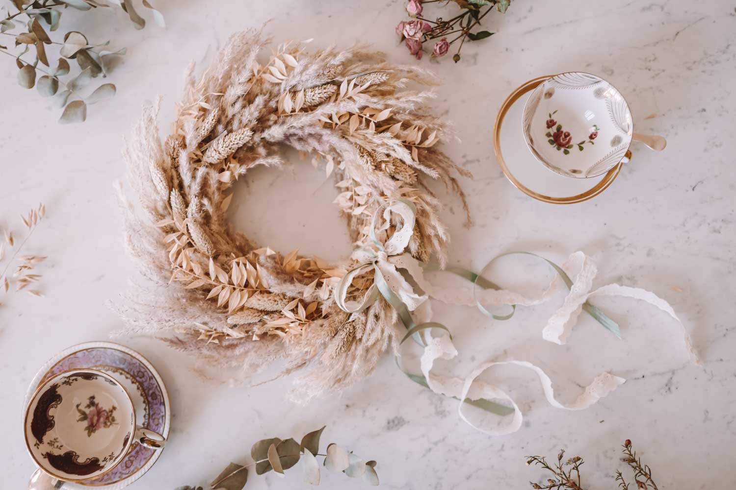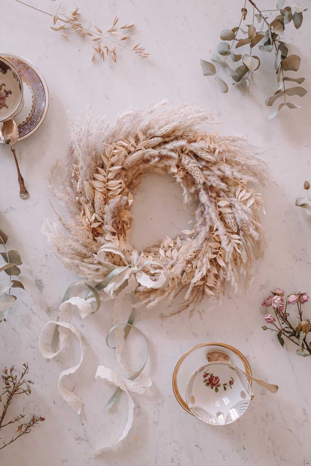 Du kannst den Look deines Dried Flower Wreaths im Handumdrehen jede Saison ändern. Einfach bei deinem stationären Stoffgeschäft oder Deko-Handel Bänder besorgen und immer wieder neue Farben und Bandstrukturen ausprobieren. Du kannst die Bänder ganz einfach in den Kranz einbinden oder mit einer Masche verzieren.