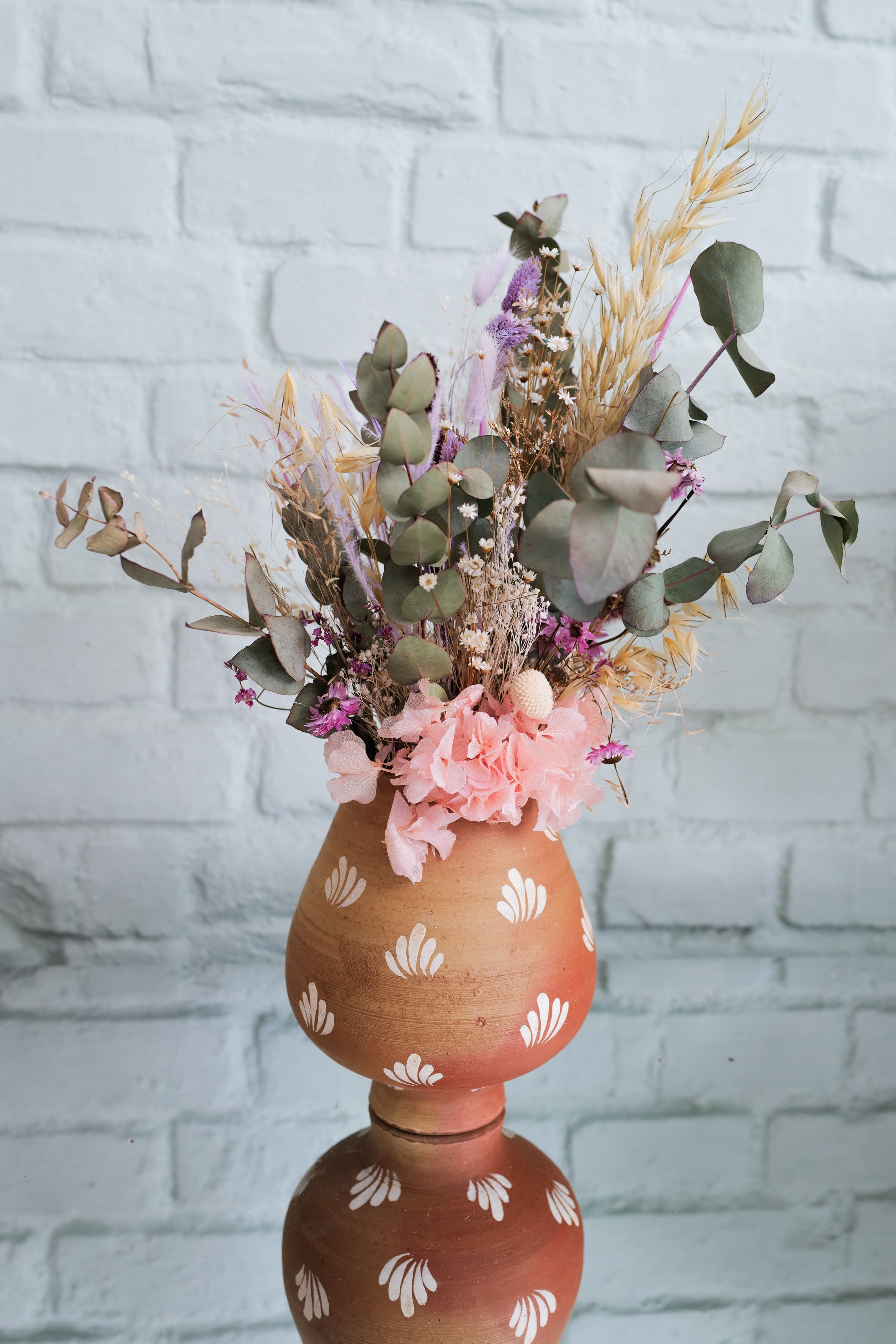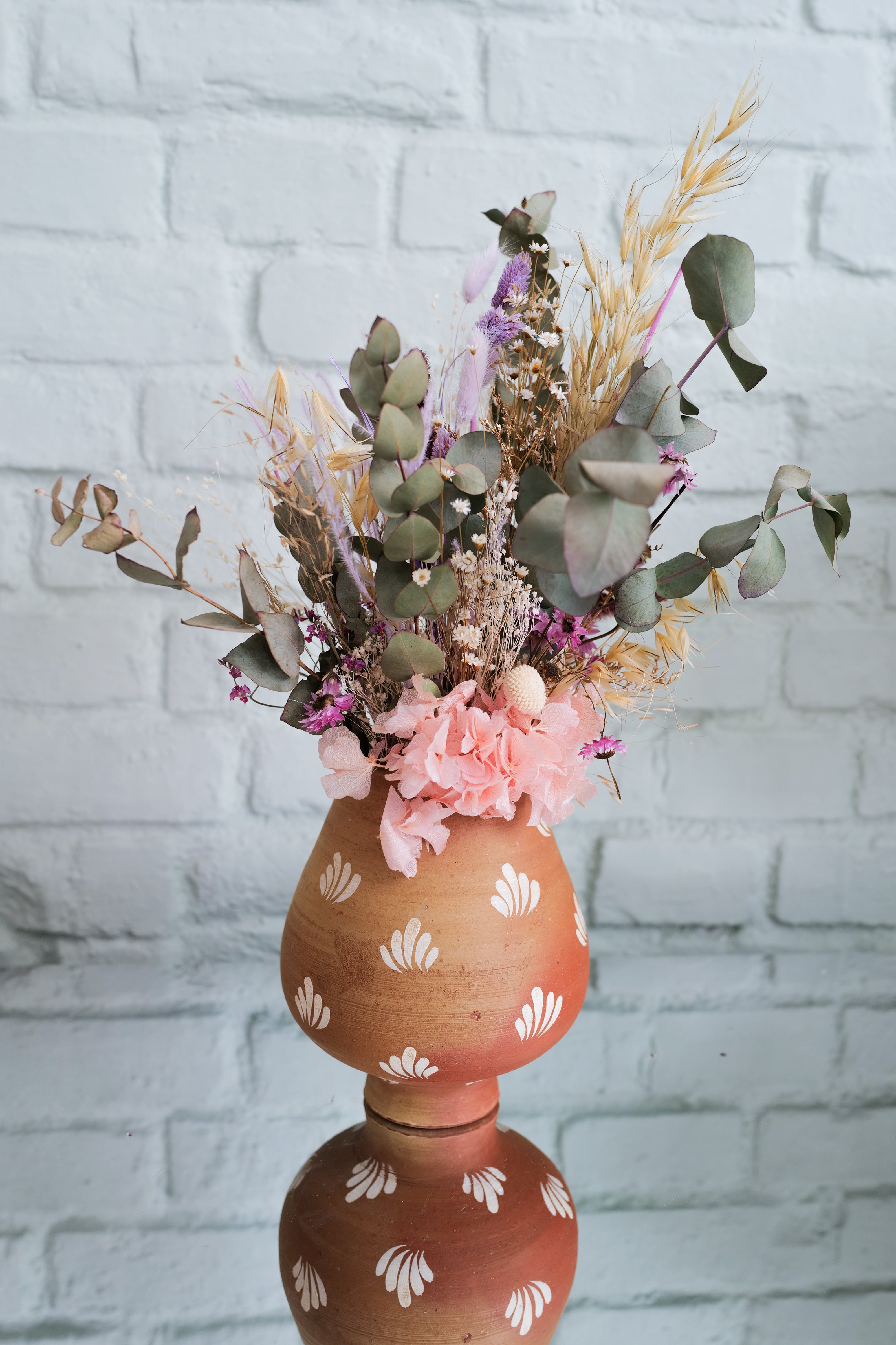Dieses Stück ist bereits in eine Vase gepflanzt und kommt so als fertige Home-Decor zu dir. Stabilisierte Holz-Blume trifft auf konservierte und getrocknete Blumen und Gräser. So hält dein Strauss ein Leben lang.