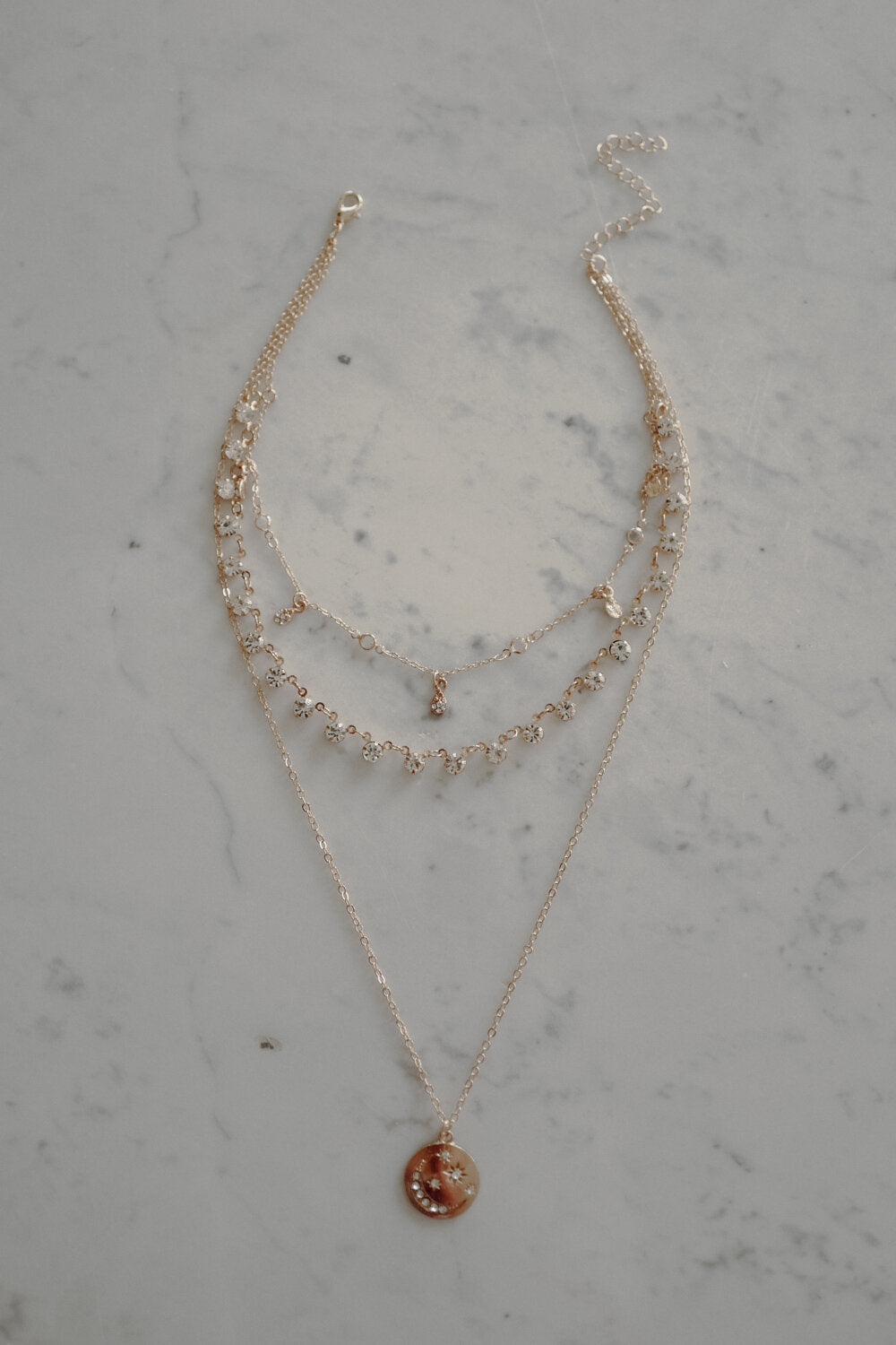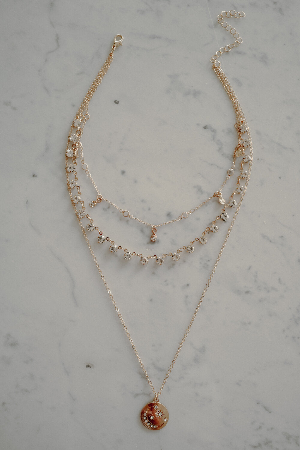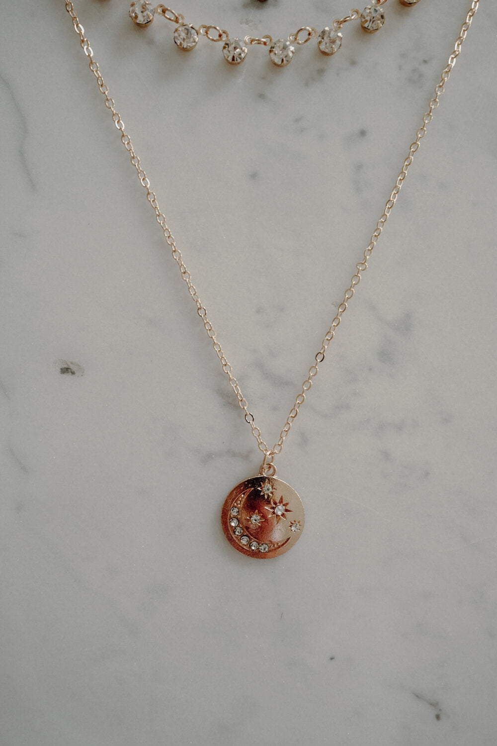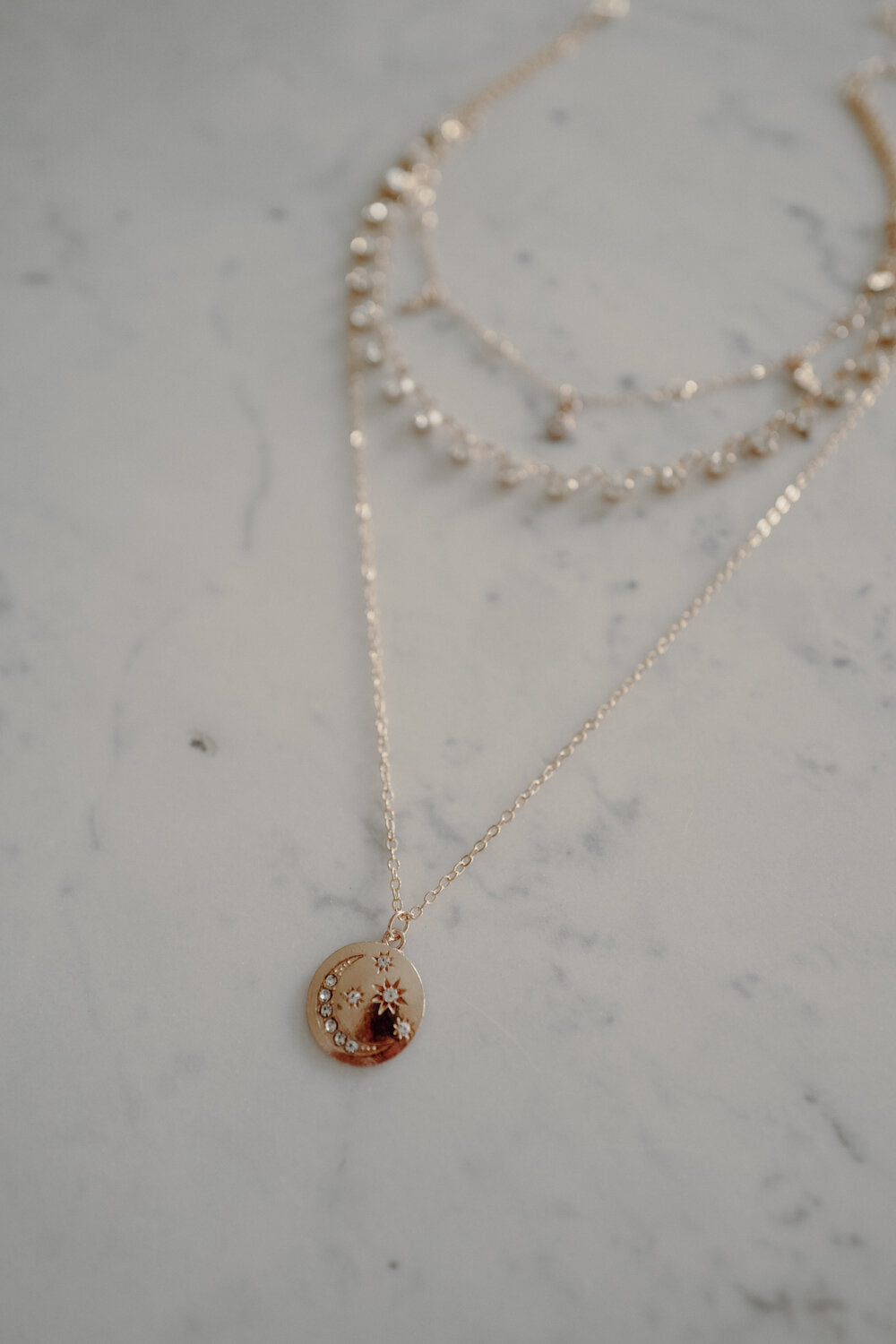 Unsere Fly Away Necklace ist eine 2-reihige Statement-Kette mit verschiedenen Himmels-Anhängern.