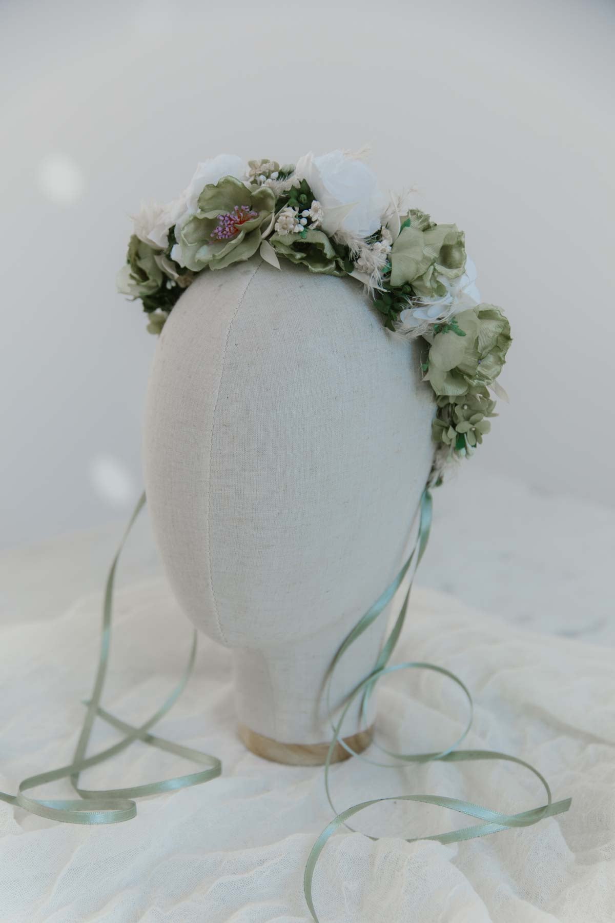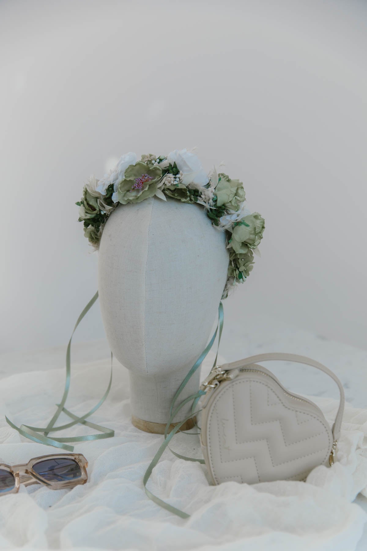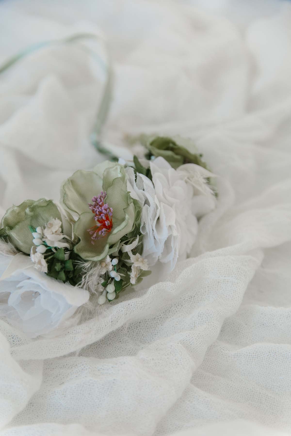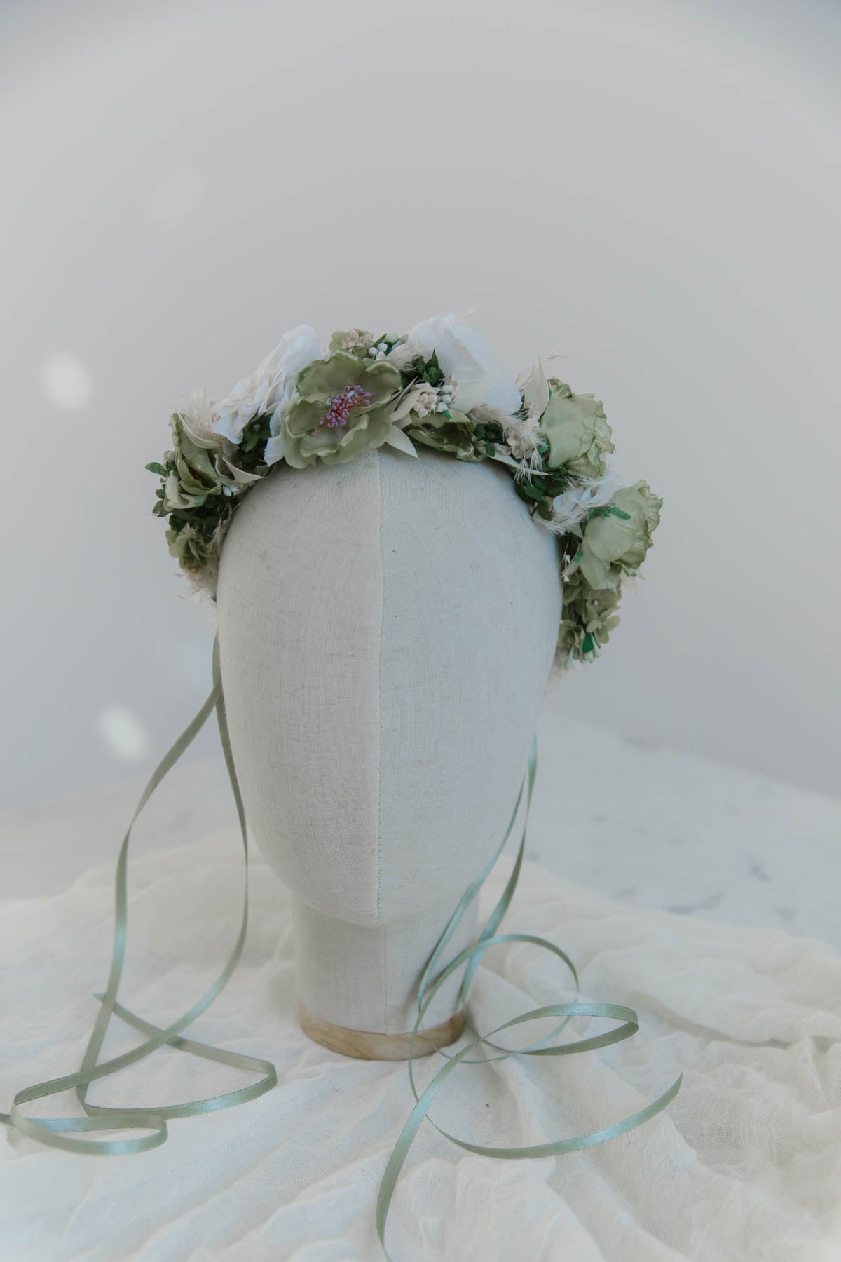 Flowercrown Adeen ist eine romantische Blumenkrone für die Ewigkeit die niemals verblüht. Handgemacht in Wien aus vintage Seidenblumen im Wiener Atelier von We Are Flowergirls. Zum Binden mit Satinbändern aus der Schweiz.