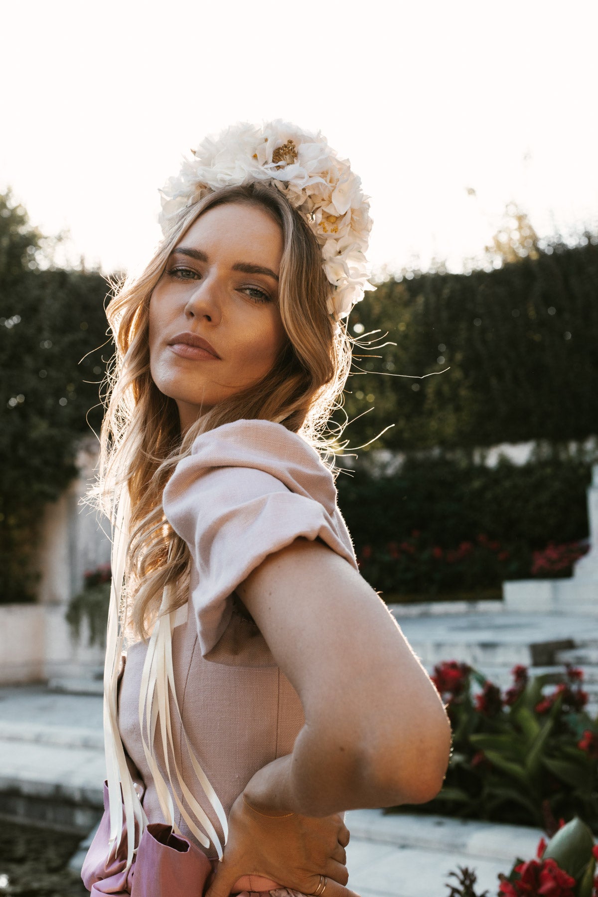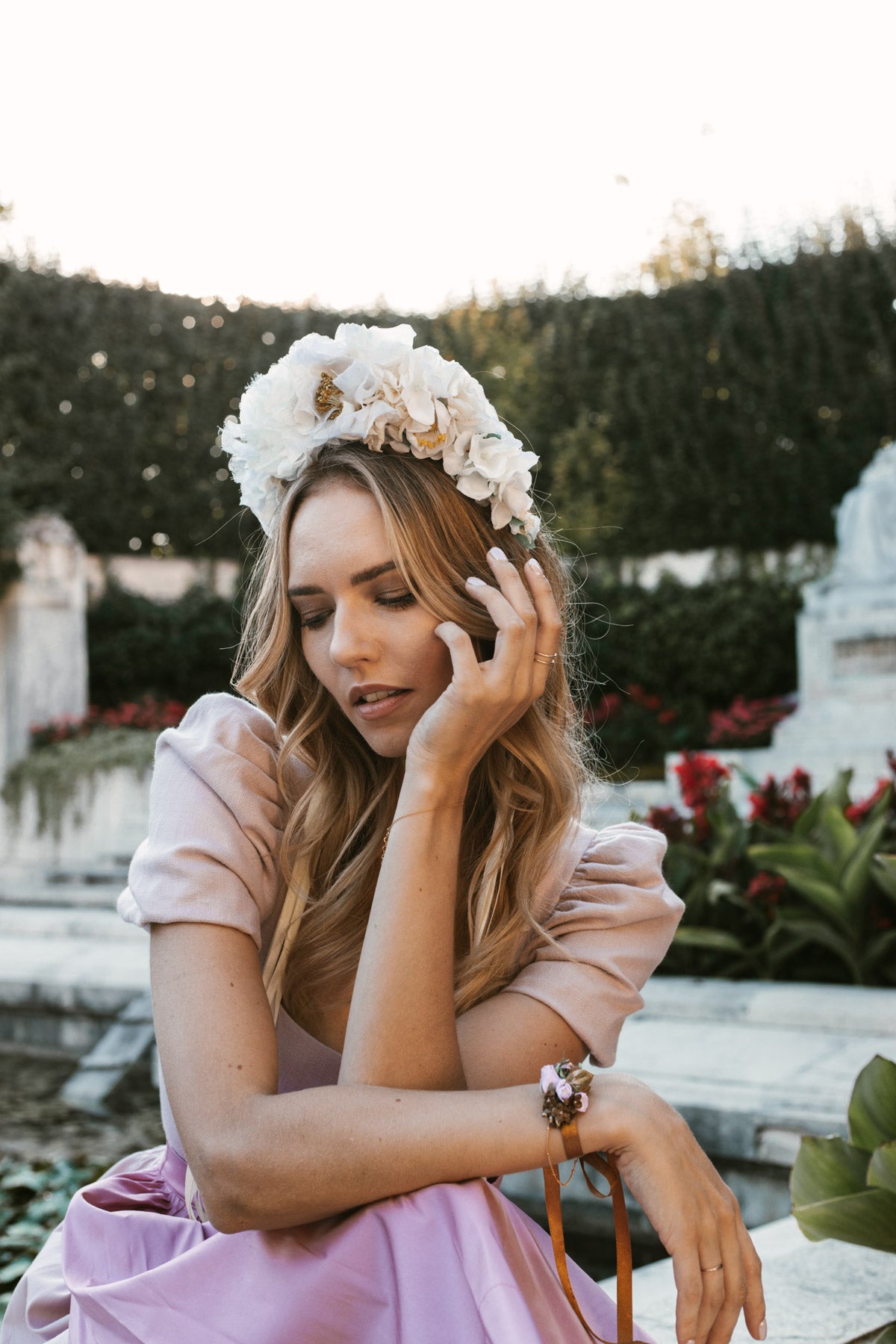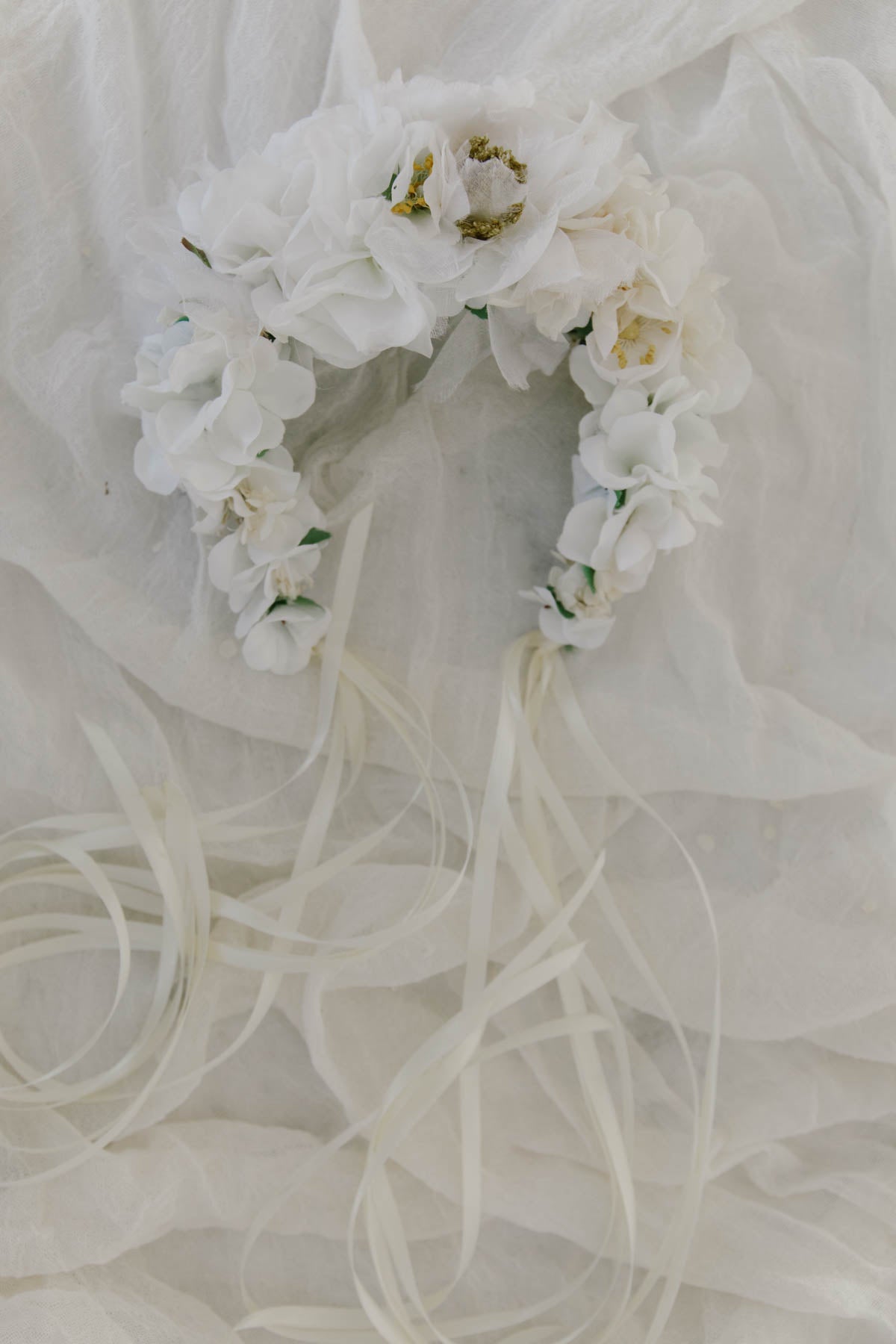 Flowercrown Aileen ist eine romantische Blumenkrone für die Ewigkeit die niemals verblüht. Handgemacht in Wien aus vintage Seidenblumen im Wiener Atelier von We Are Flowergirls. Zum Binden mit Satinbändern aus der Schweiz.