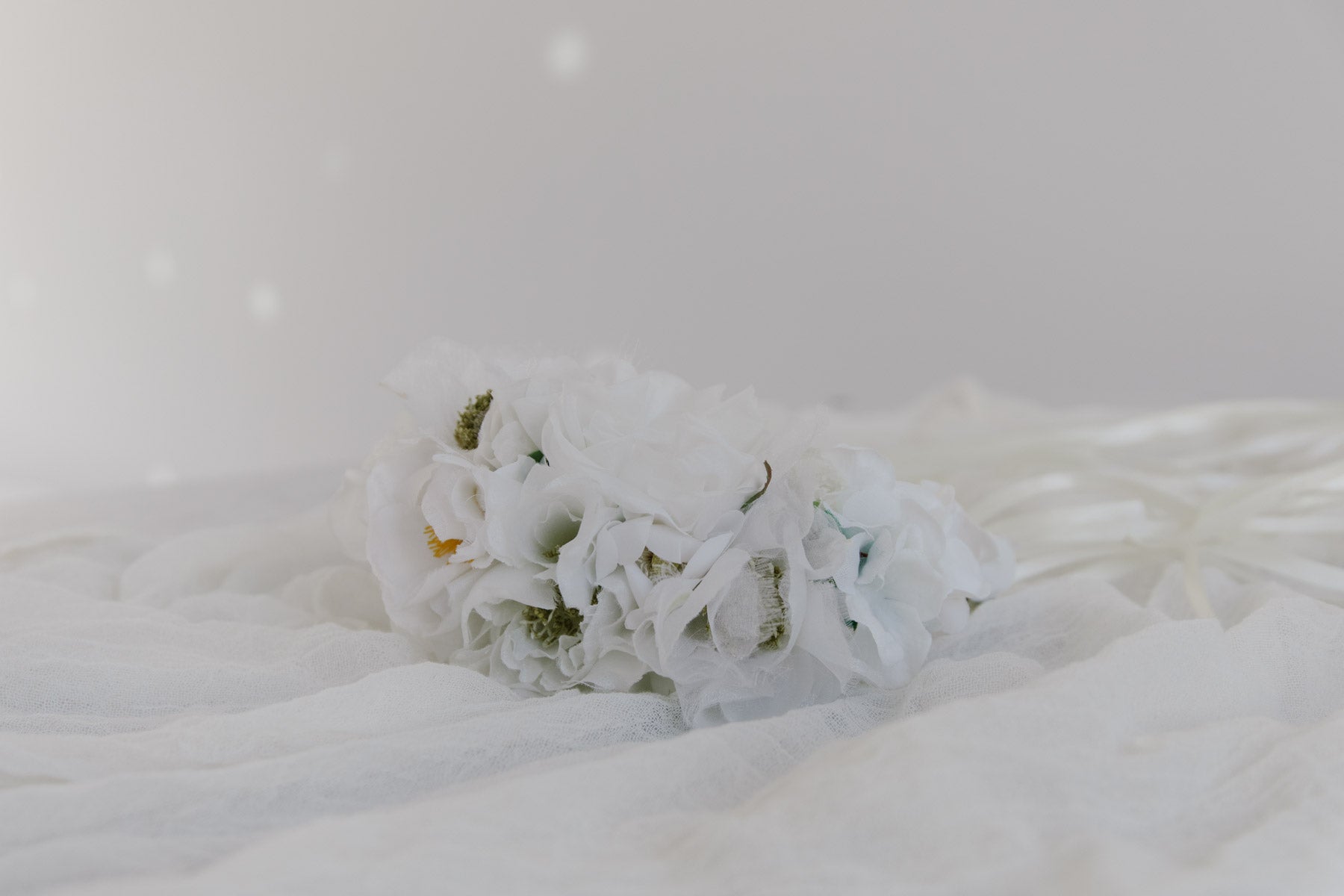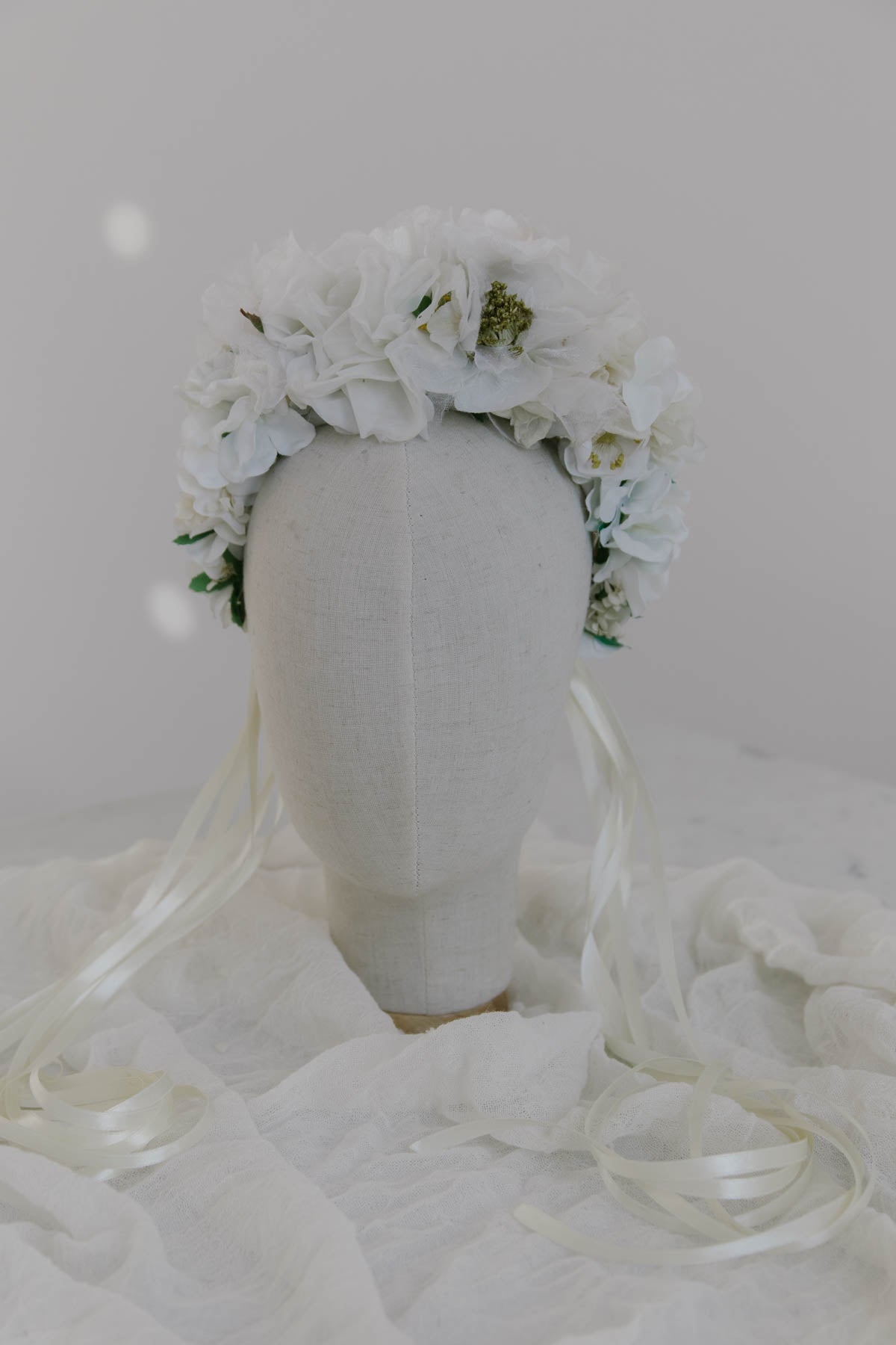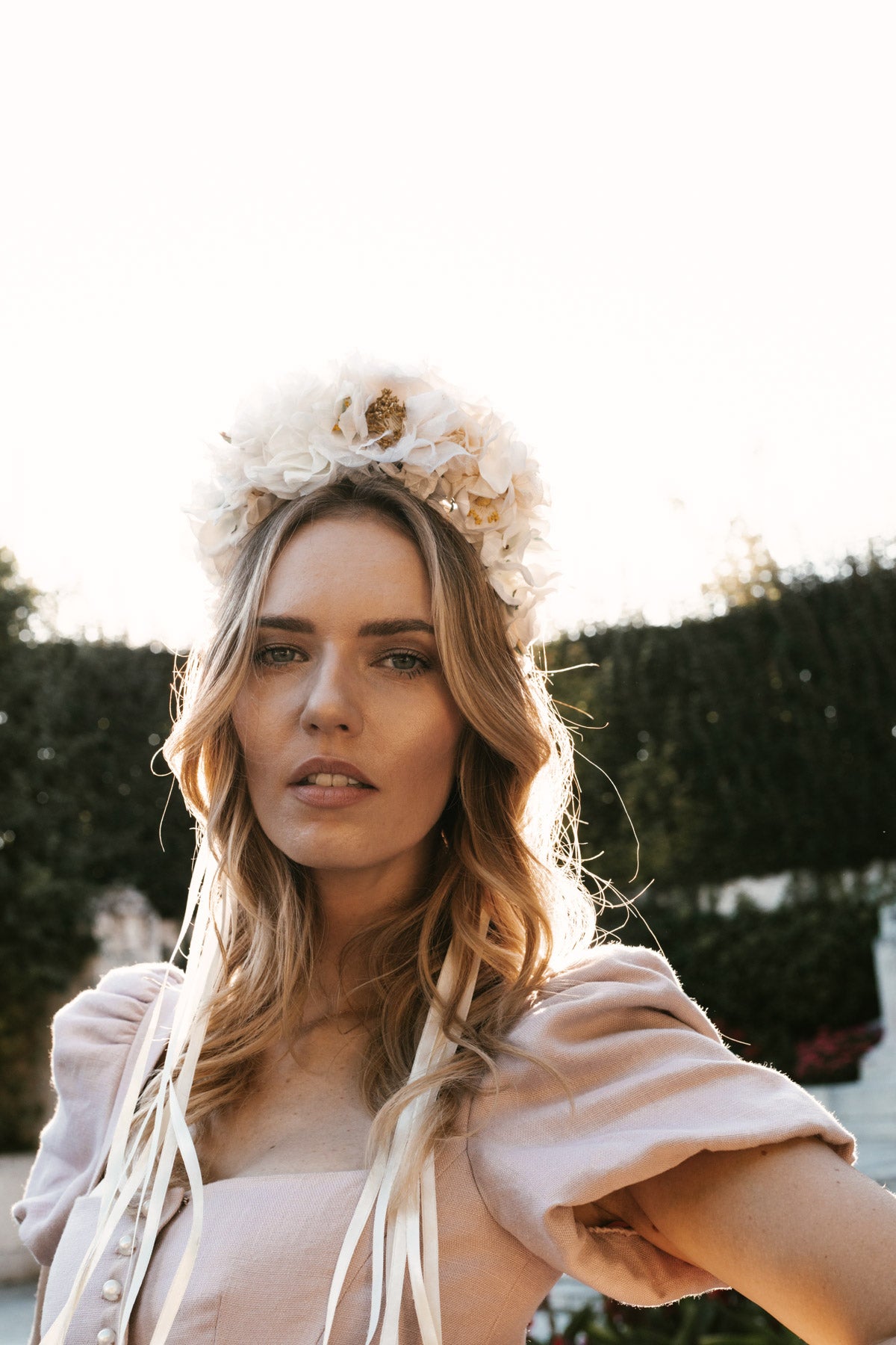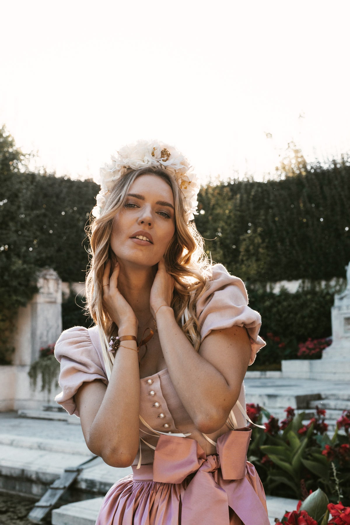 Flowercrown Aileen ist eine romantische Blumenkrone für die Ewigkeit die niemals verblüht. Handgemacht in Wien aus vintage Seidenblumen im Wiener Atelier von We Are Flowergirls. Zum Binden mit Satinbändern aus der Schweiz.
