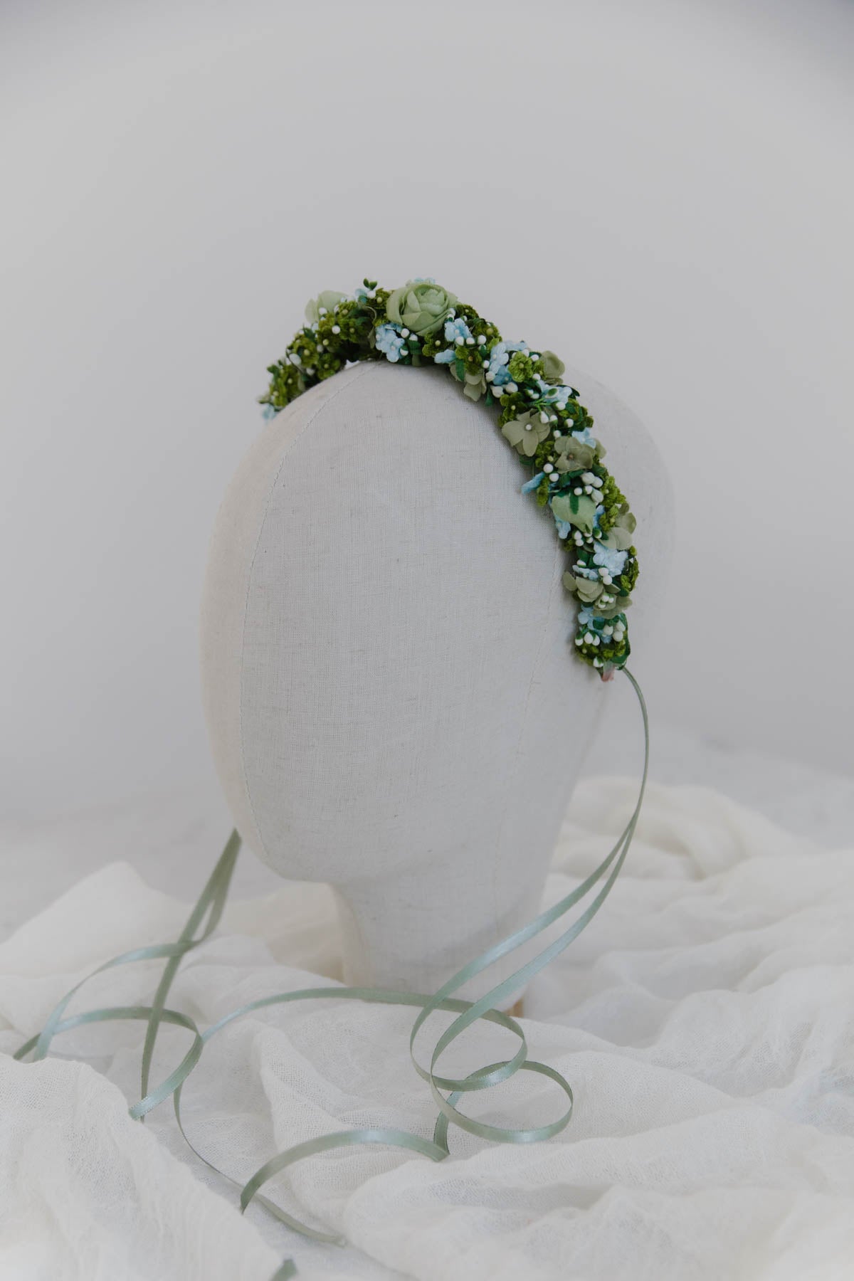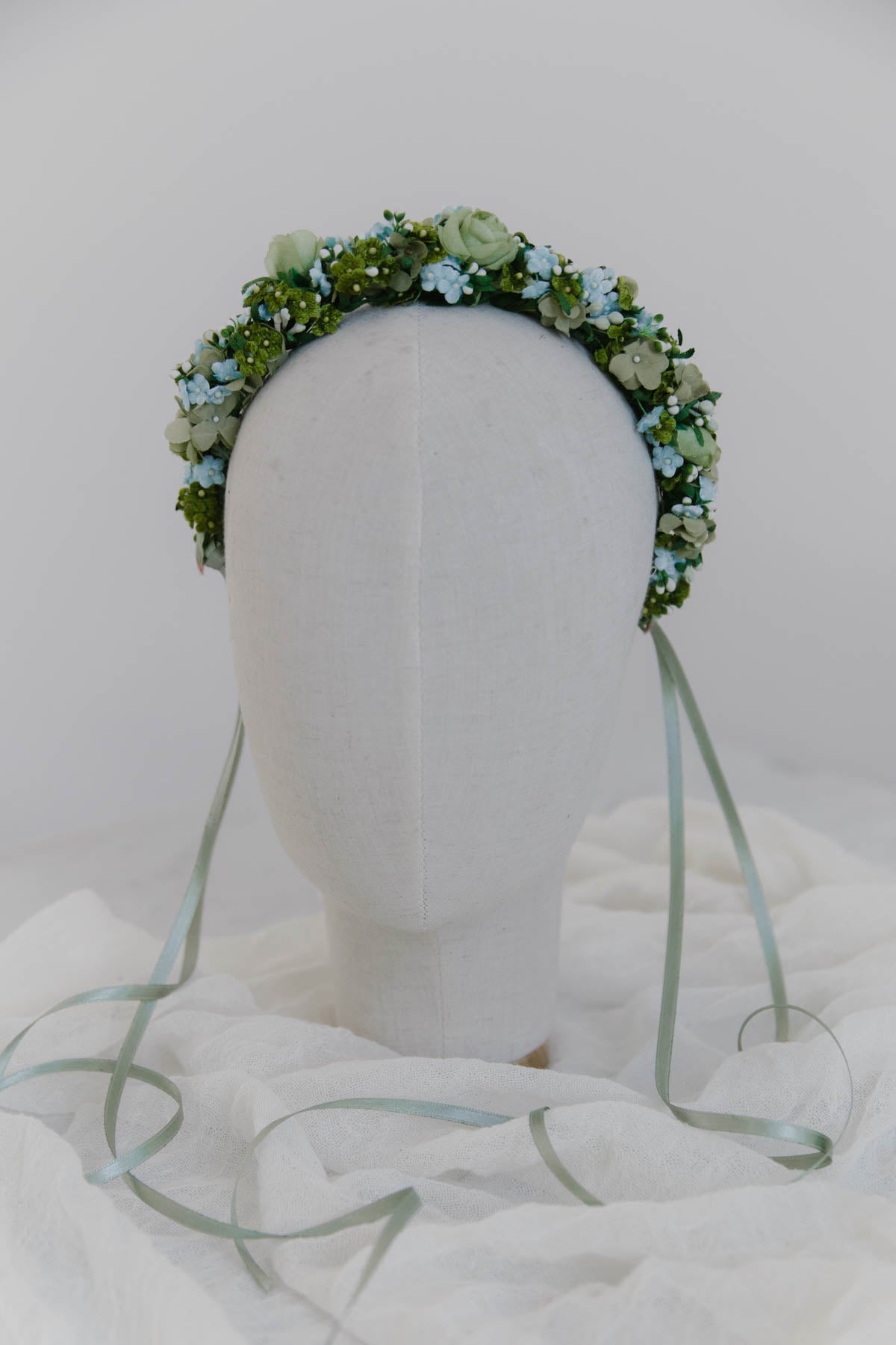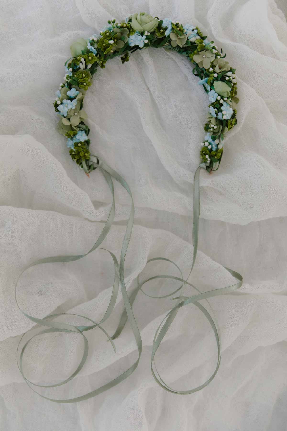 Flowercrown Anda ist eine romantische Blumenkrone für die Ewigkeit die niemals verblüht. Handgemacht in Wien aus vintage Seidenblumen im Wiener Atelier von We Are Flowergirls. Zum Binden mit Satinbändern aus der Schweiz.