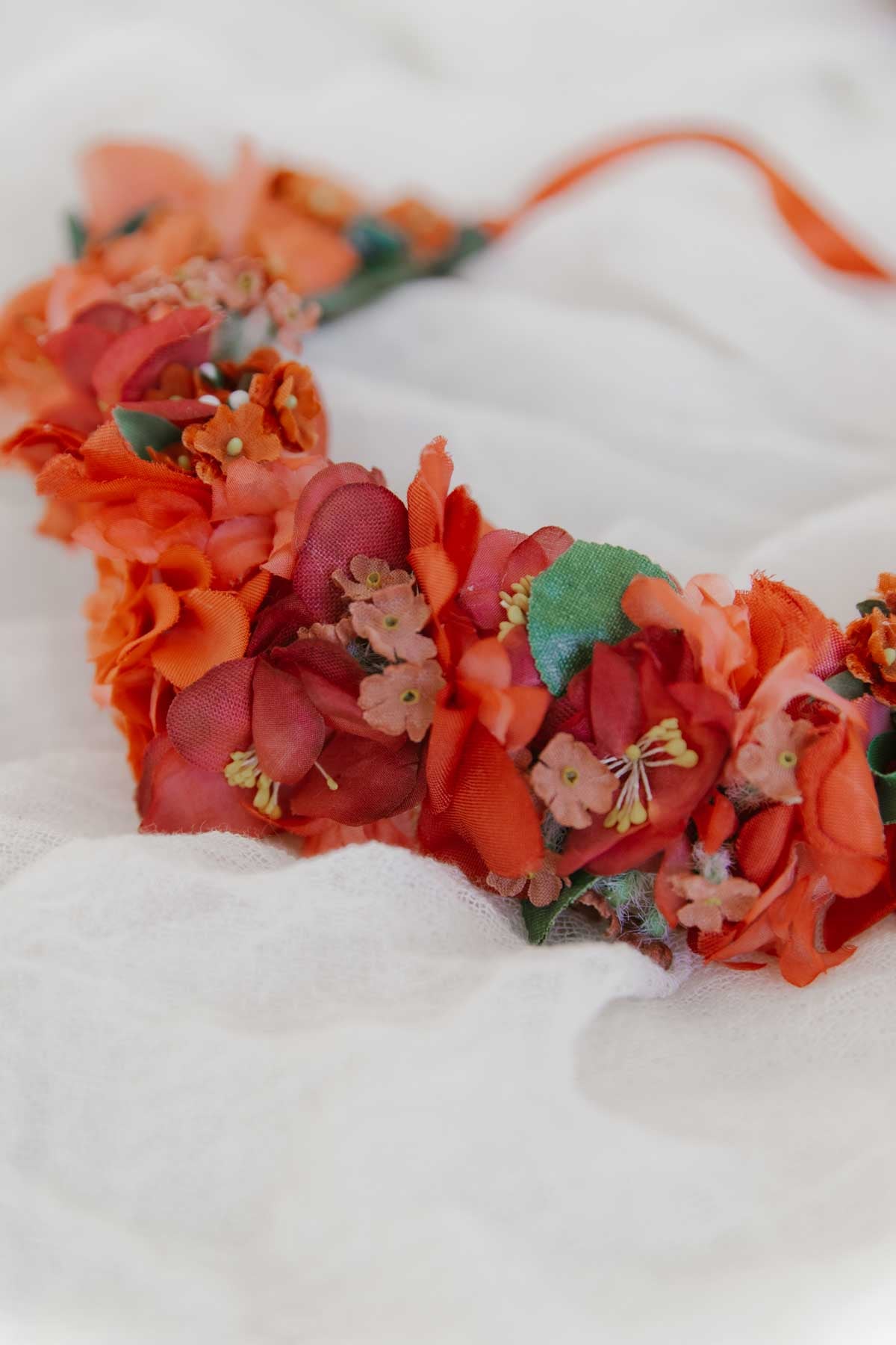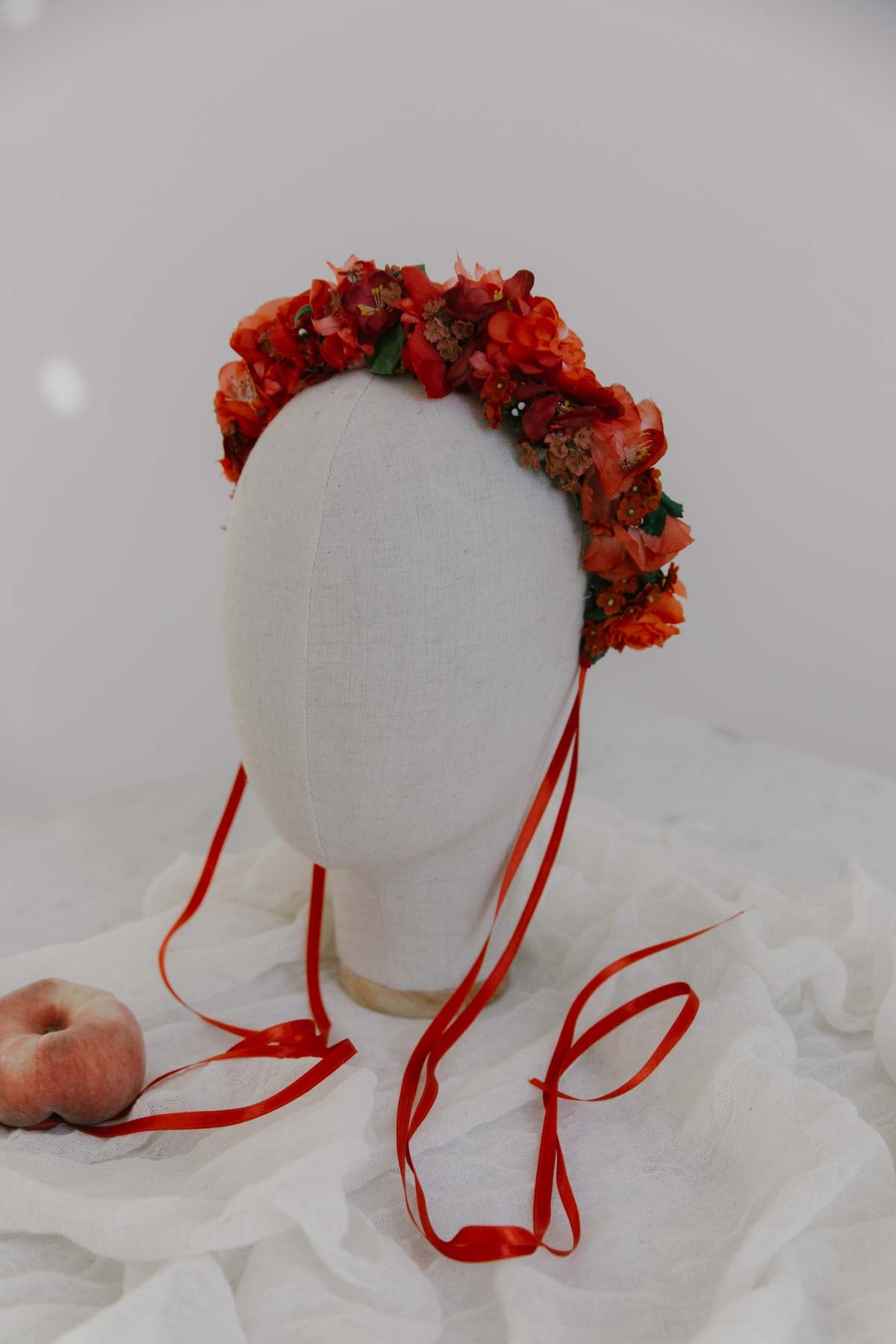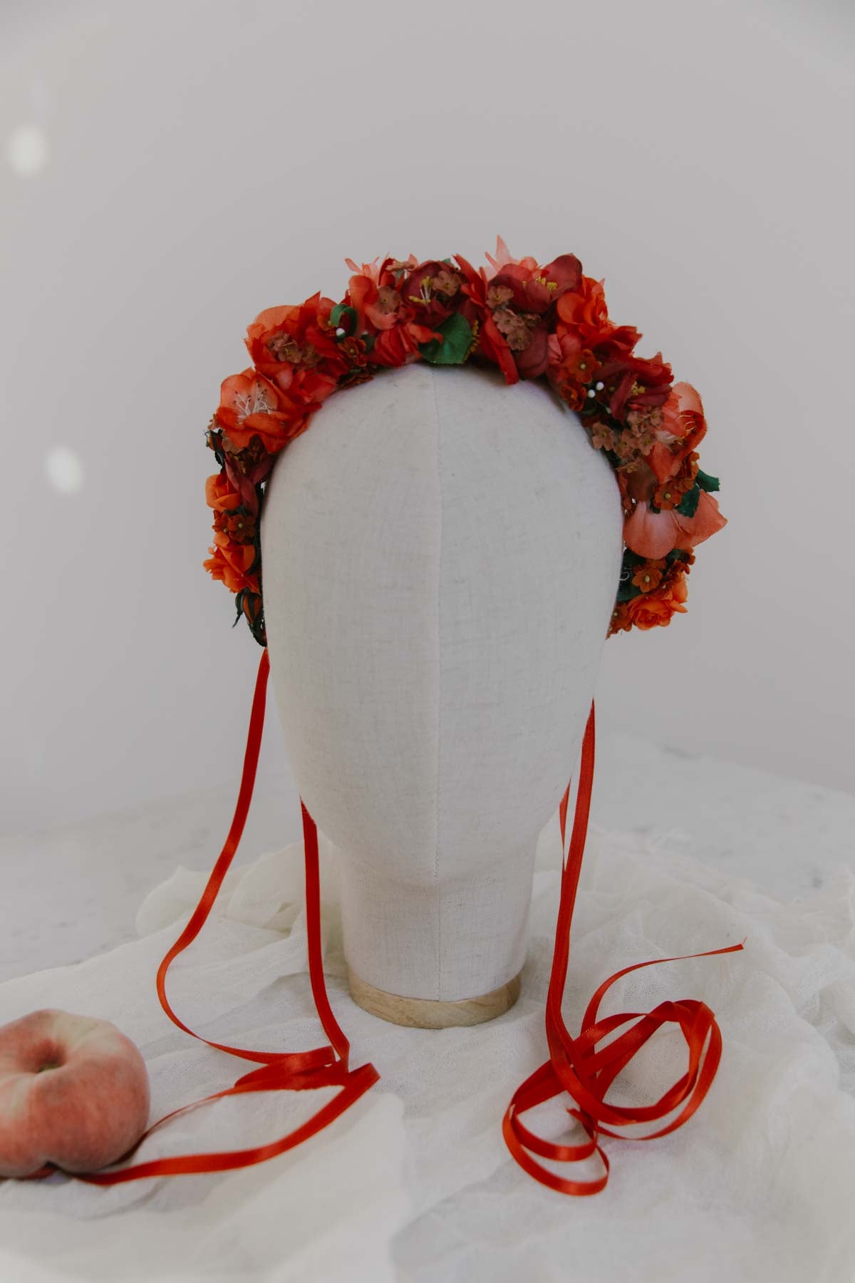Flowercrown Daria ist eine romantische Blumenkrone für die Ewigkeit die niemals verblüht. Handgemacht in Wien aus vintage Seidenblumen im Wiener Atelier von We Are Flowergirls. Zum Binden mit Satinbändern aus der Schweiz.