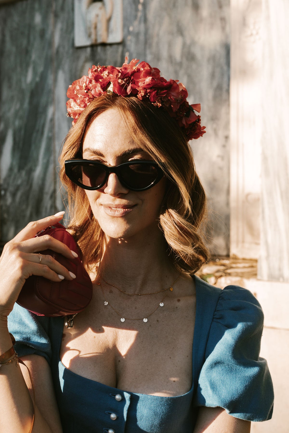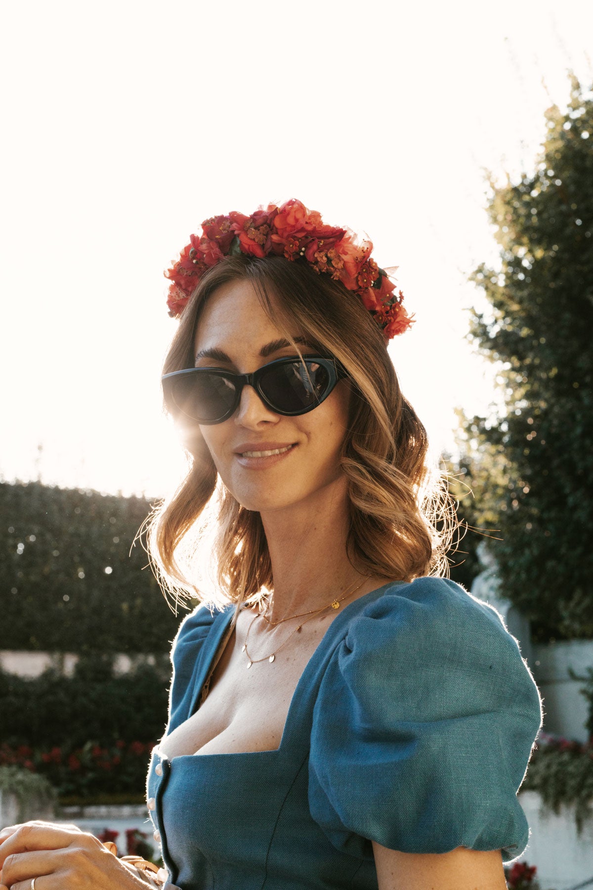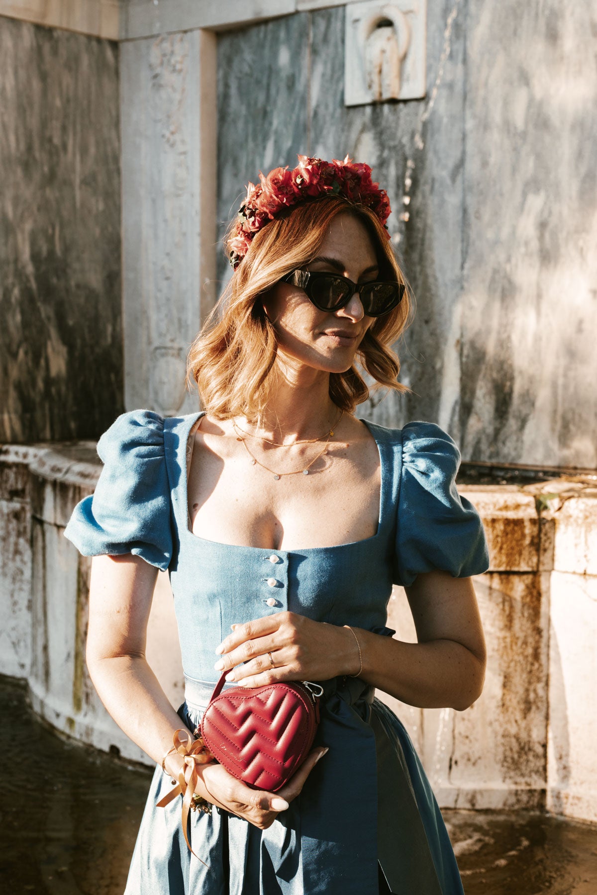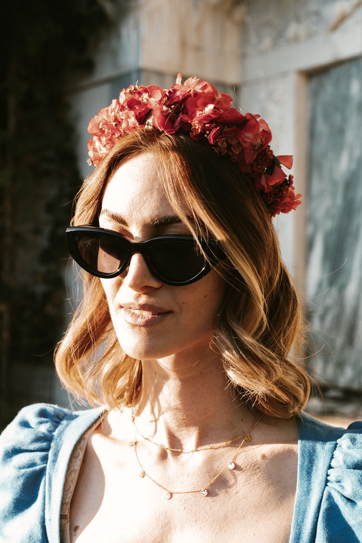 Flowercrown Daria ist eine romantische Blumenkrone für die Ewigkeit die niemals verblüht. Handgemacht in Wien aus vintage Seidenblumen im Wiener Atelier von We Are Flowergirls. Zum Binden mit Satinbändern aus der Schweiz.