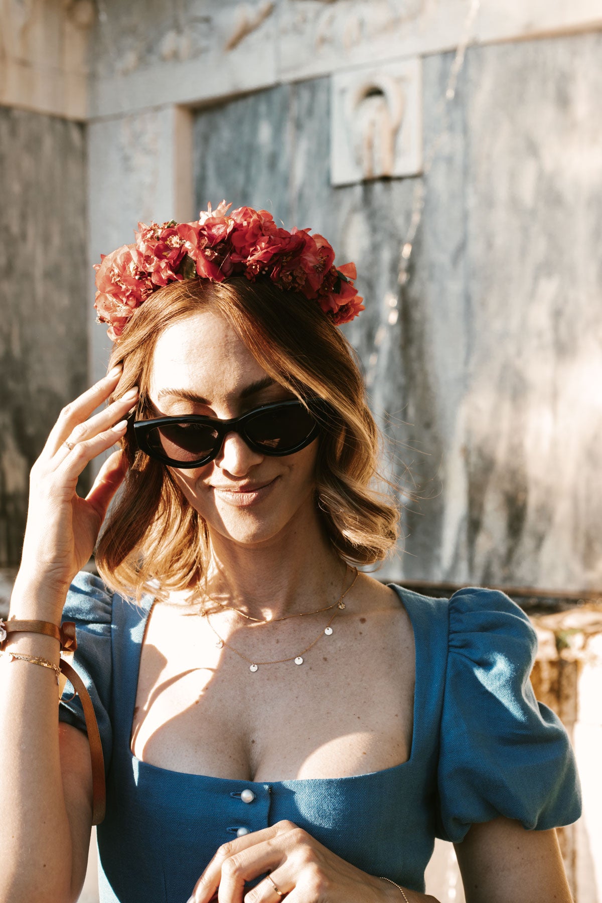 Beachte, dass unsere Designs aus hochwertigen Materialien gefertigt werden. Jedes Stück wird in unserem Wiener Atelier mit Blumen-Raritäten aus den 50ern bis 90ern per Hand gefertigt. Daher behandle dein Stück bitte mit Liebe, lege das Design nicht über länge Zeit in die Sonne und schütze es vor Nässe. So hält dein Unikat ein Leben lang und überdauert Generationen.