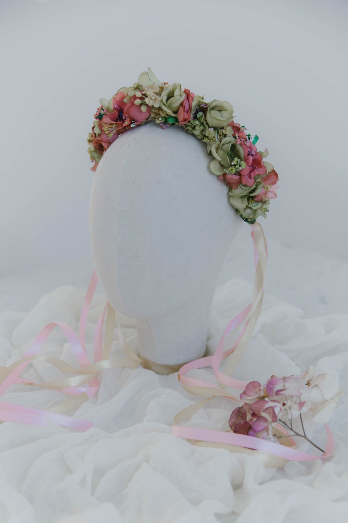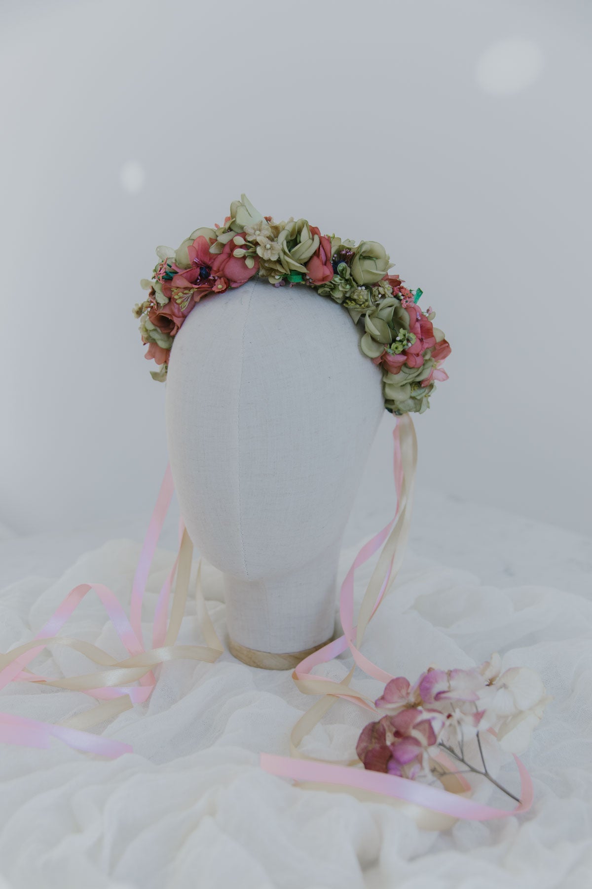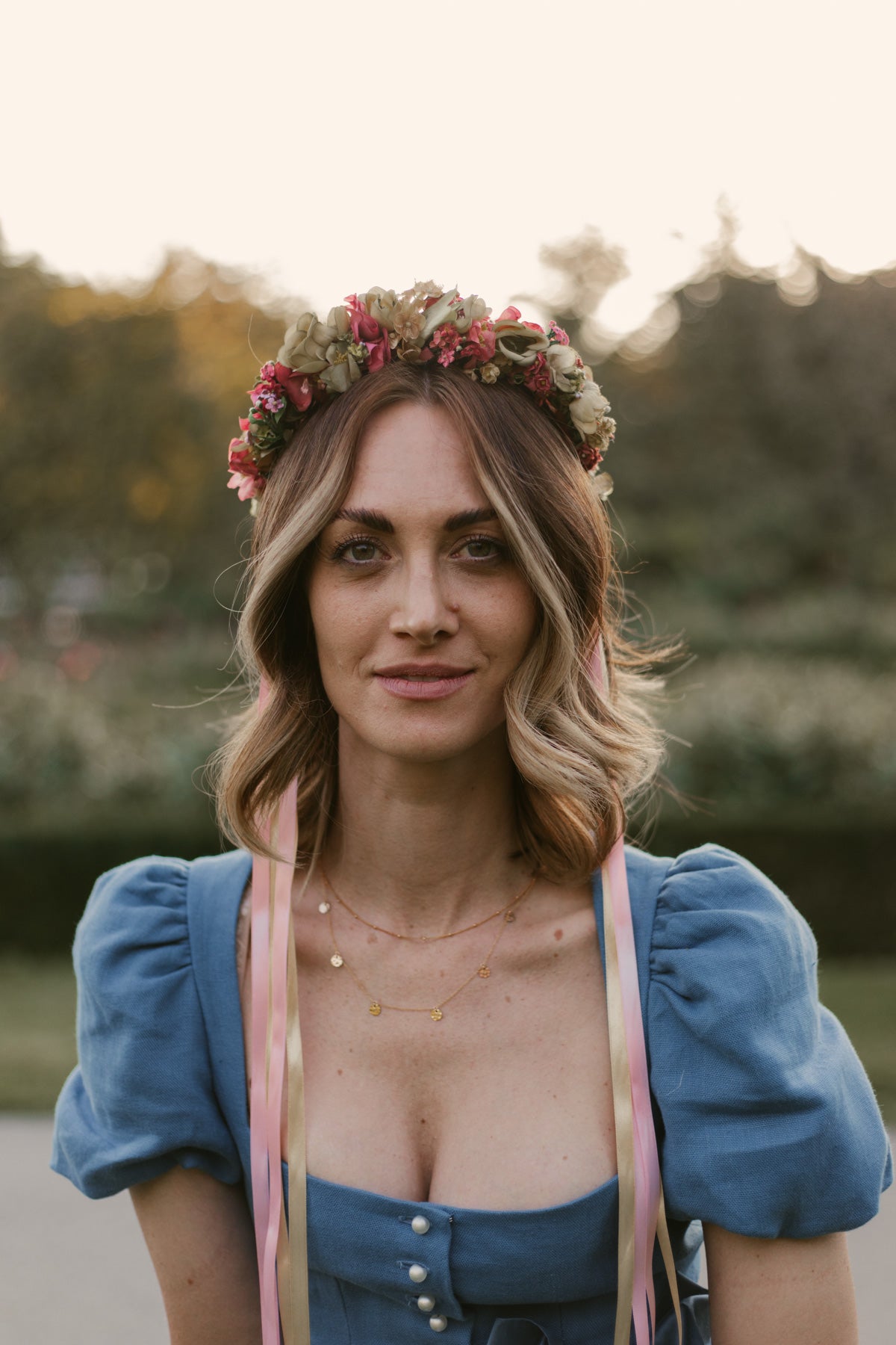 Flowercrown Delia ist eine romantische Blumenkrone für die Ewigkeit die niemals verblüht. Handgemacht in Wien aus vintage Seidenblumen im Wiener Atelier von We Are Flowergirls. Zum Binden mit Satinbändern aus der Schweiz.