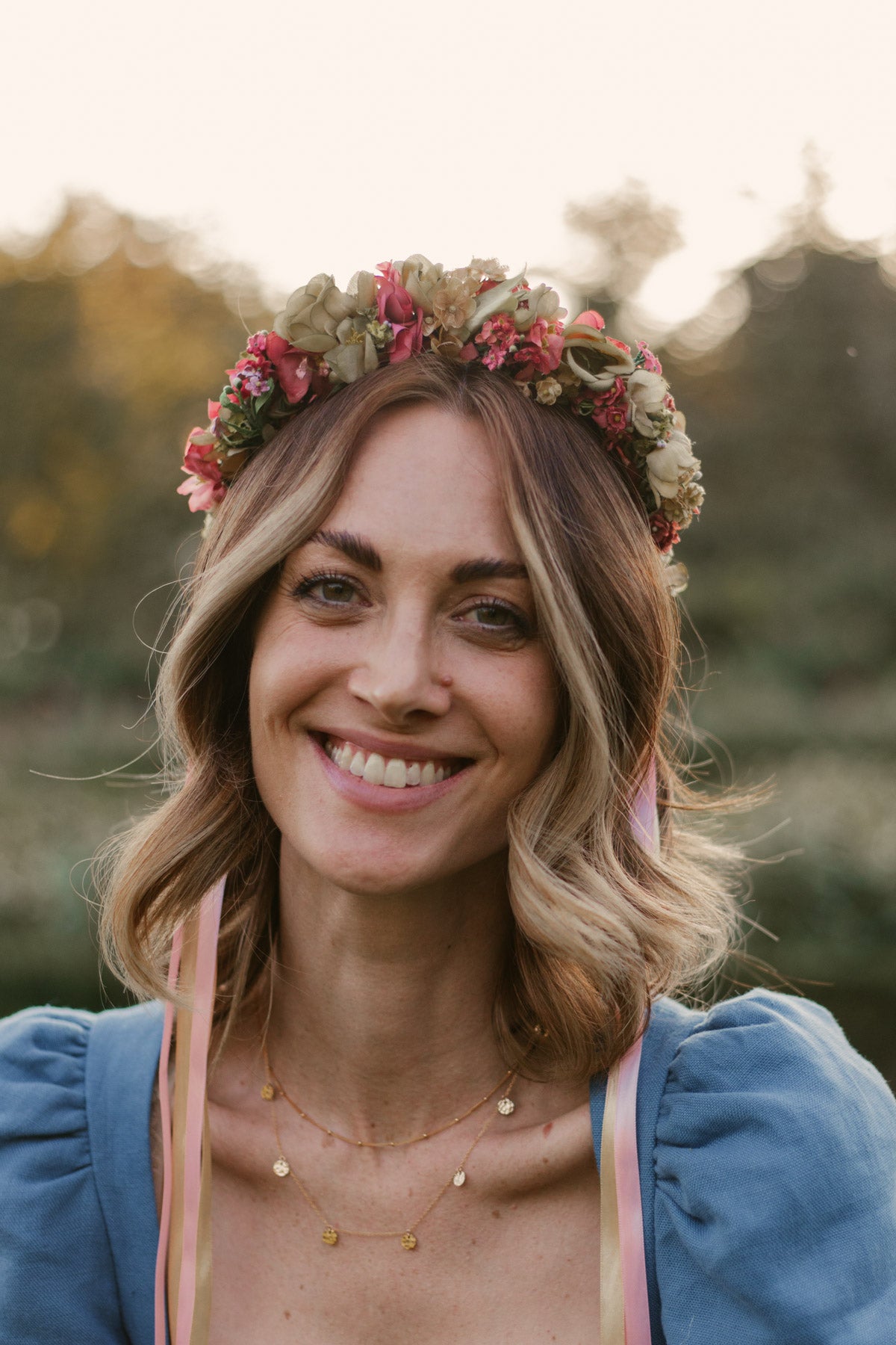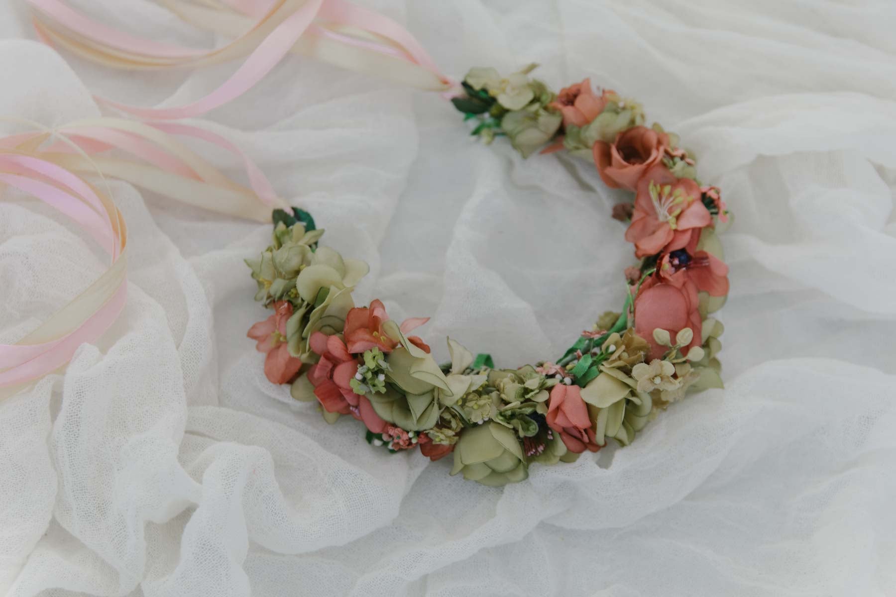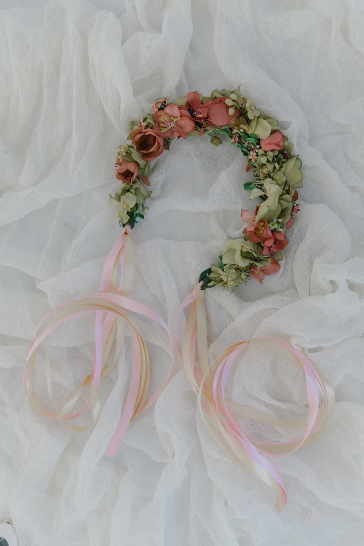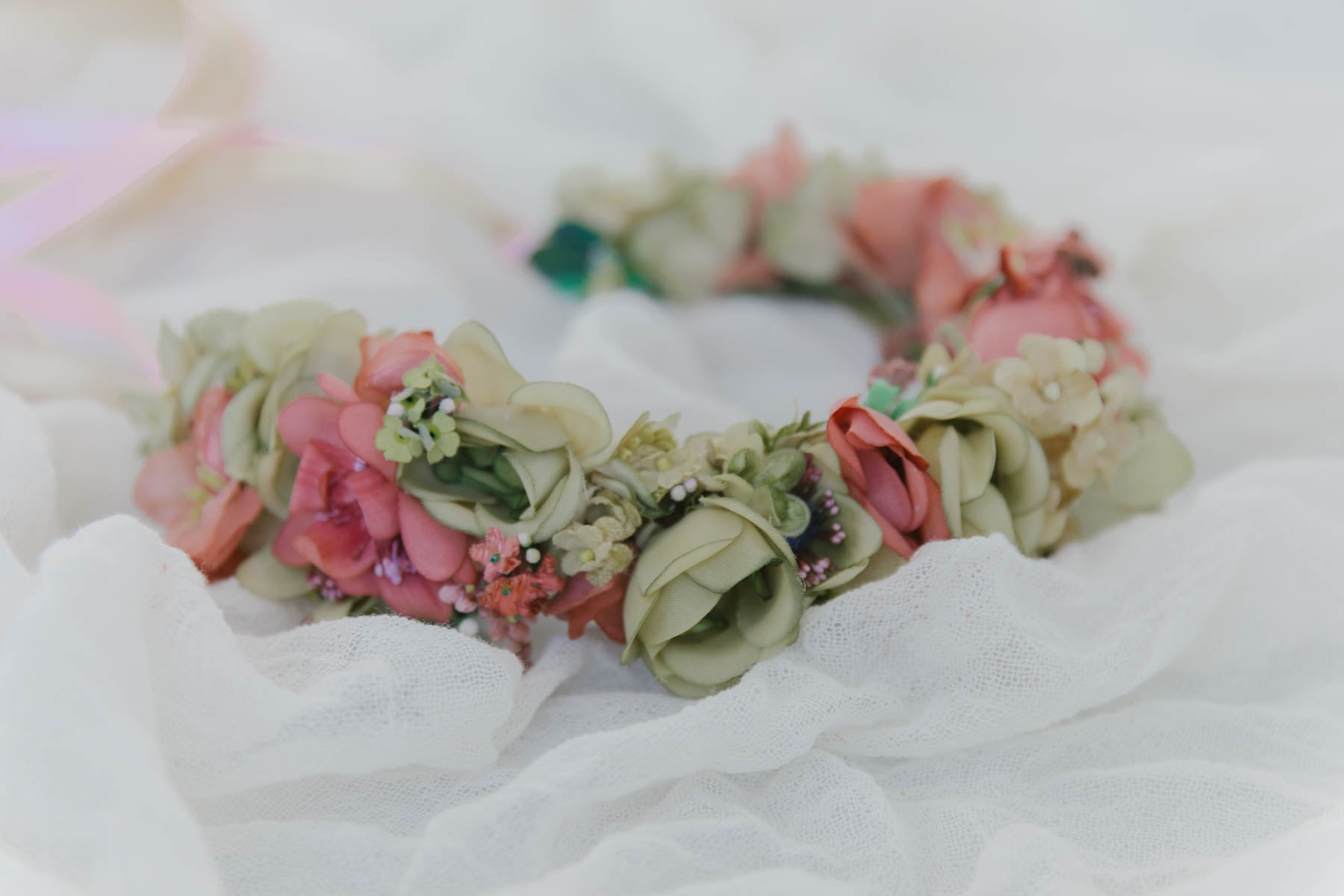 Flowercrown Delia ist eine romantische Blumenkrone für die Ewigkeit die niemals verblüht. Handgemacht in Wien aus vintage Seidenblumen im Wiener Atelier von We Are Flowergirls. Zum Binden mit Satinbändern aus der Schweiz.