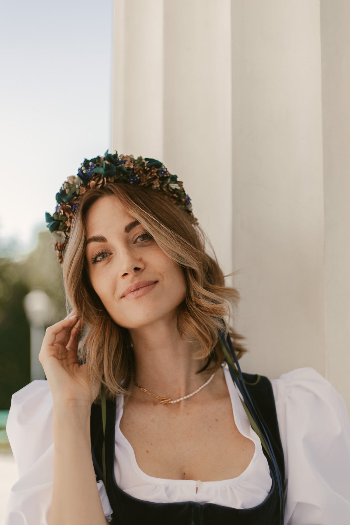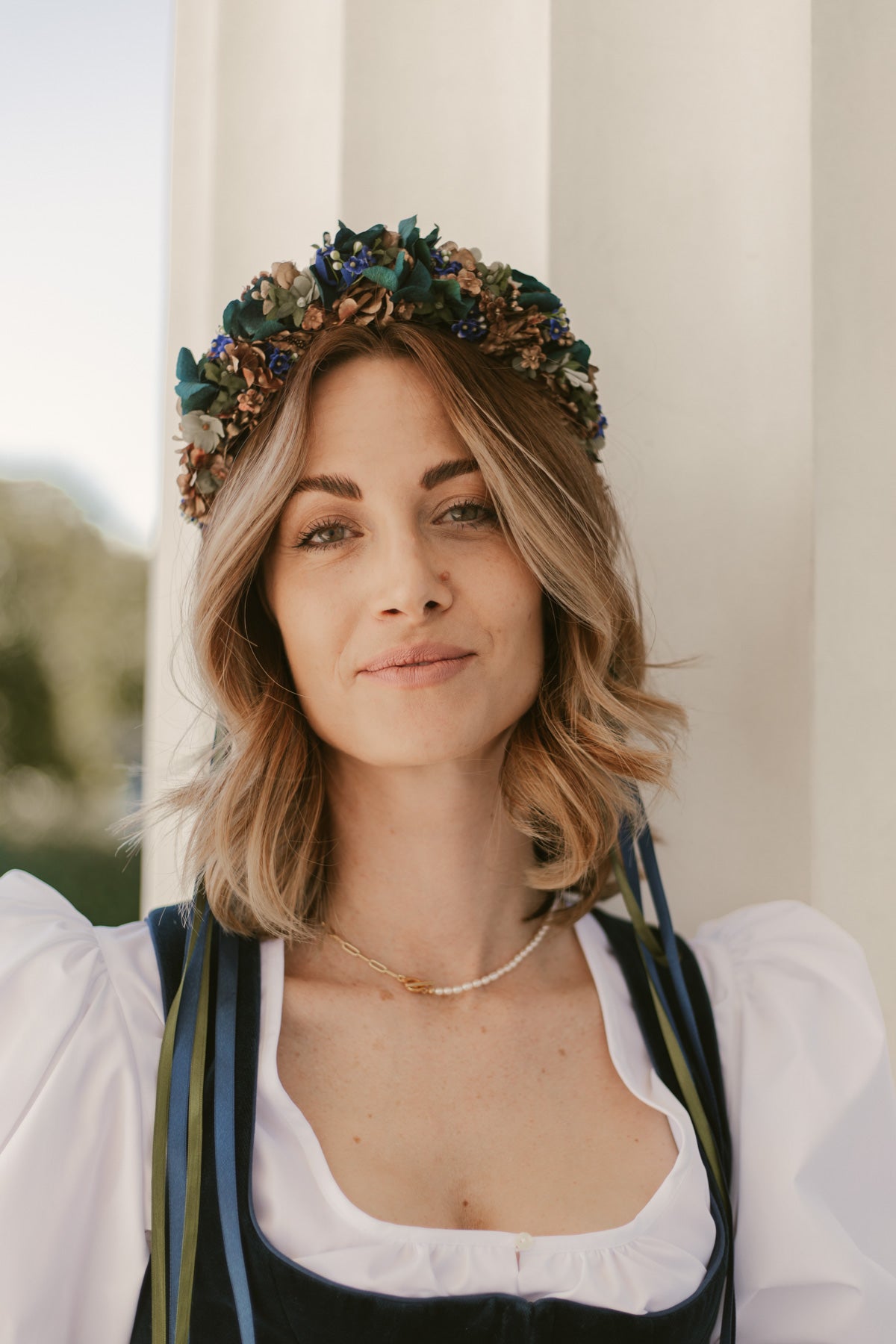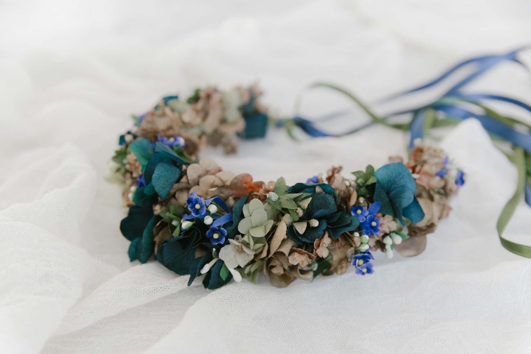 Flowercrown Eireen ist eine romantische Blumenkrone für die Ewigkeit die niemals verblüht. Handgemacht in Wien aus vintage Seidenblumen im Wiener Atelier von We Are Flowergirls. Zum Binden mit Satinbändern aus der Schweiz.