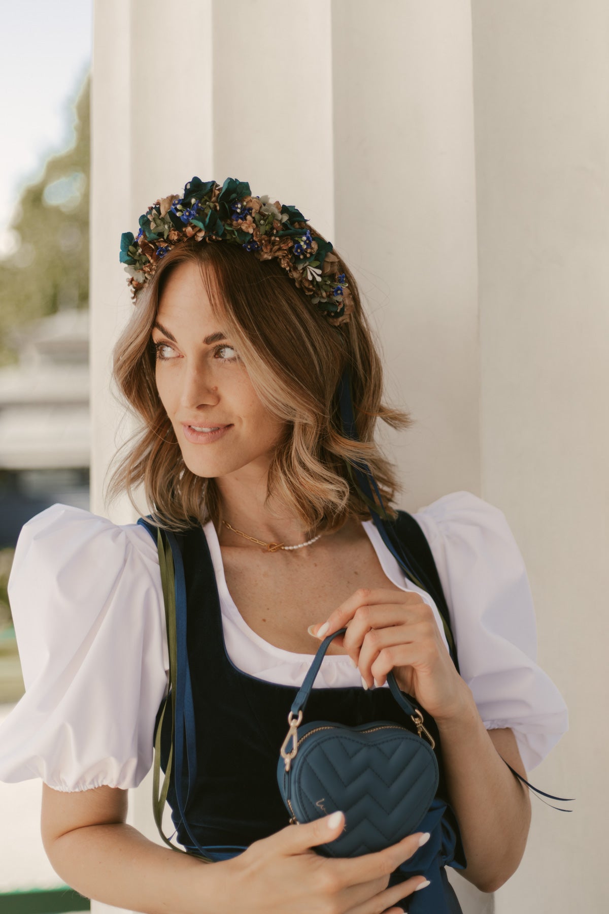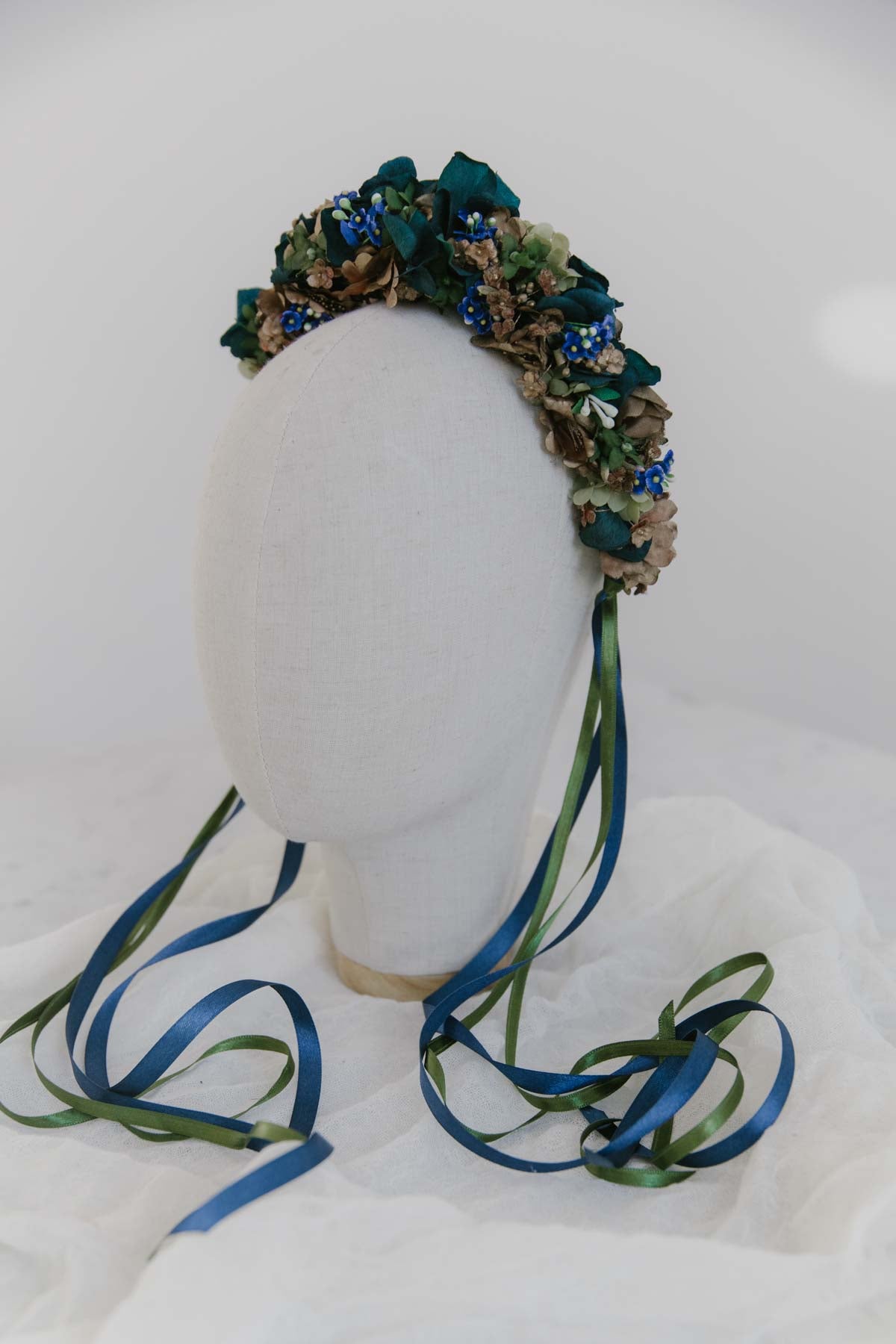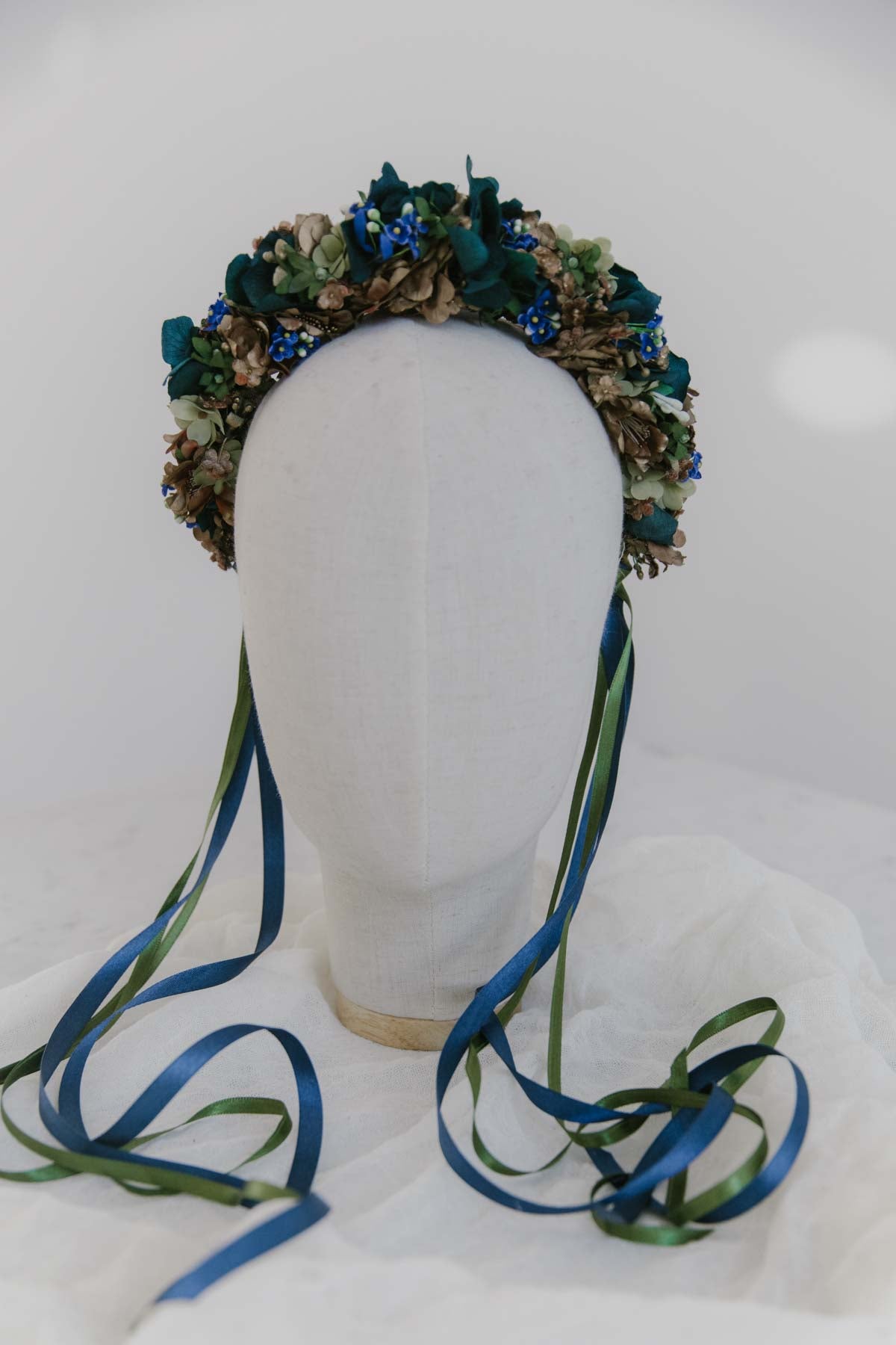 Flowercrown Eireen ist eine romantische Blumenkrone für die Ewigkeit die niemals verblüht. Handgemacht in Wien aus vintage Seidenblumen im Wiener Atelier von We Are Flowergirls. Zum Binden mit Satinbändern aus der Schweiz.