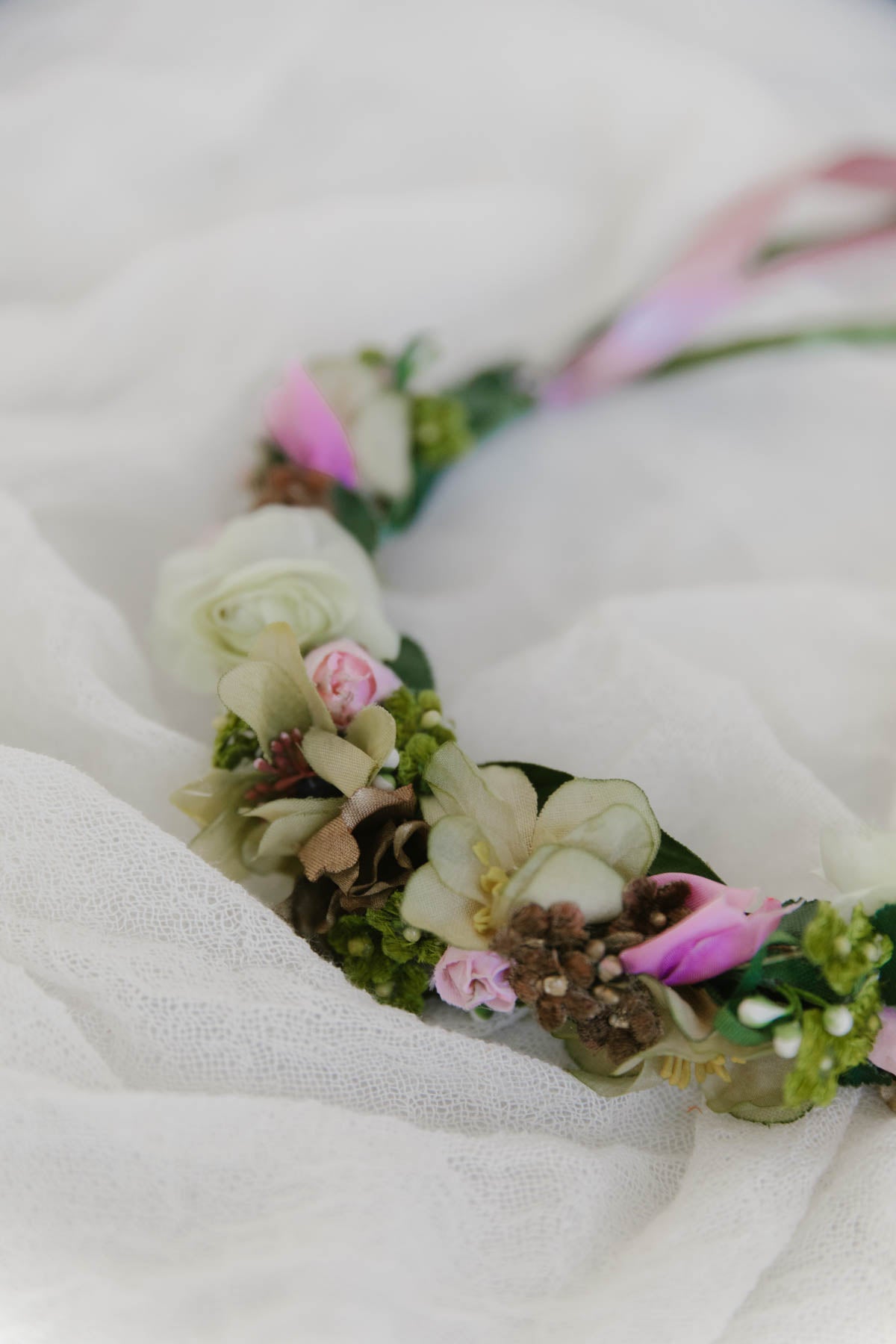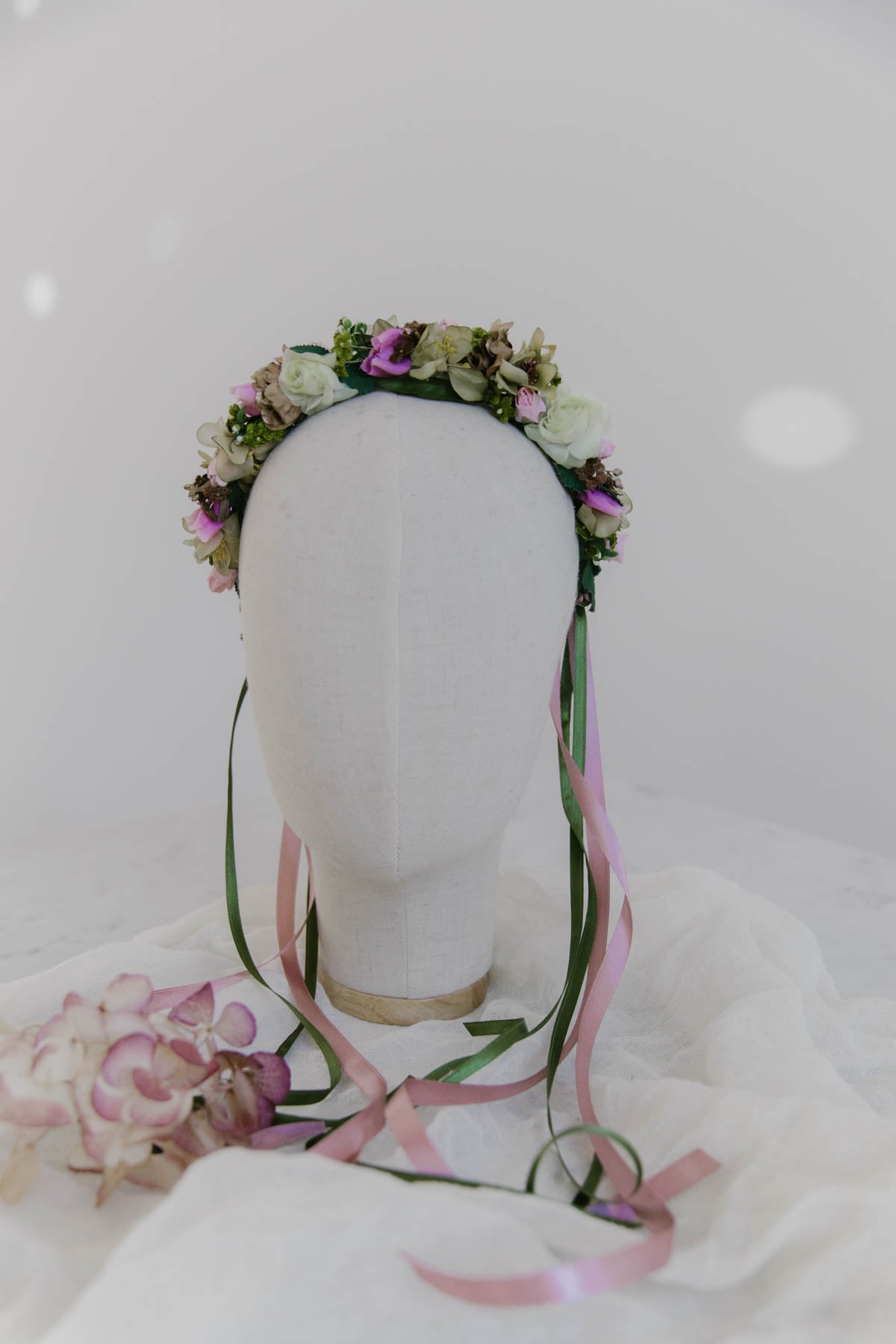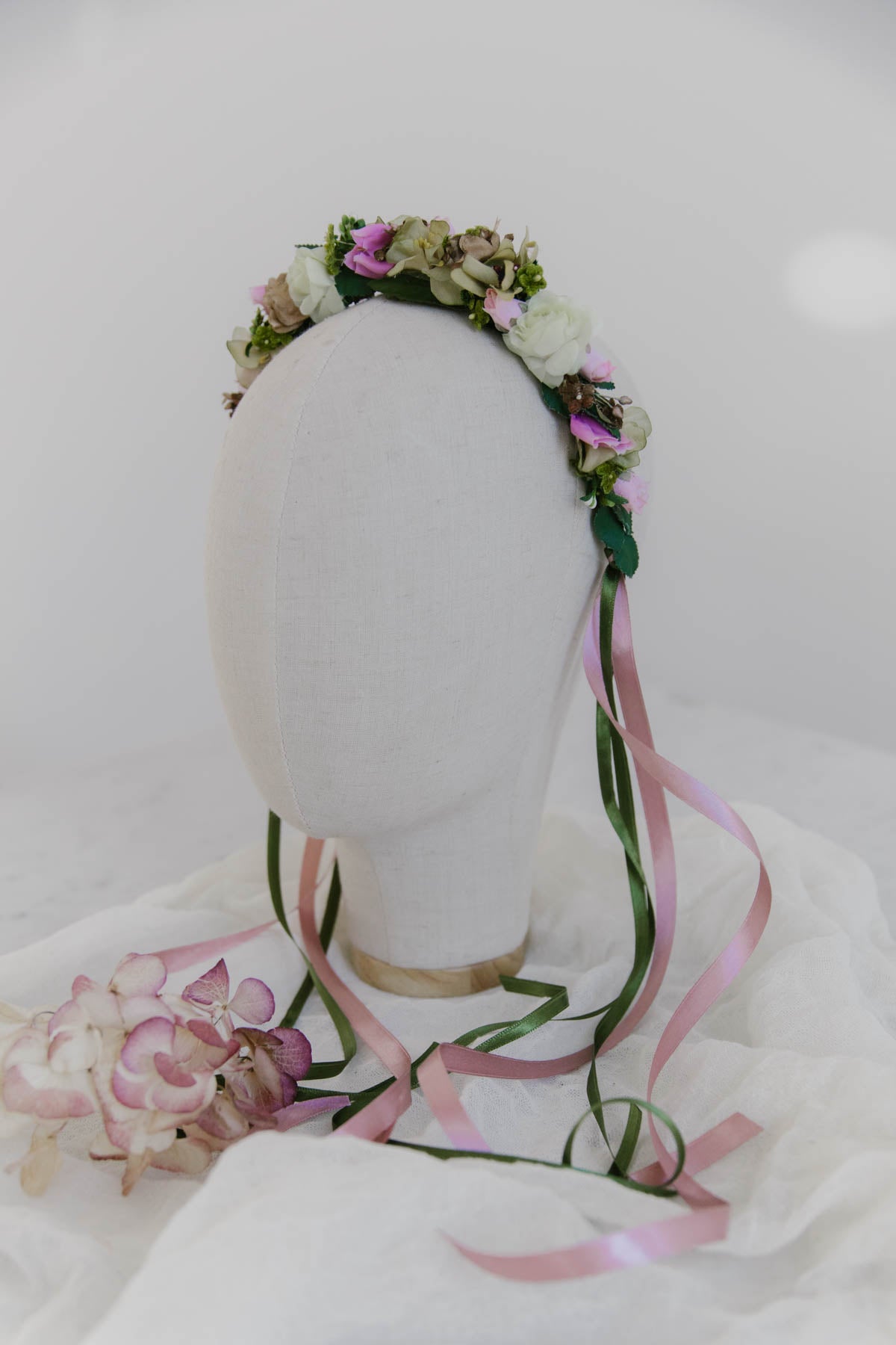 Flowercrown Fiora ist eine romantische Blumenkrone für die Ewigkeit die niemals verblüht. Handgemacht in Wien aus vintage Seidenblumen im Wiener Atelier von We Are Flowergirls. Zum Binden mit Satinbändern aus der Schweiz.
