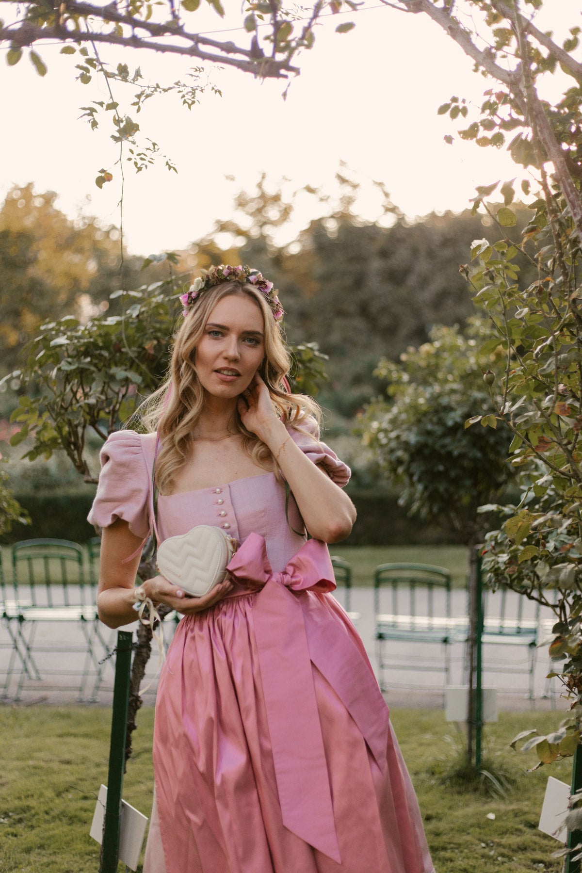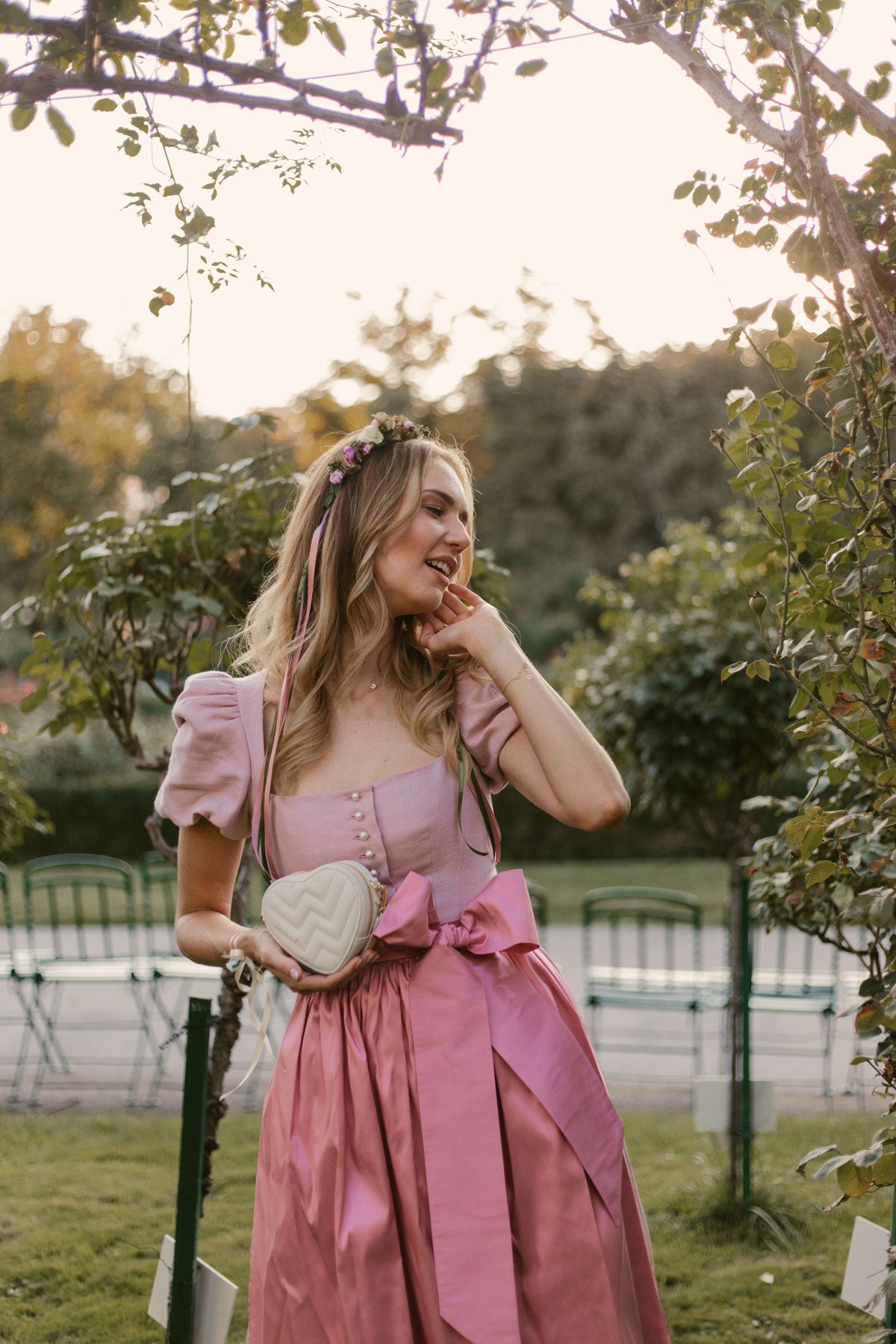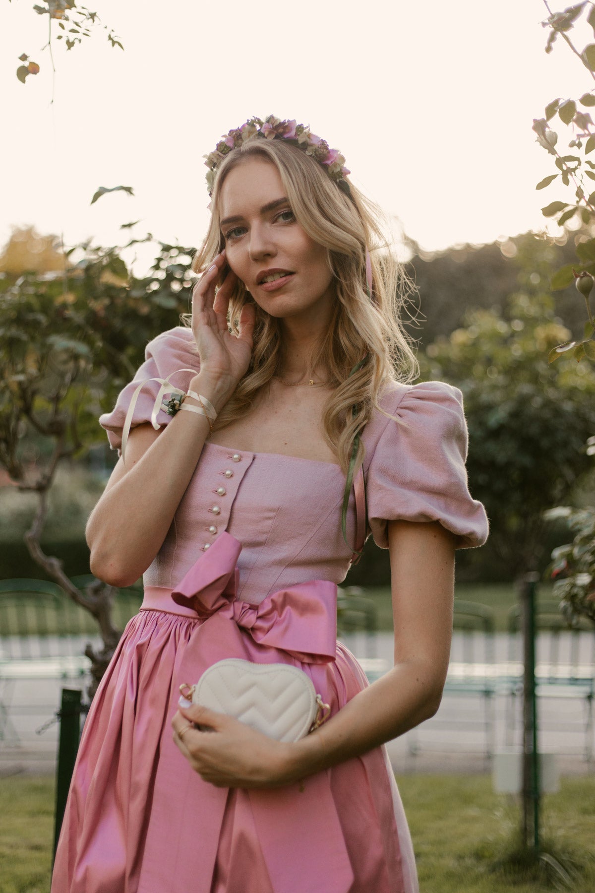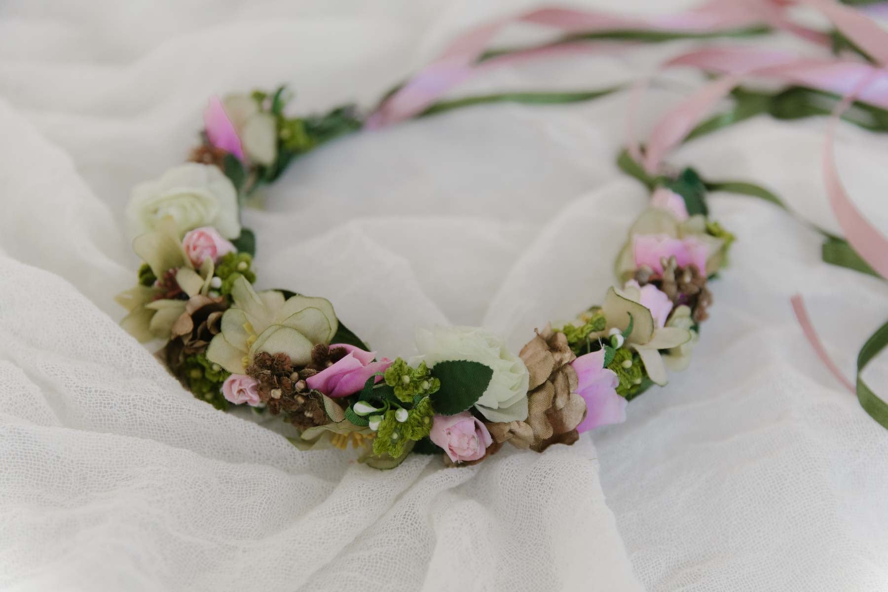 Flowercrown Fiora ist eine romantische Blumenkrone für die Ewigkeit die niemals verblüht. Handgemacht in Wien aus vintage Seidenblumen im Wiener Atelier von We Are Flowergirls. Zum Binden mit Satinbändern aus der Schweiz.
