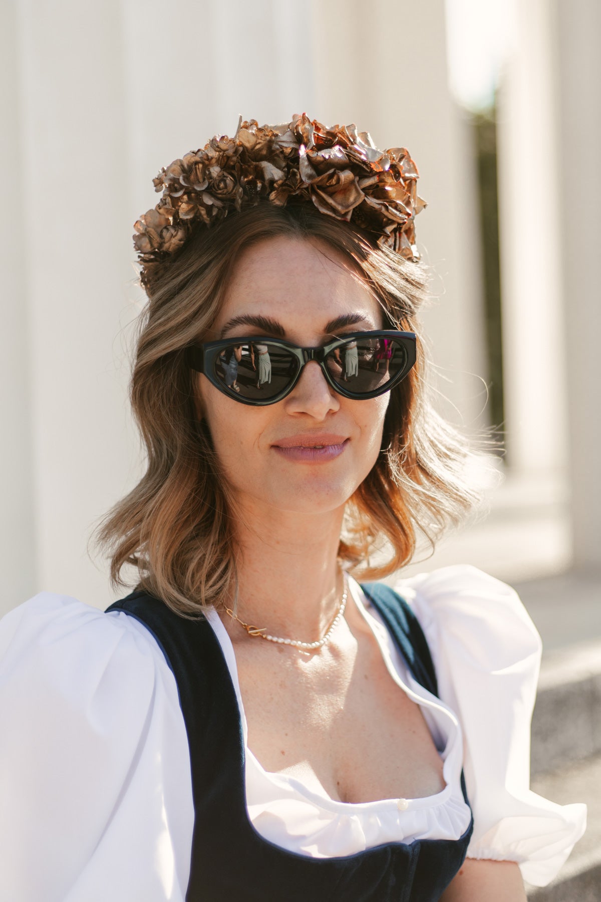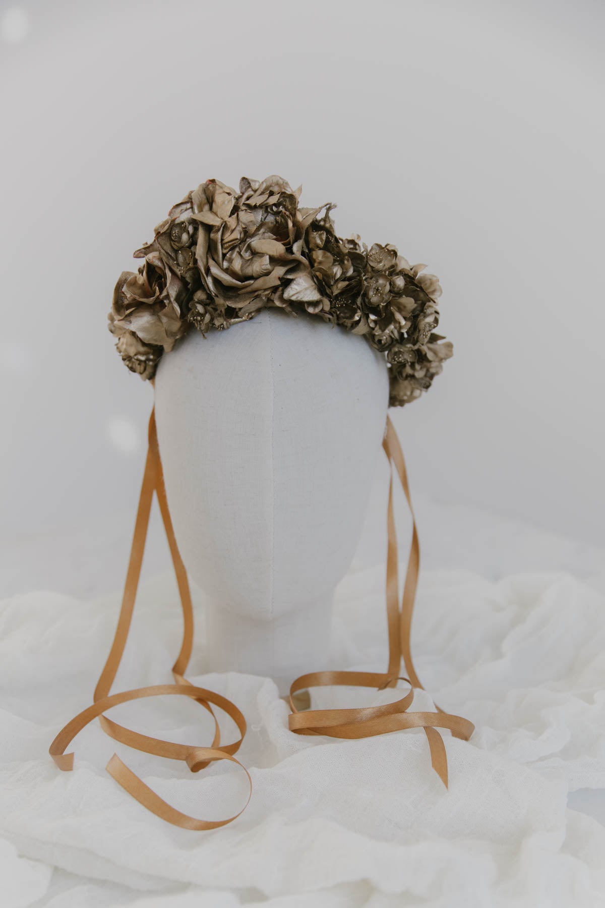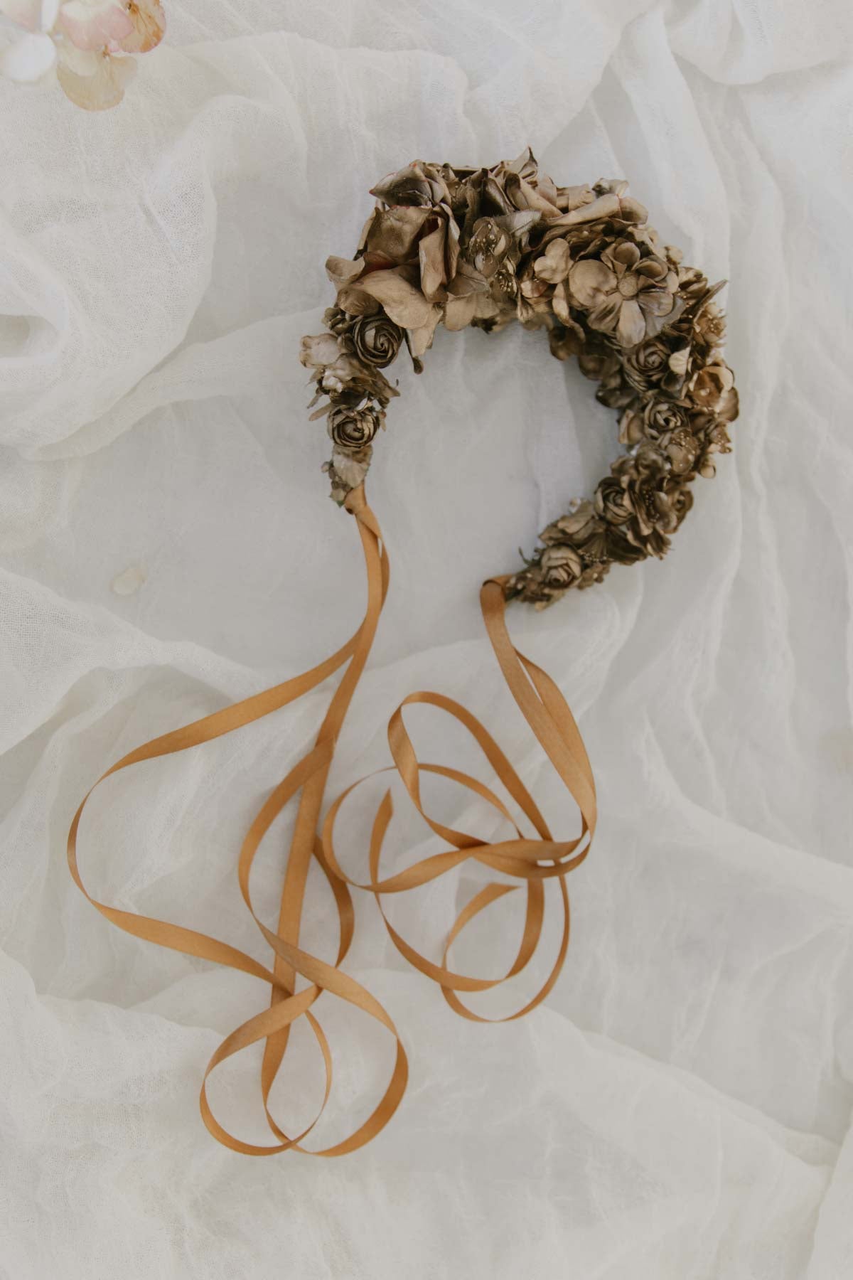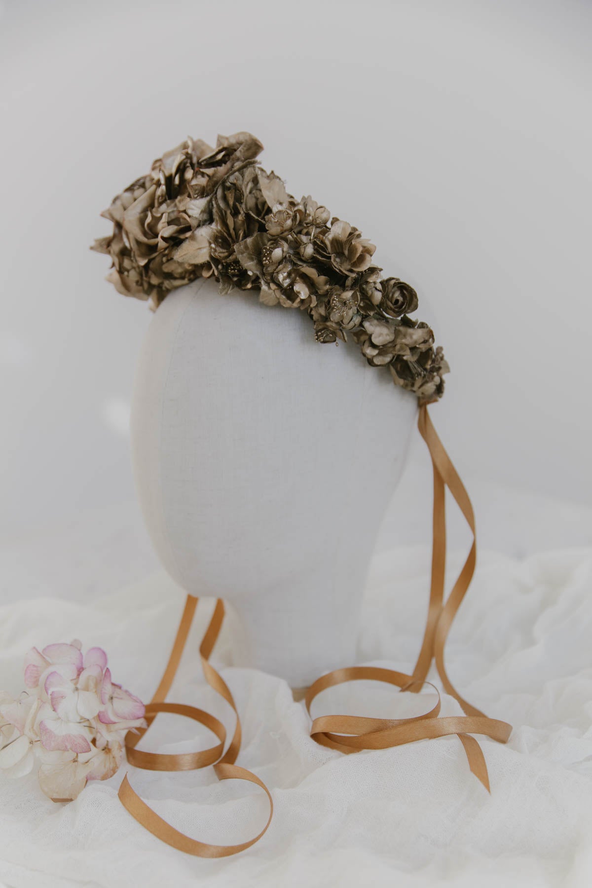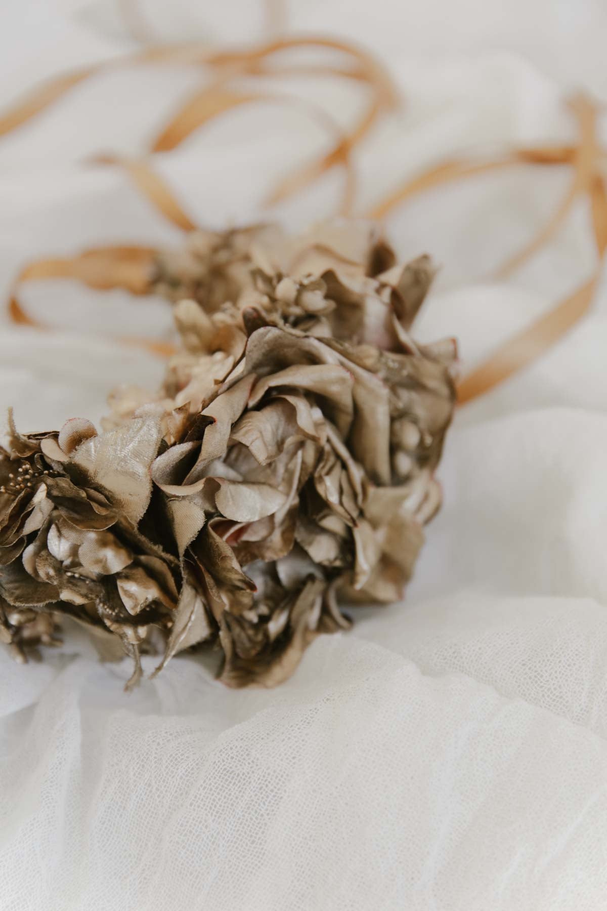 Flowercrown Golden Flowers ist eine romantische Blumenkrone für die Ewigkeit die niemals verblüht. Handgemacht in Wien aus vintage Seidenblumen im Wiener Atelier von We Are Flowergirls. Zum Binden mit Satinbändern aus der Schweiz.